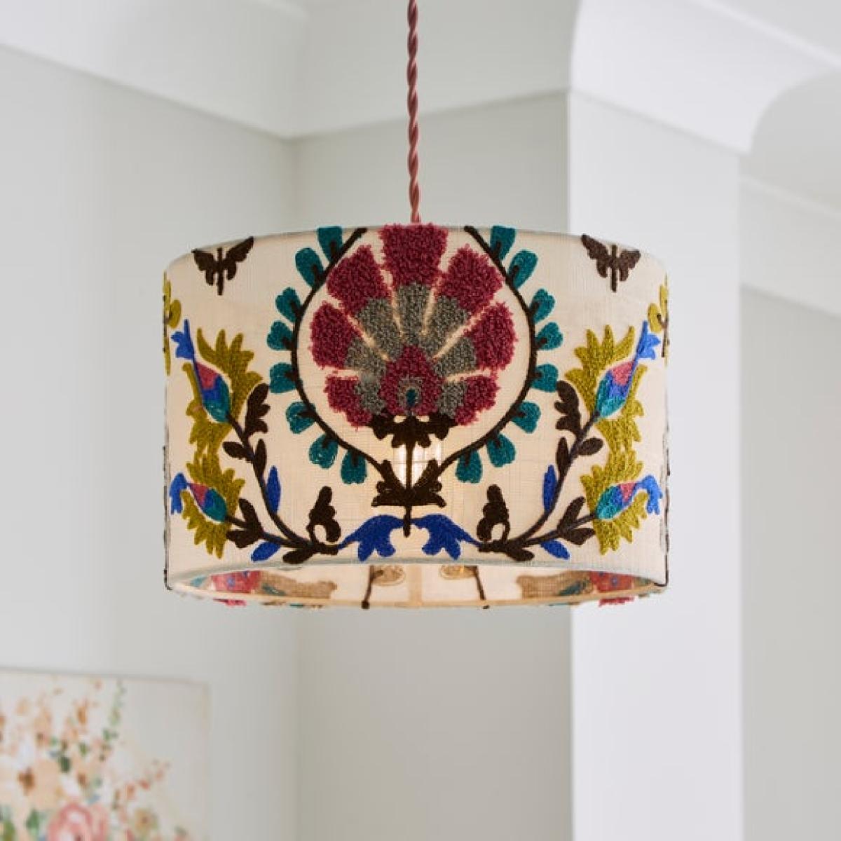 I love this hanging lampshade for its vibrant embroidery and easy fit design, making it a versatile choice for both modern and eclectic interiors. Its embroidered detail adds texture and colour, which can elevate a neutral scheme or complement a boho or vintage-inspired space. It works particularly well in living rooms, bedrooms, or even cosy dining areas where warm, inviting lighting is desired. For styling, consider pairing it with minimalist furniture to let the shade stand out, or hang it at various heights in a cluster for a playful, layered light effect. Its simplicity of fit makes it practical to update or switch between different rooms easily.