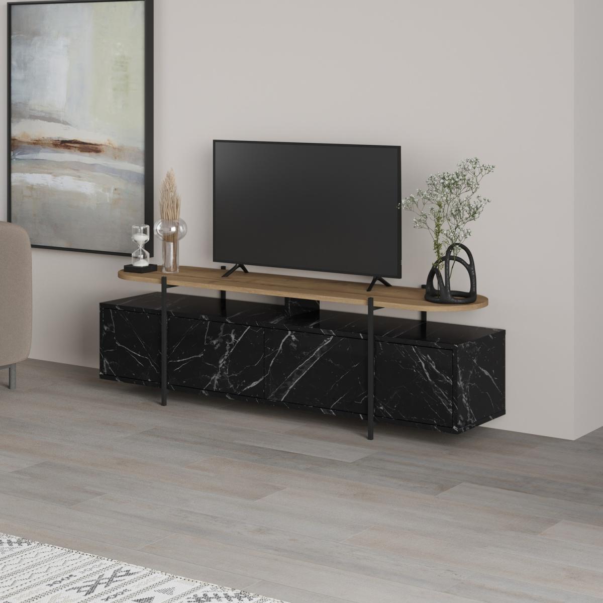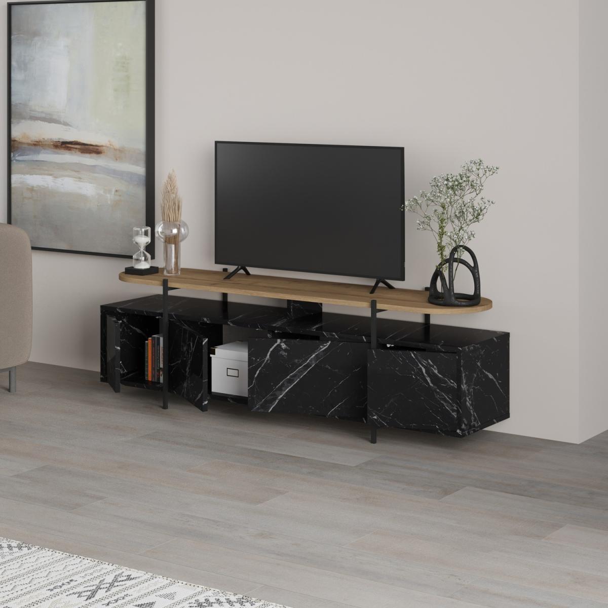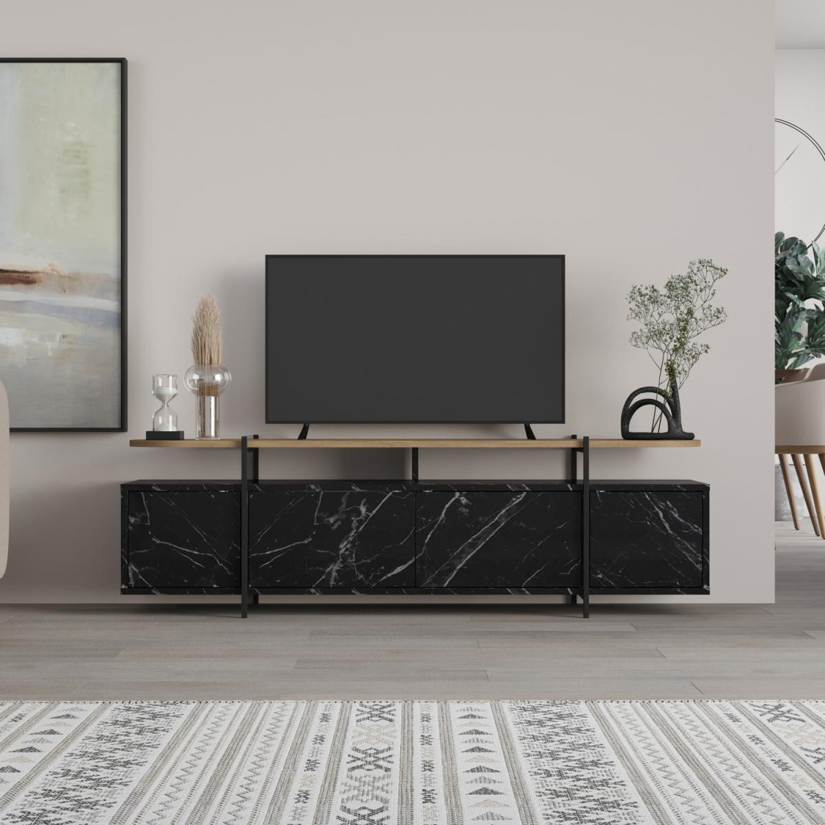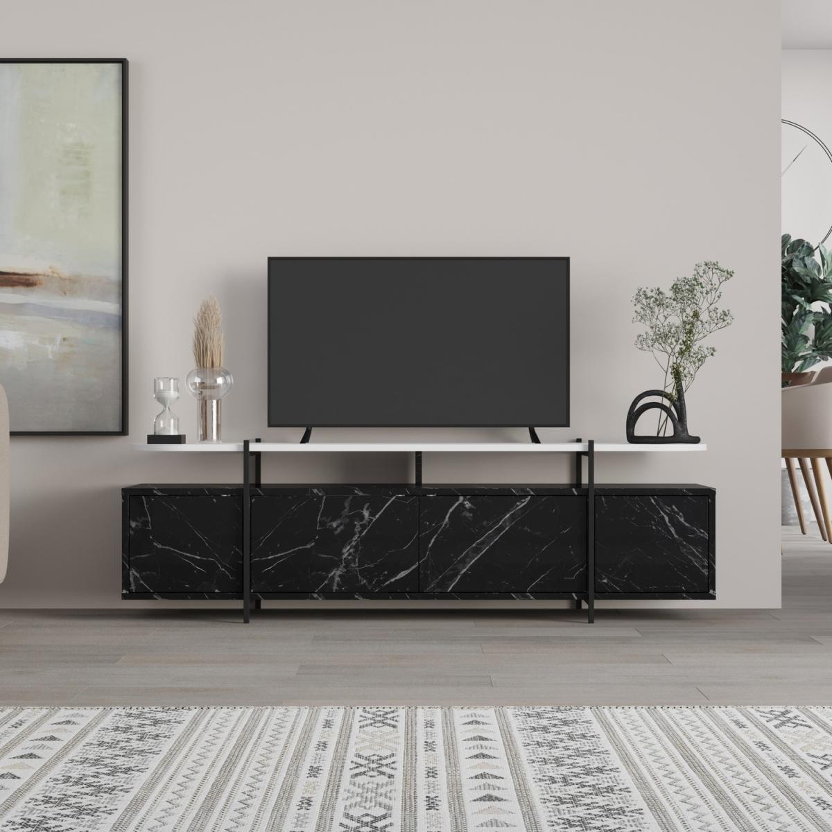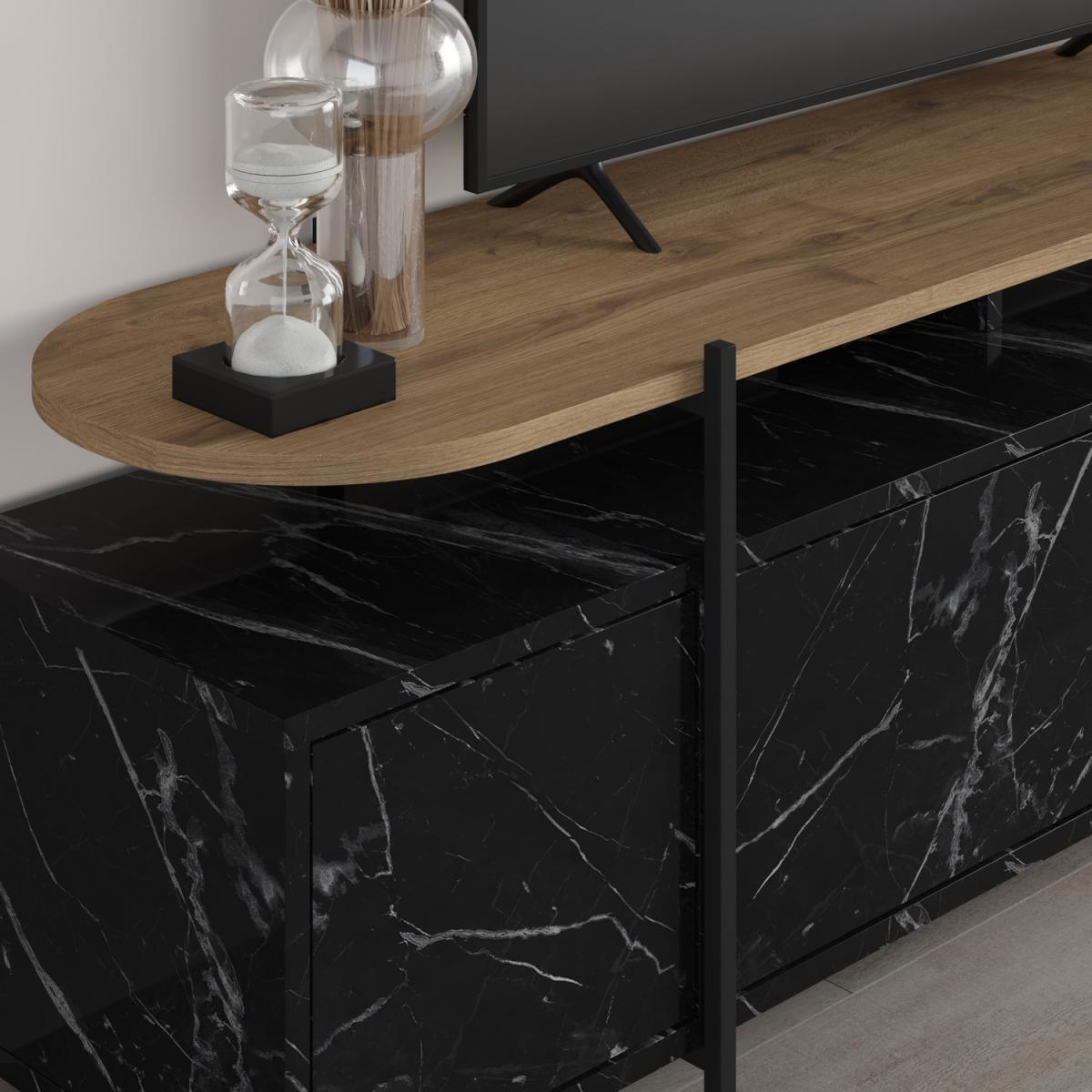 Hey there! Looking to spruce up your living room? Our TV stand is just what you need! Its unique design features elegant oval lines and a luxurious marble finish, creating a high-end, sophisticated look for your space. With four cabinets and stylish metal legs, it offers plenty of storage space for all your media and gaming accessories. Plus, its versatile design means it fits in with any home decor style and can be used in a variety of ways, whether it's as a console, display unit, living room storage, or sideboard. Don't worry about complicated assembly - clear instructions are provided, and keeping it clean is a breeze. So go ahead, upgrade your living room with this stunning piece of furniture and enjoy the elevated aesthetic it brings to your space!