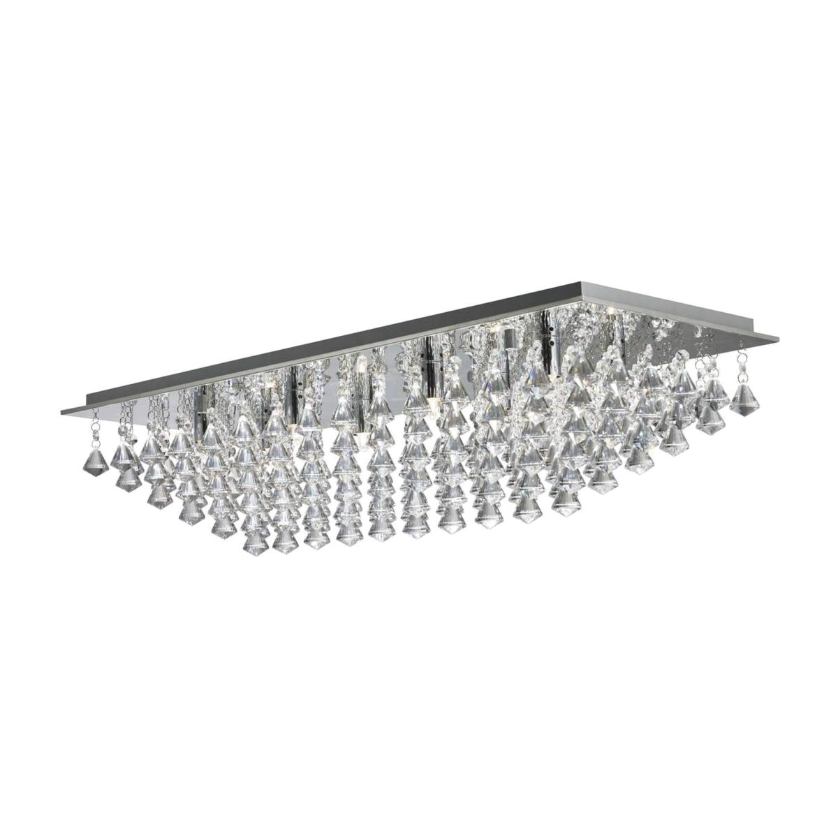 This large chrome 8 light rectangular ceiling fixture with clear crystal pyramid drops looks spectacular on any ceiling in your home. The luxurious light fits flush to the ceiling and features eight lamps surrounded by decadent crystal trimming and pyramid drops. And the elegant rectangular mirrored backplate completes the look of this large, contemporary chandelier.