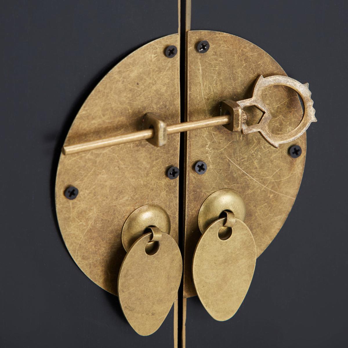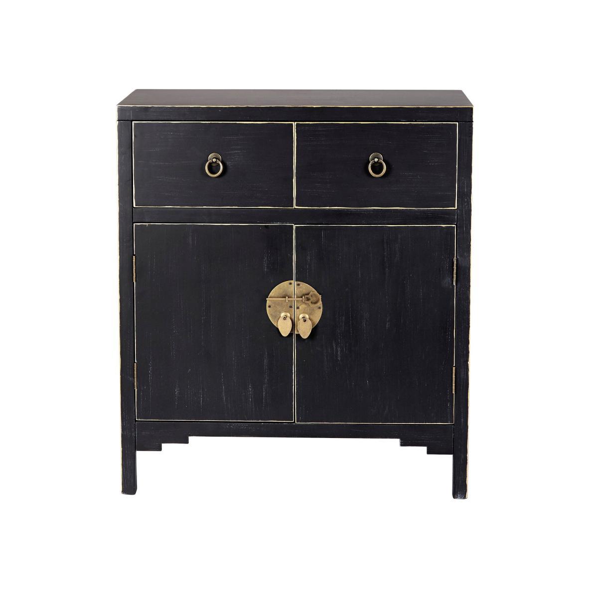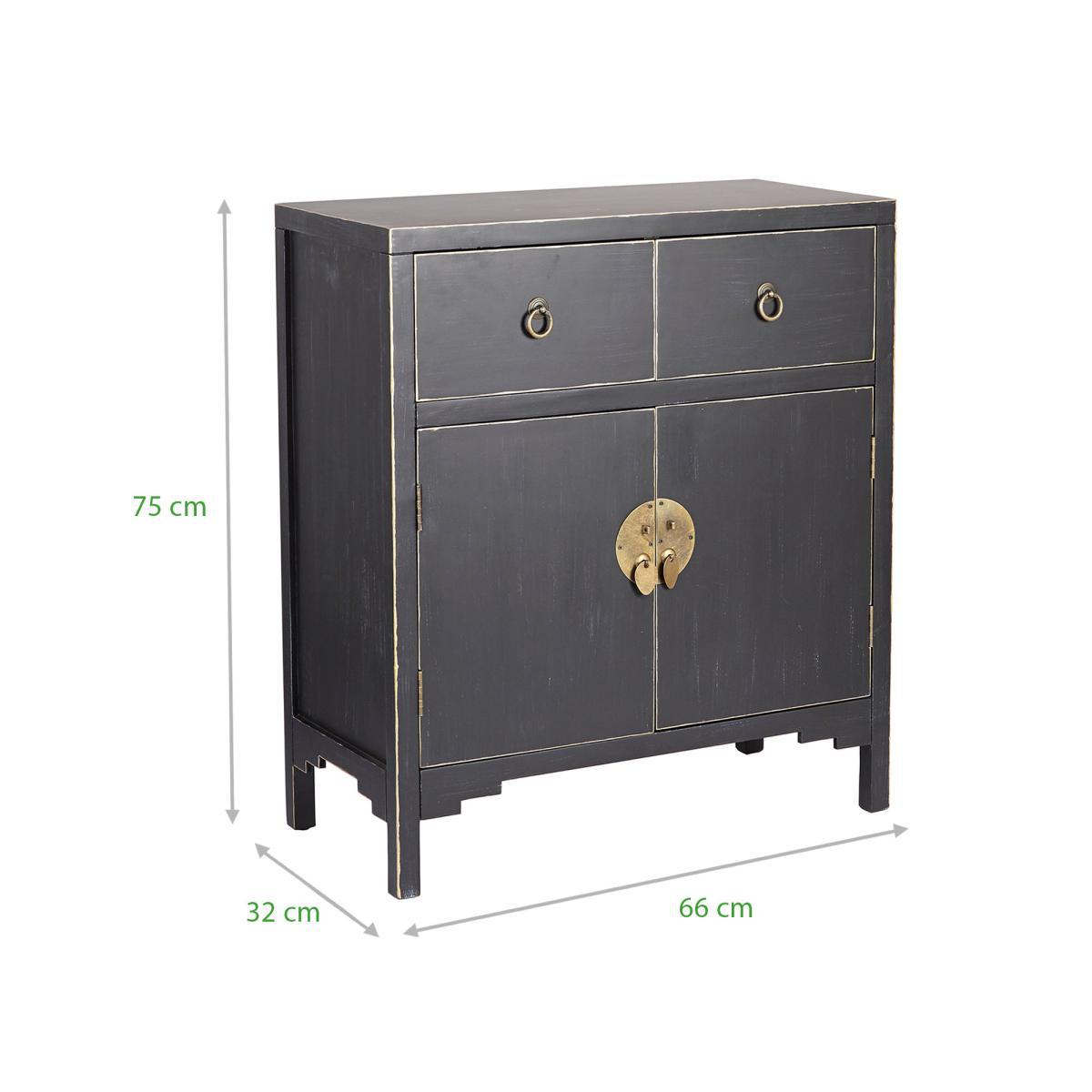 Dunelm Exclusive - Designed and Developed by Dunelm. Featuring a beautiful Chinese-inspired design, the Hanna chest is a versatile storage solution that will add a unique touch to any room. Designed with a beautiful distressed black finish and contrasting gold edges, this exquisite chest features traditional Chinese style handles with a loose pin lock mechanism and rustic gold finish. Complete with two doors that open to reveal generous storage space, this fully assembled chest is fashioned with one large fixed shelf, two spacious drawers and will also include a matching key for the door. Also available in. Teal. Care instruction: Wipe with a soft cloth and maintain with regular dusting, avoiding exposure to direct sunlight. For spills, wipe with a damp cloth avoiding solvents or abrasives. Maintain the brass by cleaning with warm soapy water and dry thoroughly. Do not use brass cleaner as this will damage the lacquer.
