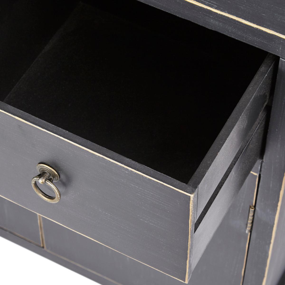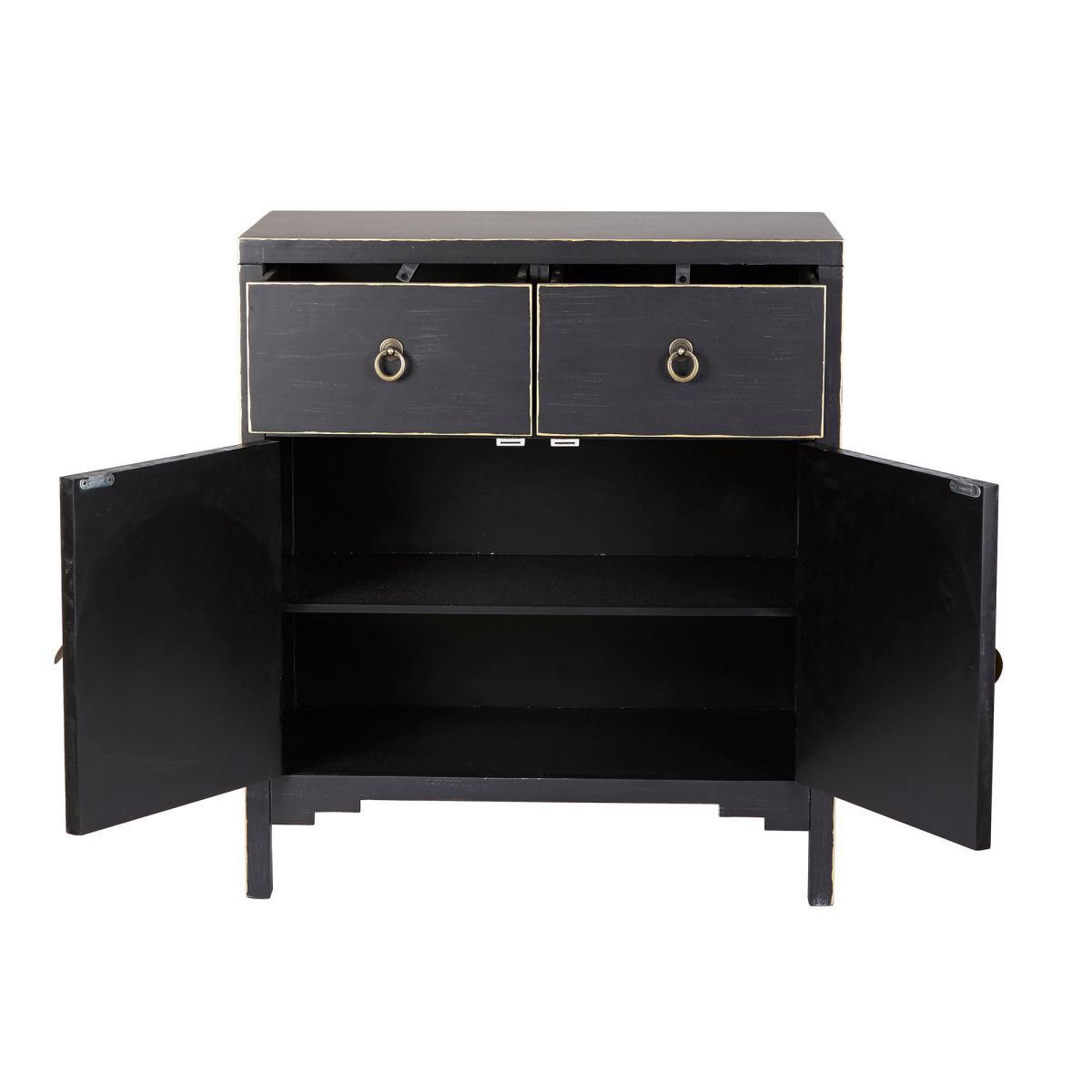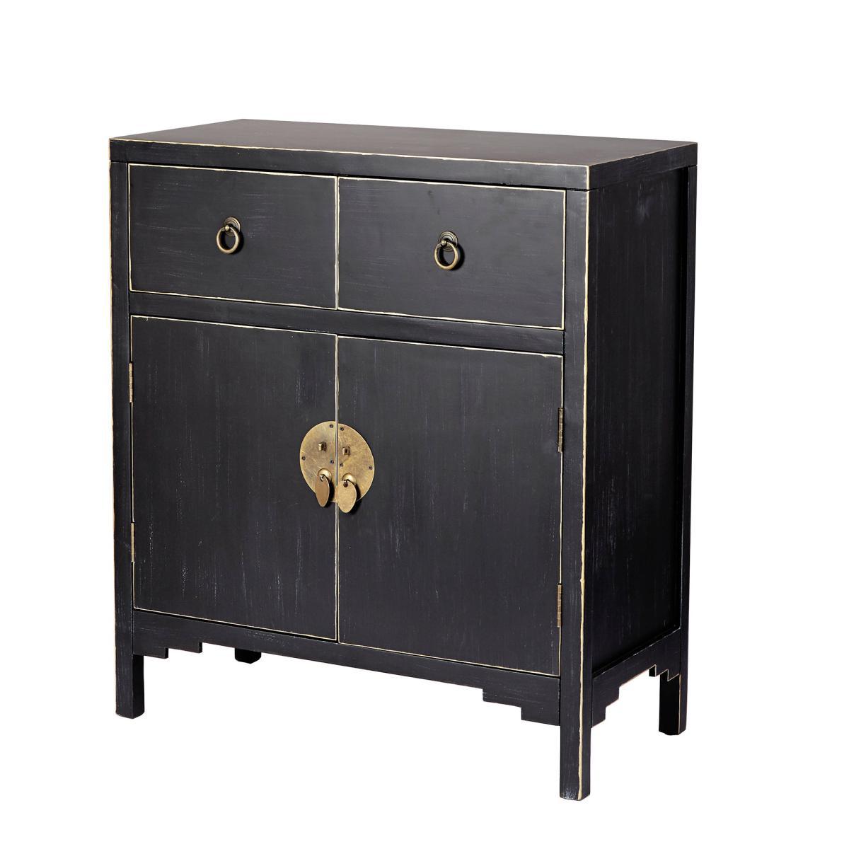 Dunelm Exclusive - Designed and Developed by Dunelm. Featuring a beautiful Chinese-inspired design, the Hanna chest is a versatile storage solution that will add a unique touch to any room. Designed with a beautiful distressed black finish and contrasting gold edges, this exquisite chest features traditional Chinese style handles with a loose pin lock mechanism and rustic gold finish. Complete with two doors that open to reveal generous storage space, this fully assembled chest is fashioned with one large fixed shelf, two spacious drawers and will also include a matching key for the door. Also available in. Teal. Care instruction: Wipe with a soft cloth and maintain with regular dusting, avoiding exposure to direct sunlight. For spills, wipe with a damp cloth avoiding solvents or abrasives. Maintain the brass by cleaning with warm soapy water and dry thoroughly. Do not use brass cleaner as this will damage the lacquer.