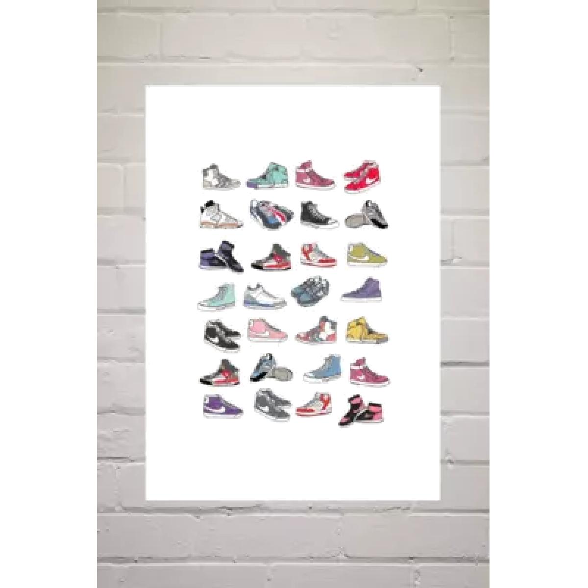 Celebrate the humble trainer with this shoe pattern print by Hanna Melin. Printed on high-quality archival paper. Available framed or unframed. About the Frame Obeche wood with an acrylic glaze finish All are fitted with protective plexiglass Complete with a ready-to-hang saw tooth at the back Content + Care Paper Wipe clean Size A1: 59.4cm x 84.1cm A2: 42cm x 59.4cm A3: 29.7cm x 42cm