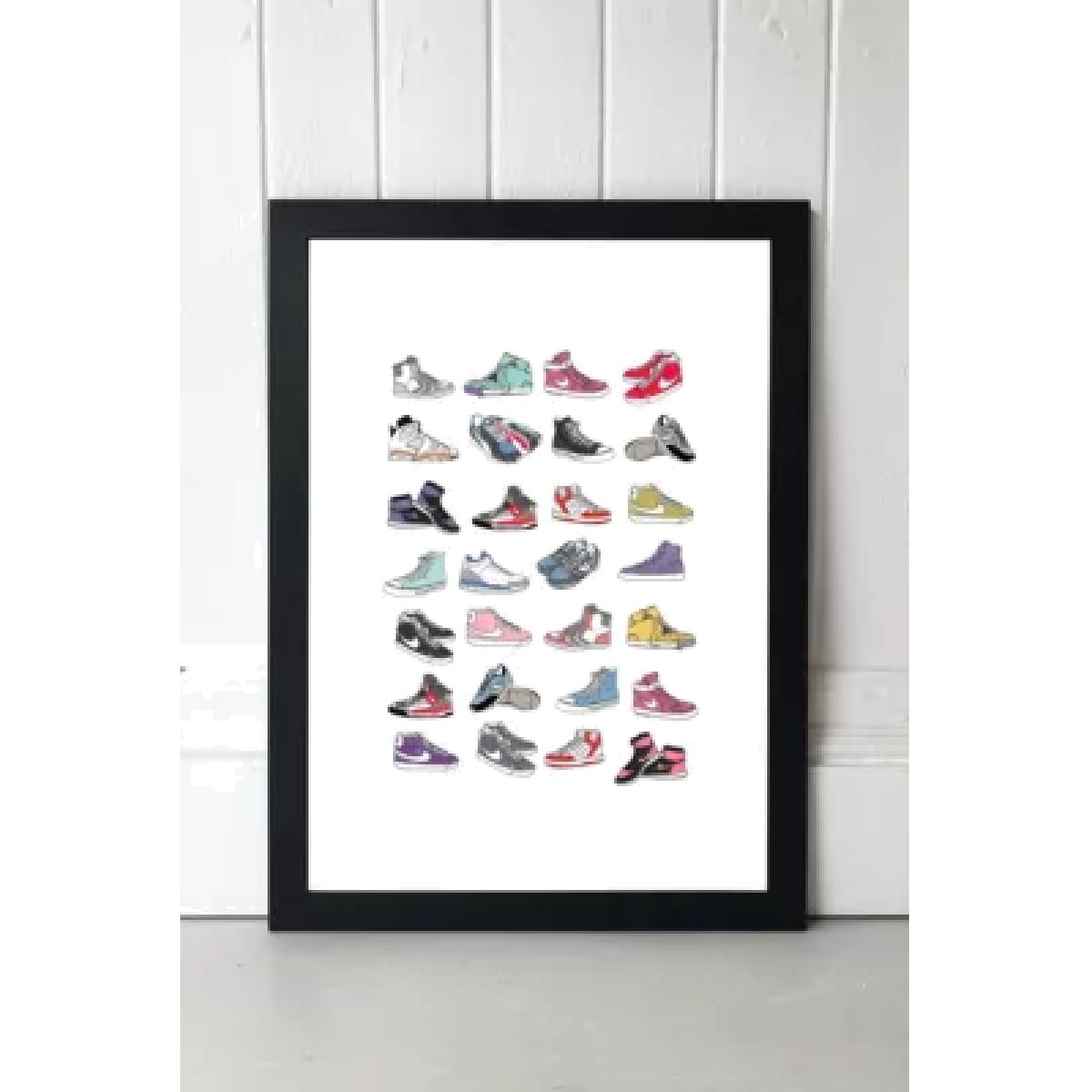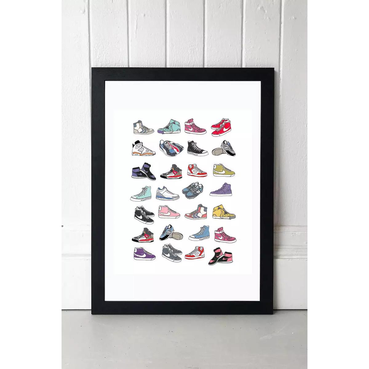 Celebrate the humble trainer with this shoe pattern print by Hanna Melin. Printed on high-quality archival paper. Available framed or unframed. **About the Frame** \- Obeche wood with an acrylic glaze finish \- All are fitted with protective plexiglass \- Complete with a ready-to-hang saw tooth at the back **Content + Care** \- Paper \- Wipe clean **Size** \- A1: 59.4cm x 84.1cm \- A2: 42cm x 59.4cm \- A3: 29.7cm x 42cm