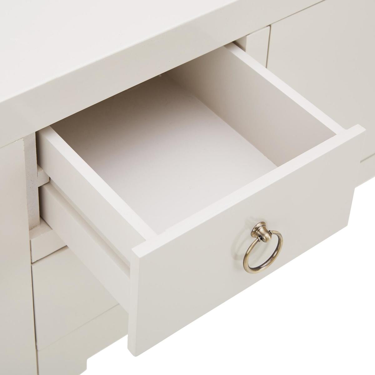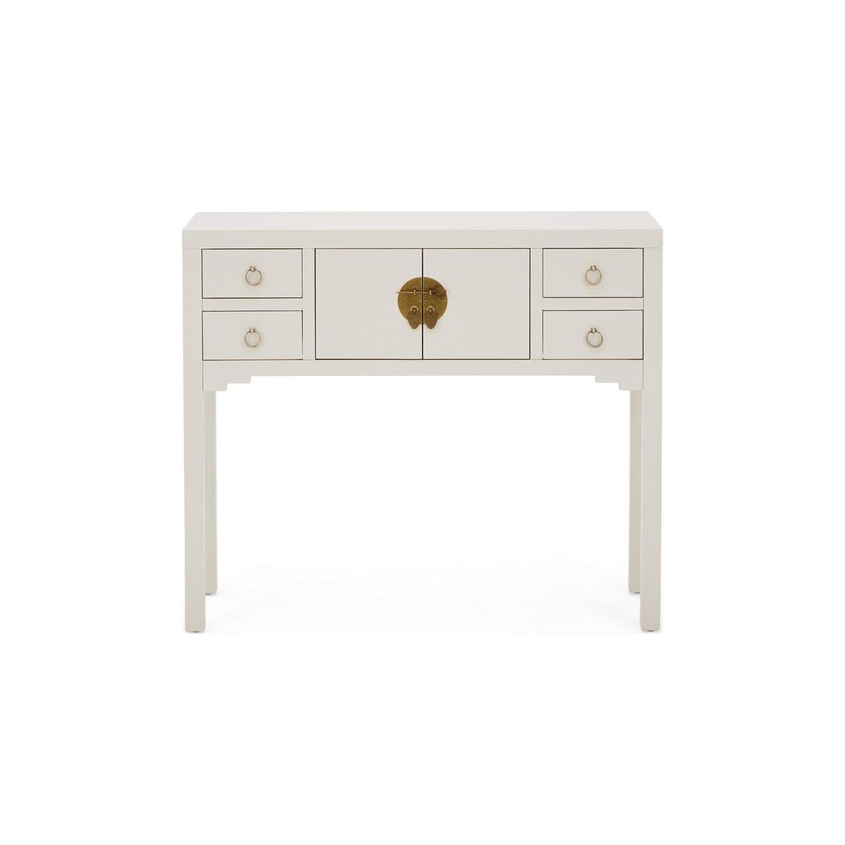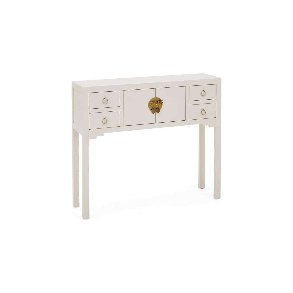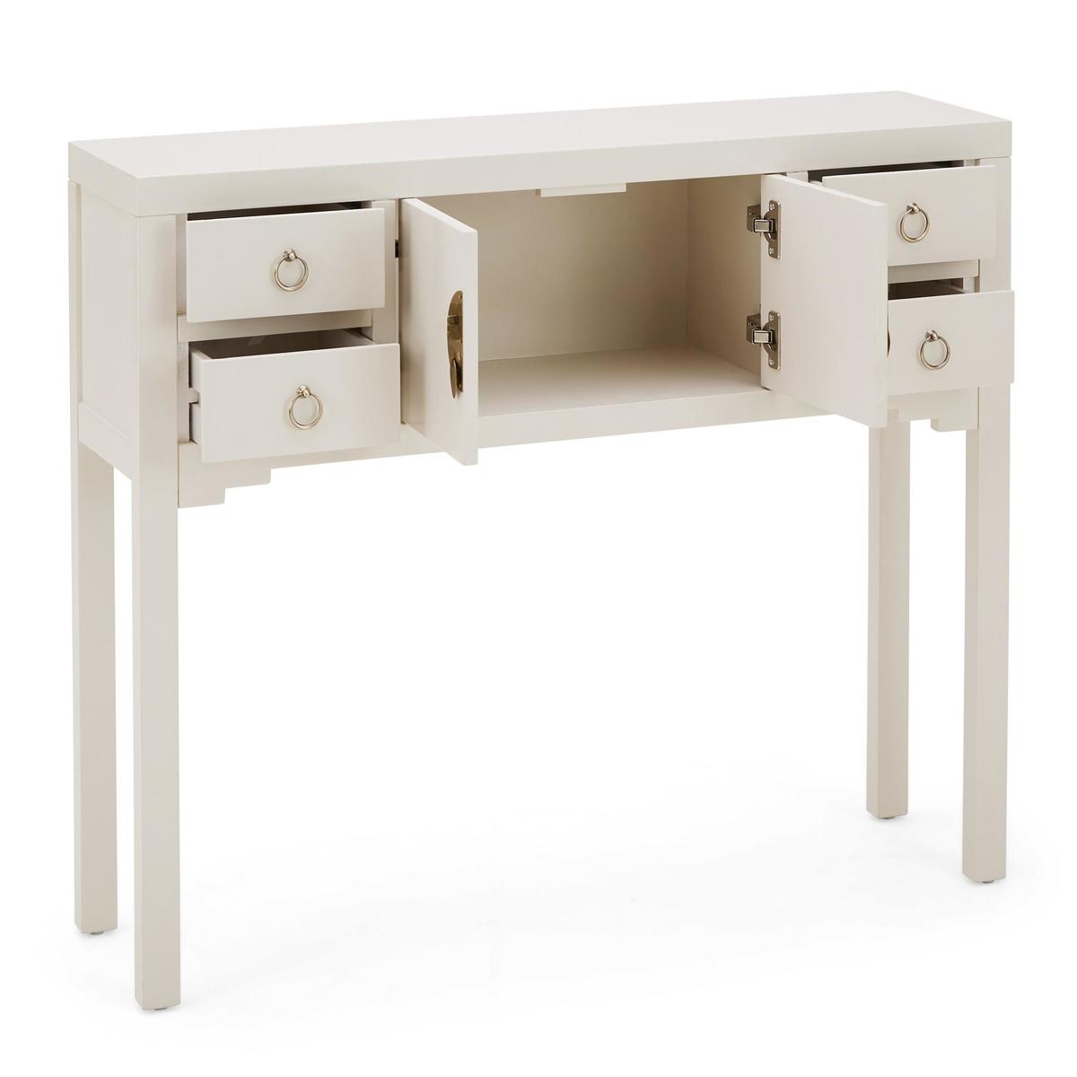 Dunelm Exclusive – Designed and Developed by Dunelm. Featuring a beautiful Chinese and Japanese inspired design, the Hanna range offer a versatile storage solution that will add a unique touch to your home. Designed in a beautiful oyster finish colourway and a contrasting distressed gold detailing, this exquisite range features authentic oriental handles with a loose pin lock mechanism, perfect to glam any room. Designed to maximise storage space, this partially assembled console table comes complete with four storage drawers, two elegantly designed doors, strong rubber wood legs and an attractive antique metal handle.