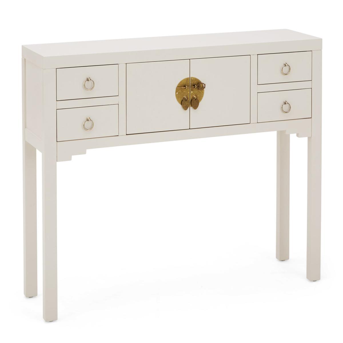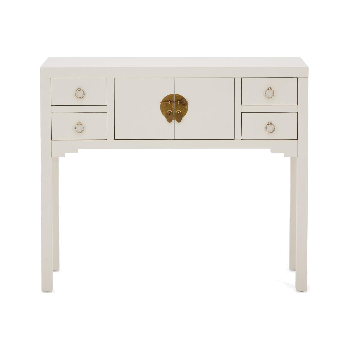 Dunelm Exclusive – Designed and Developed by Dunelm. Featuring a beautiful Chinese and Japanese inspired design, the Hanna range offer a versatile storage solution that will add a unique touch to your home. Designed in a beautiful oyster finish colourway and a contrasting distressed gold detailing, this exquisite range features authentic oriental handles with a loose pin lock mechanism, perfect to glam any room. Designed to maximise storage space, this partially assembled console table comes complete with four storage drawers, two elegantly designed doors, strong rubber wood legs and an attractive antique metal handle.