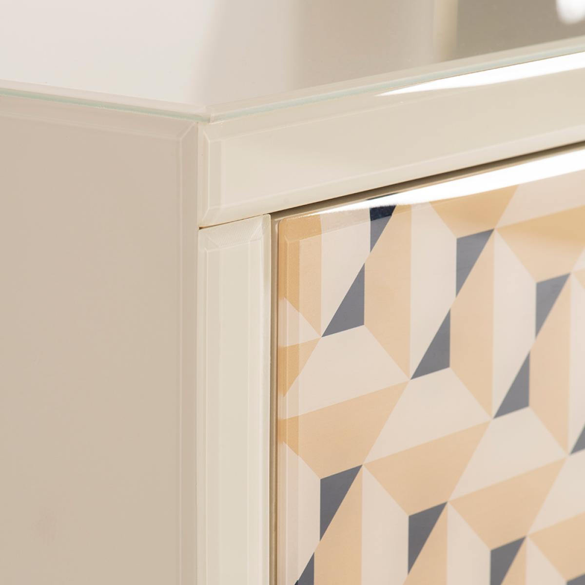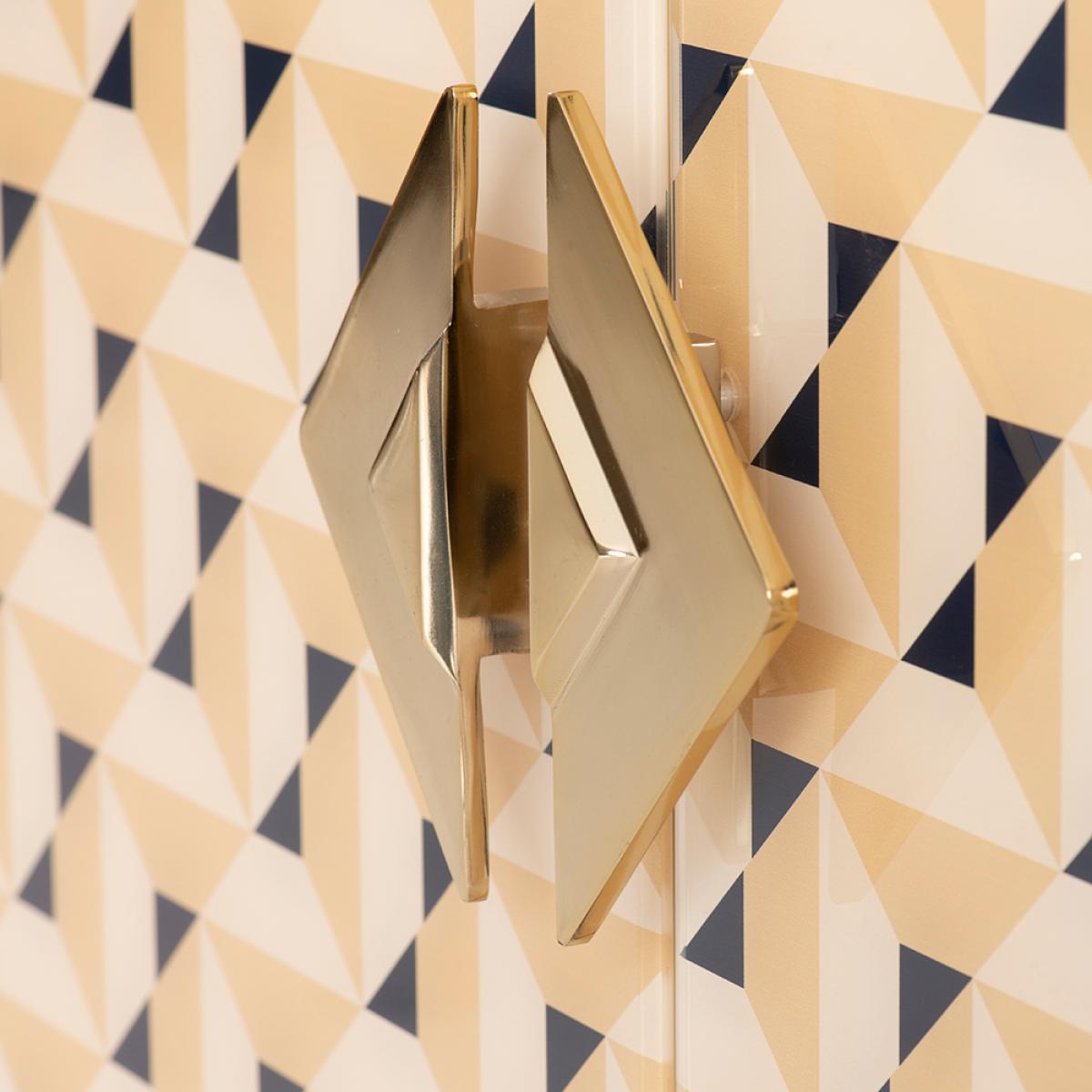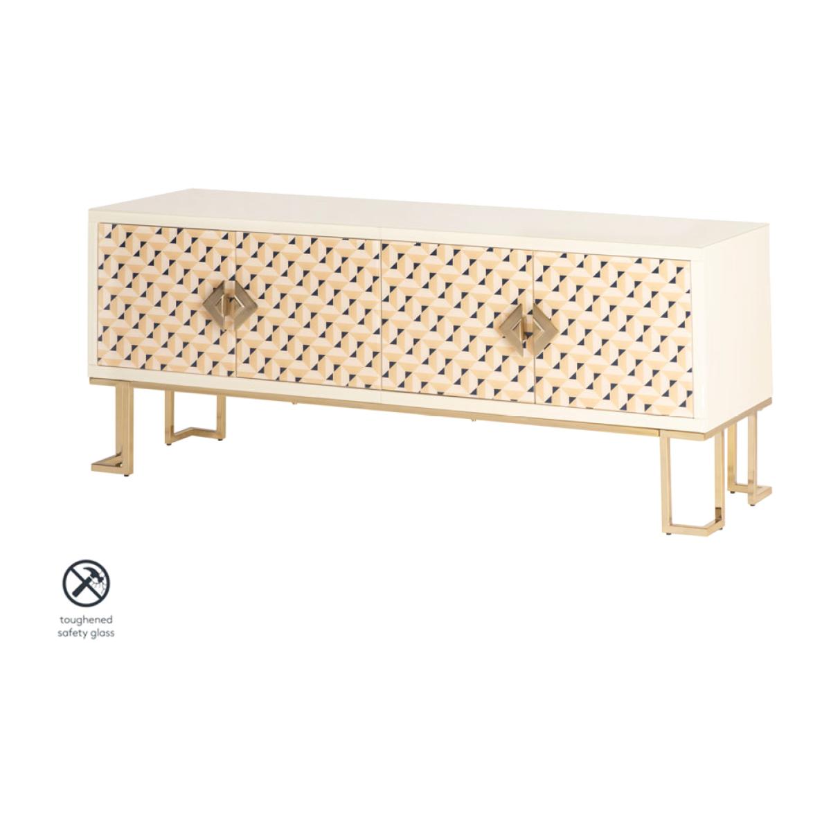 A unique and characterful sideboard. Strong and durable toughened glass with bevelled edges featuring a vibrant screen print in tones of cream with a hint of ink blue. Distinctive graphic handle echoing the screen printed pattern. Cream painted interior. Steel legs with a polished brass finish. Cable ports and adjustable shelves make this ideal for use as a television or media unit. Part assembly required.