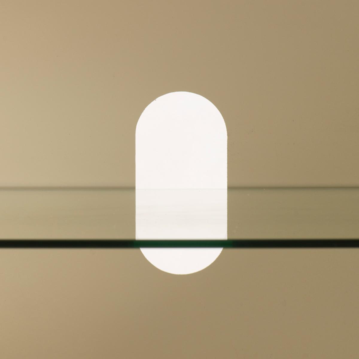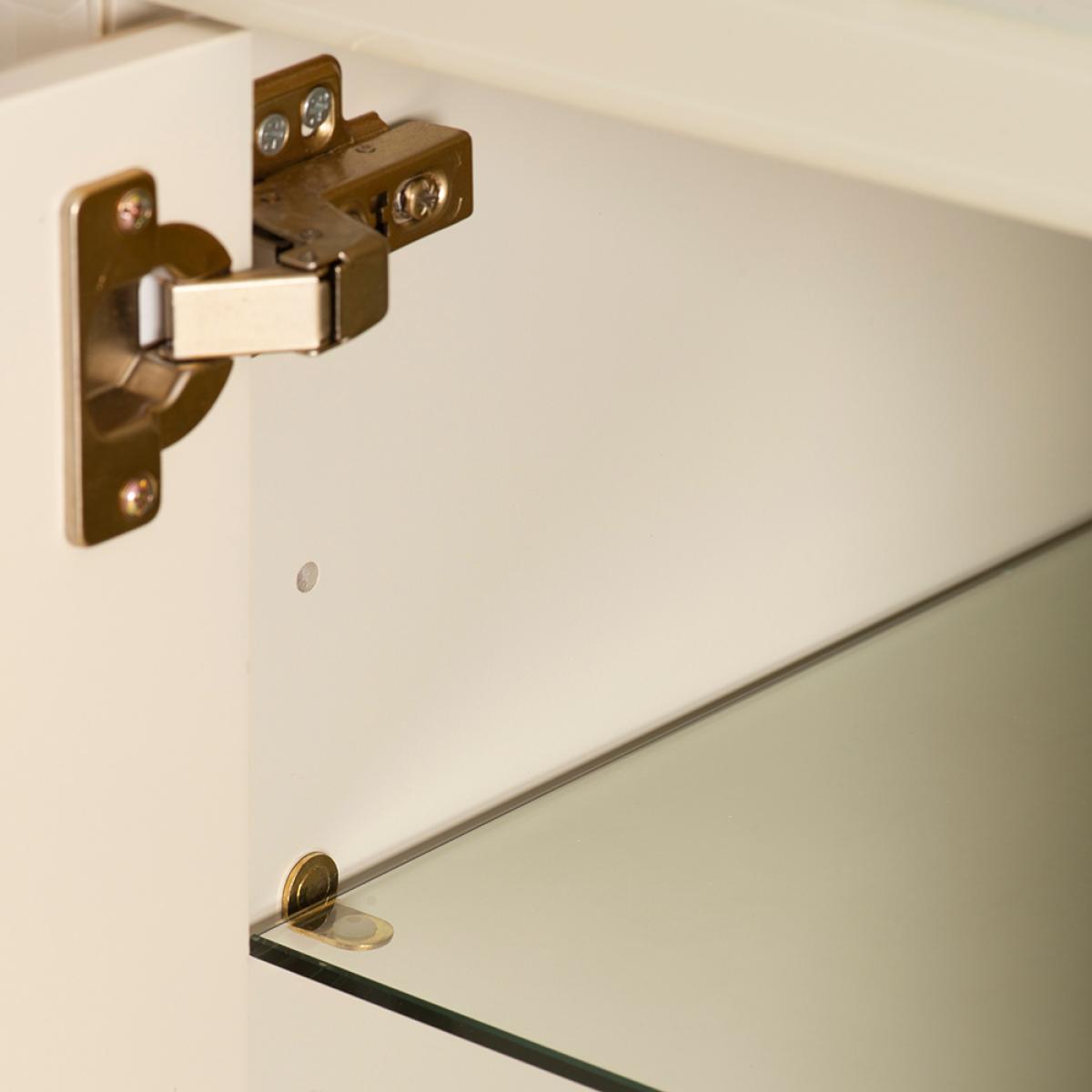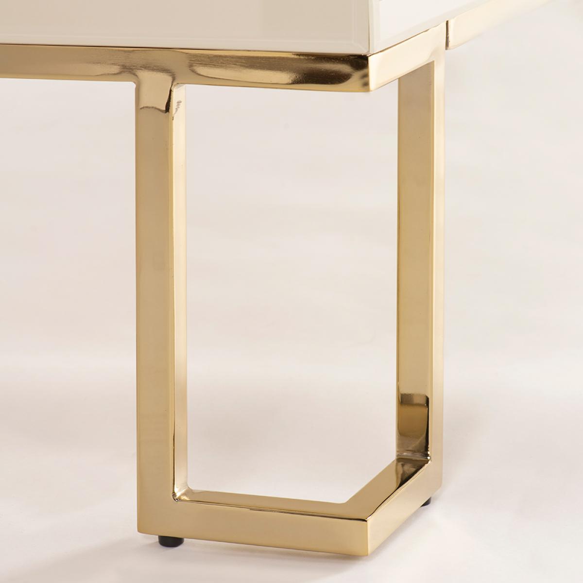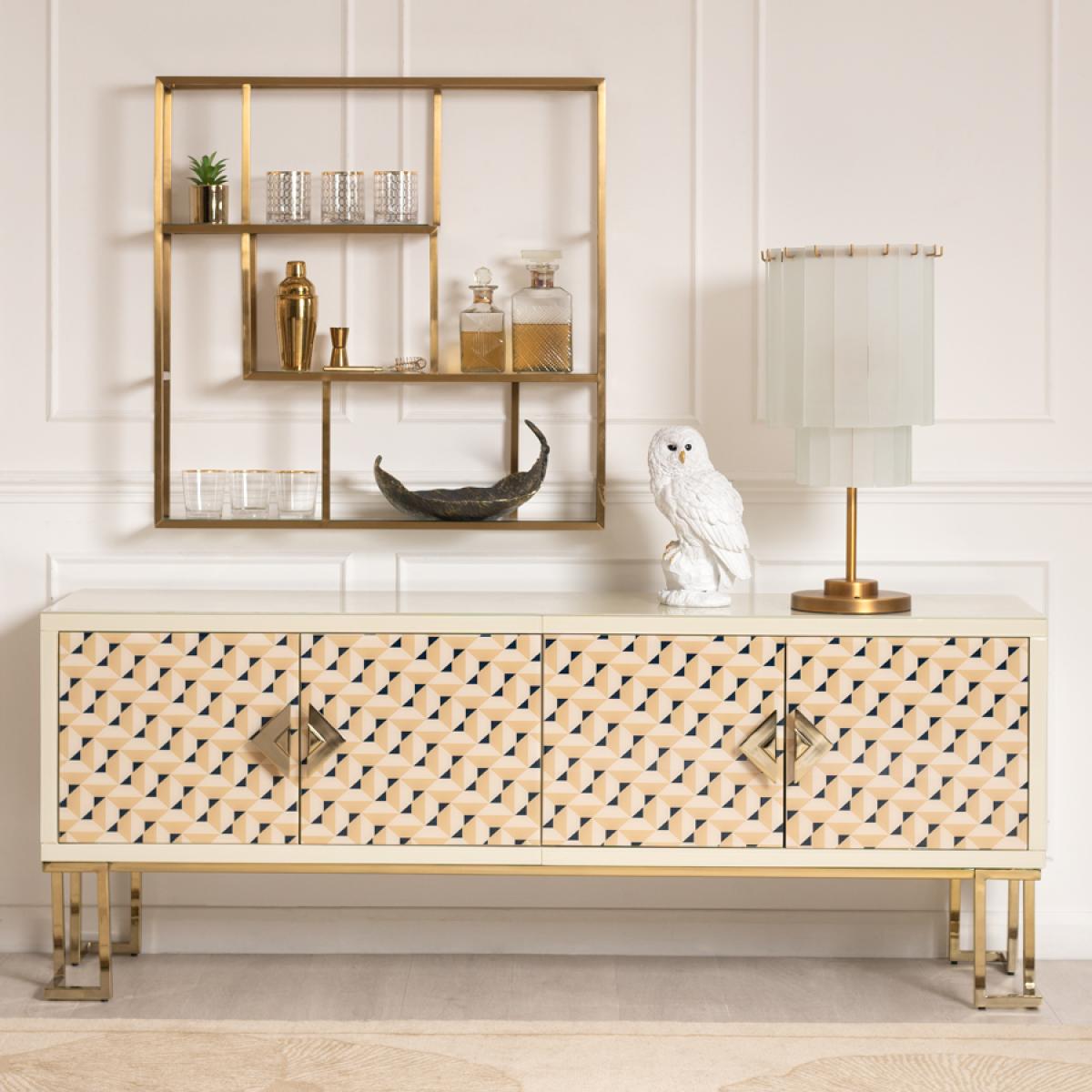 A unique and characterful sideboard. Strong and durable toughened glass with bevelled edges featuring a vibrant screen print in tones of cream with a hint of ink blue. Distinctive graphic handle echoing the screen printed pattern. Cream painted interior. Steel legs with a polished brass finish. Cable ports and adjustable shelves make this ideal for use as a television or media unit. Part assembly required.