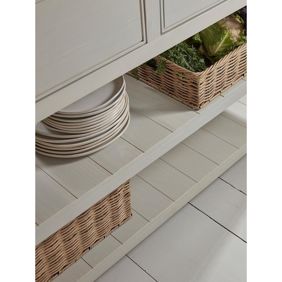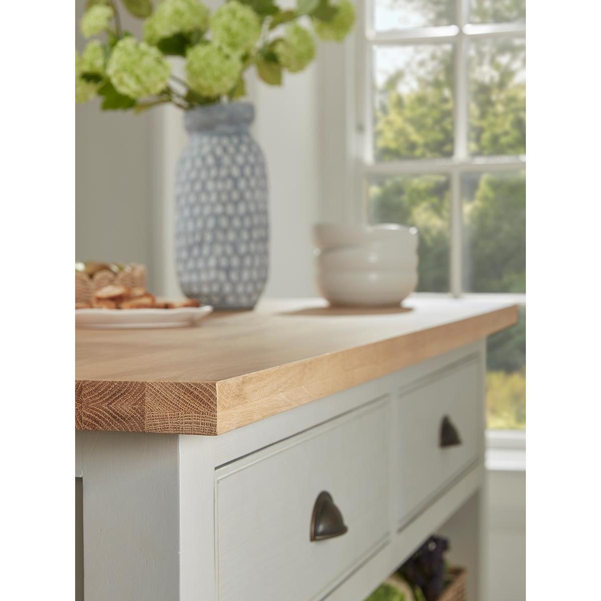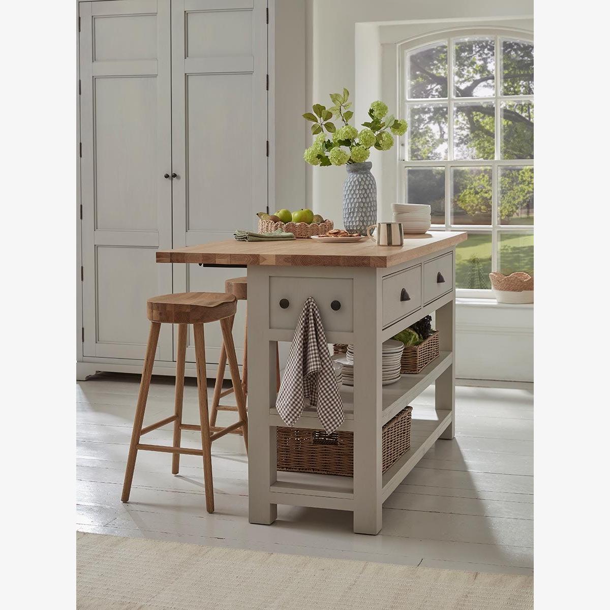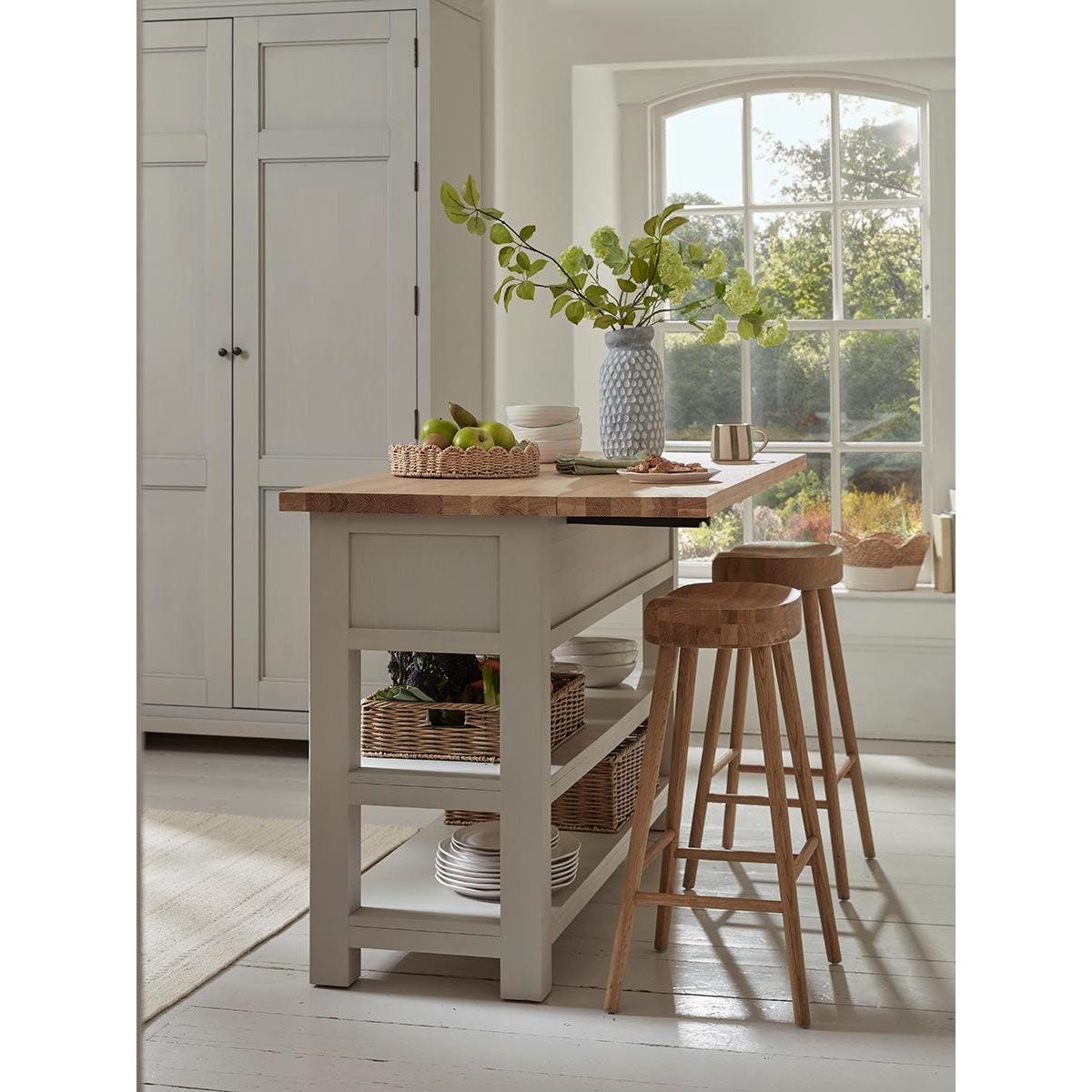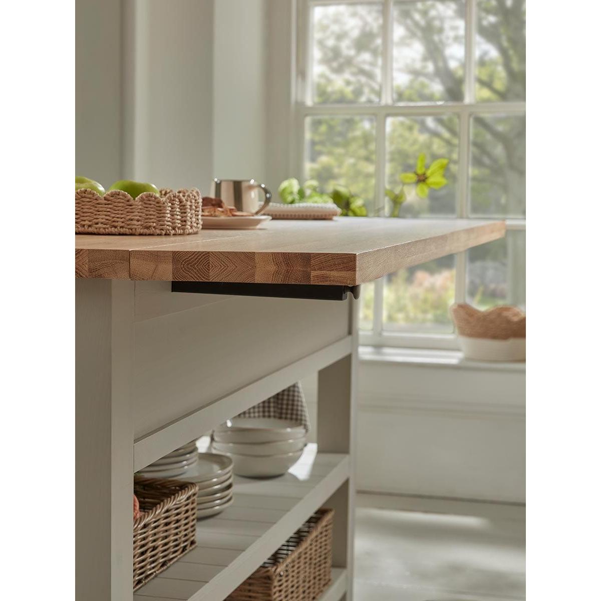 Bring a bespoke look to even smaller kitchens with our versatile Hanne Slim Kitchen Island Unit. Stylish and flexible, the island is a sturdy piece made from pine and poplar wood with a painted finish in a soft grey that tones with everything. The top is natural oak and has a hinged side with pull-out supports so that the workspace can be increased. Stools can be tucked under the leaf when you want to use the island as a breakfast bar. The body of the island includes two sturdy tongue and groove shelves and two drawers with metal cup handles. The three pegs on one end make a convenient place to hang tea towels and oven gloves. Pair with any of our freestanding larders or pantry cabinets.