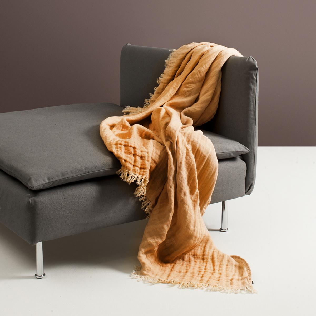 Hannelin throw from the Swedish brand Himla is soft and cool, made of 100% linen. This throw has sewn seams along the long sides, fringes along the short sides and a wrinkled design that fits on the bed, the sofa or the outdoor furniture. Available in several colours and can be combined with other linen textiles from Himla.