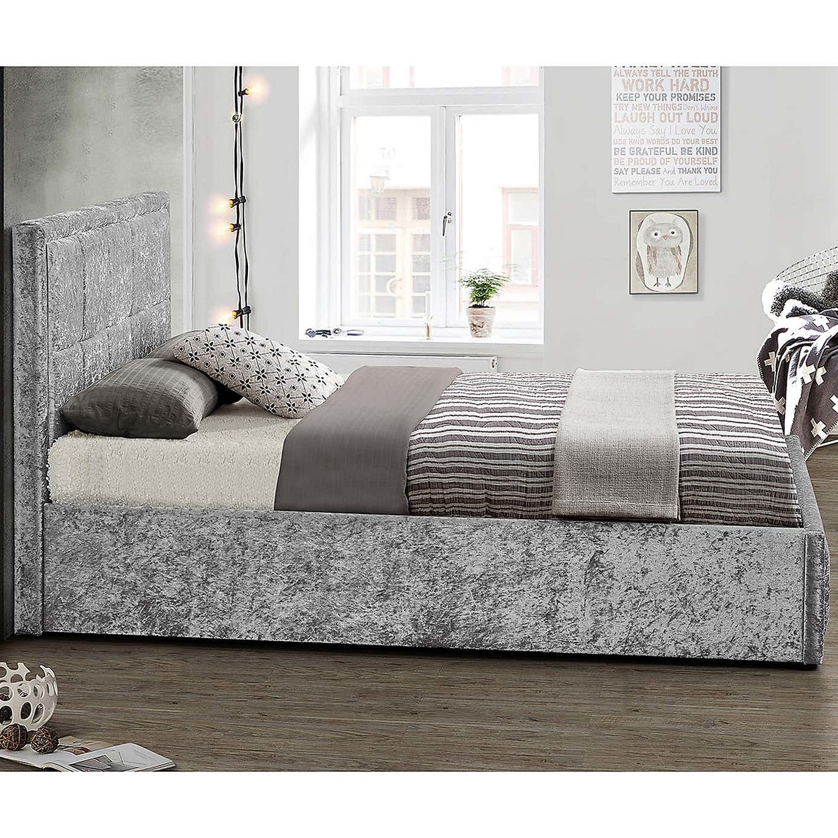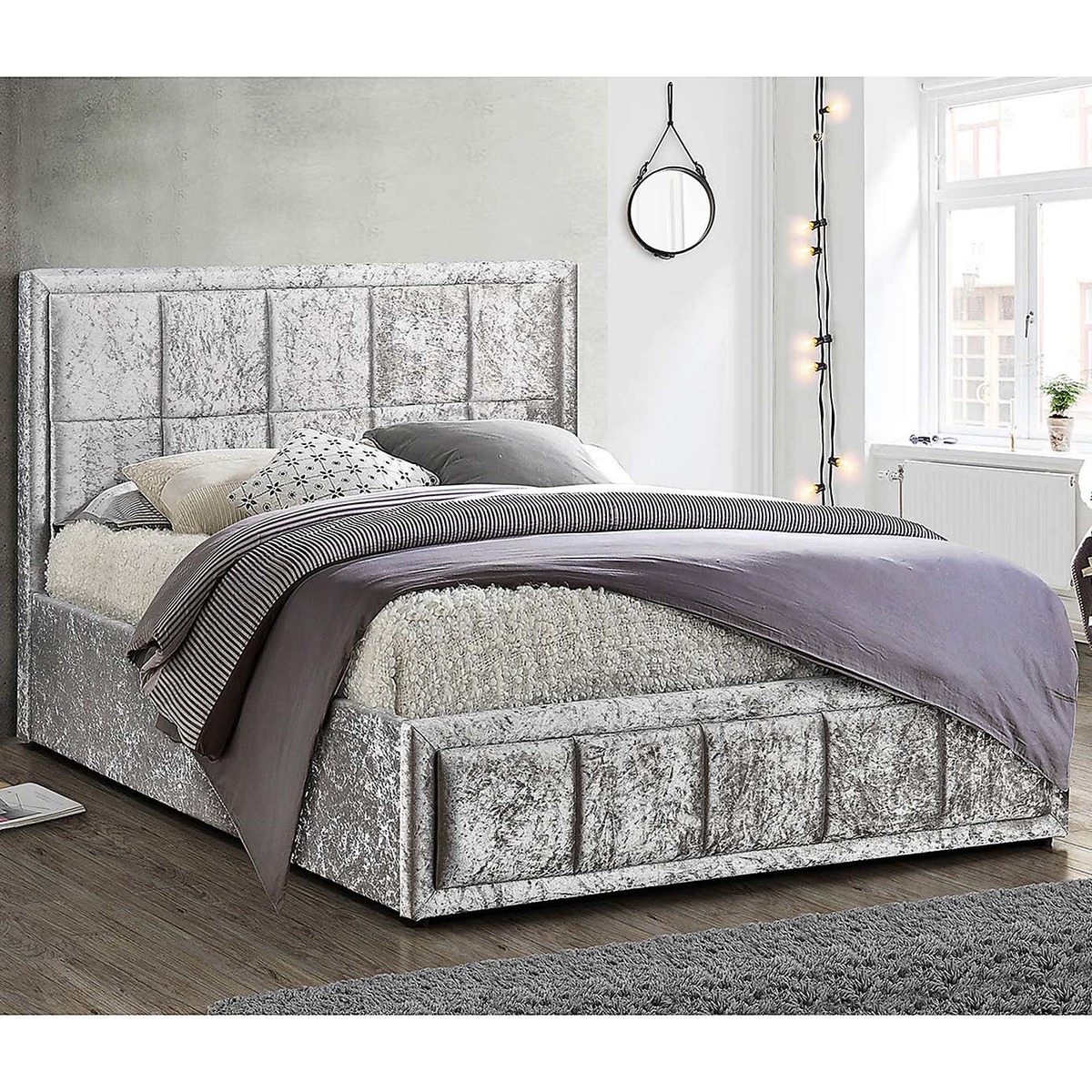 I love the Hannover Steel crushed velvet bed for its luxurious texture and contemporary appeal. Its grey tone is versatile, making it a great base for various interior styles, from modern minimalism to glam-inspired schemes. The crushed velvet finish adds a tactile element that elevates the overall look, making it a focal point in the bedroom. Practical styling tips include pairing it with soft, neutral bedding to highlight the texture or adding metallic accessories for a touch of glamour. It works particularly well in interiors that embrace layering and subtle luxury, providing both comfort and sophistication.