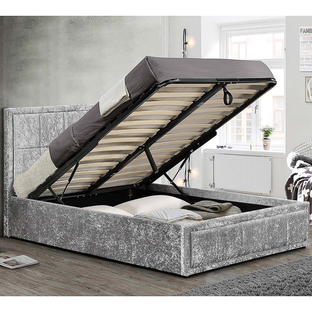 A versatile choice, the Hannover Crushed Velvet Ottoman Bed is ideal for compact spaces where extra storage is needed. It has been designed to provide style and comfort. The gas pistons can support a mattress weight of up to 45kg and a protective base sheet is included with the bed. Please note, unfortunately we cannot deliver this item to the Channel Islands.