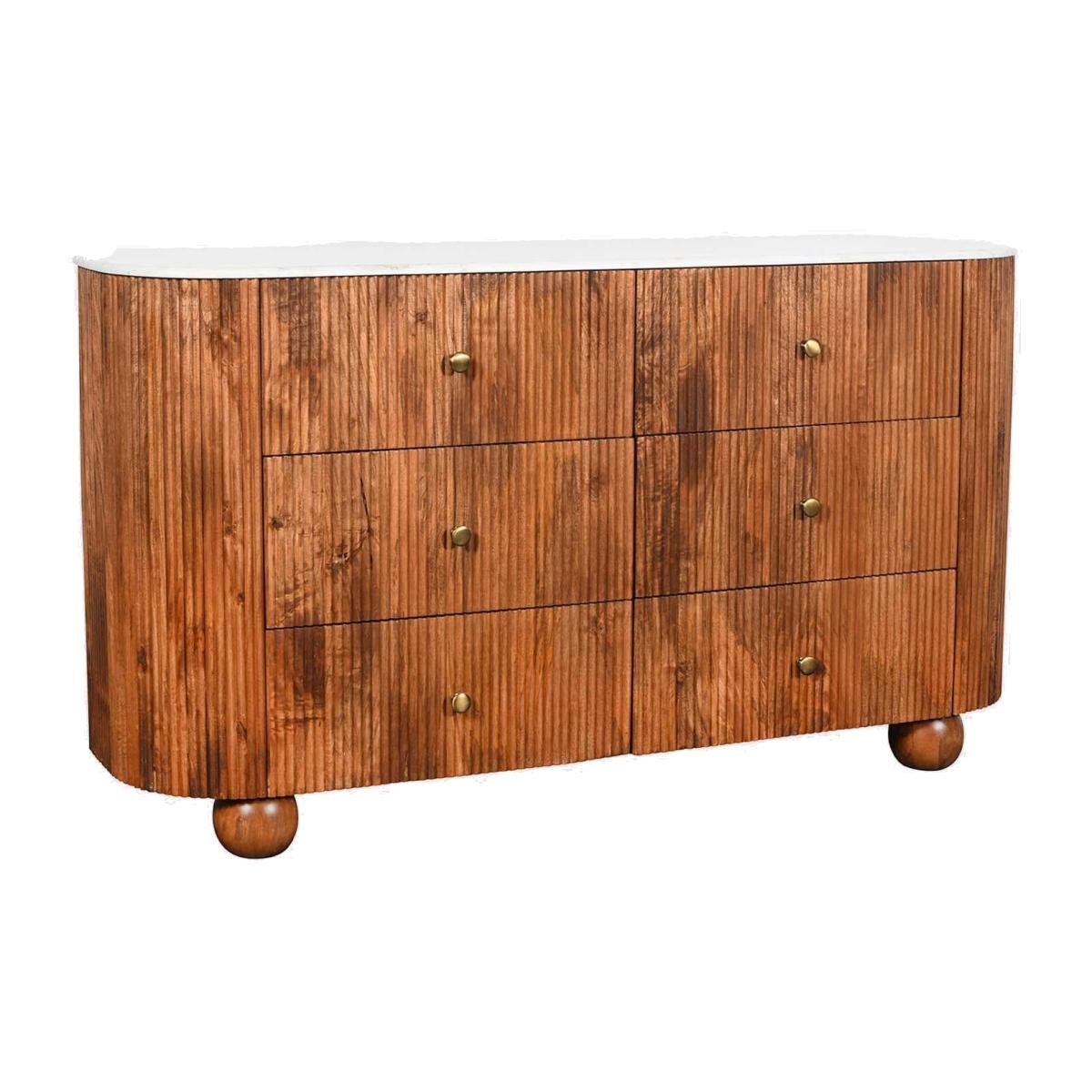 The Hanoi Wave Mango Wood 6 Drawers Chest of Drawers with White Marble Top is a harmonious blend of strength and grace, an ode to nature's artistry. Crafted from rich mango wood, its six drawers ripple with an intricate wave pattern, echoing the gentle undulations of the sea. Atop, a gleaming white marble slab rests, cool and serene, a perfect stage for cherished keepsakes. Anchored by gracefully rounded legs, this chest balances elegance and stability, transforming any space into a tranquil retreat where beauty and function unite in timeless rhythm