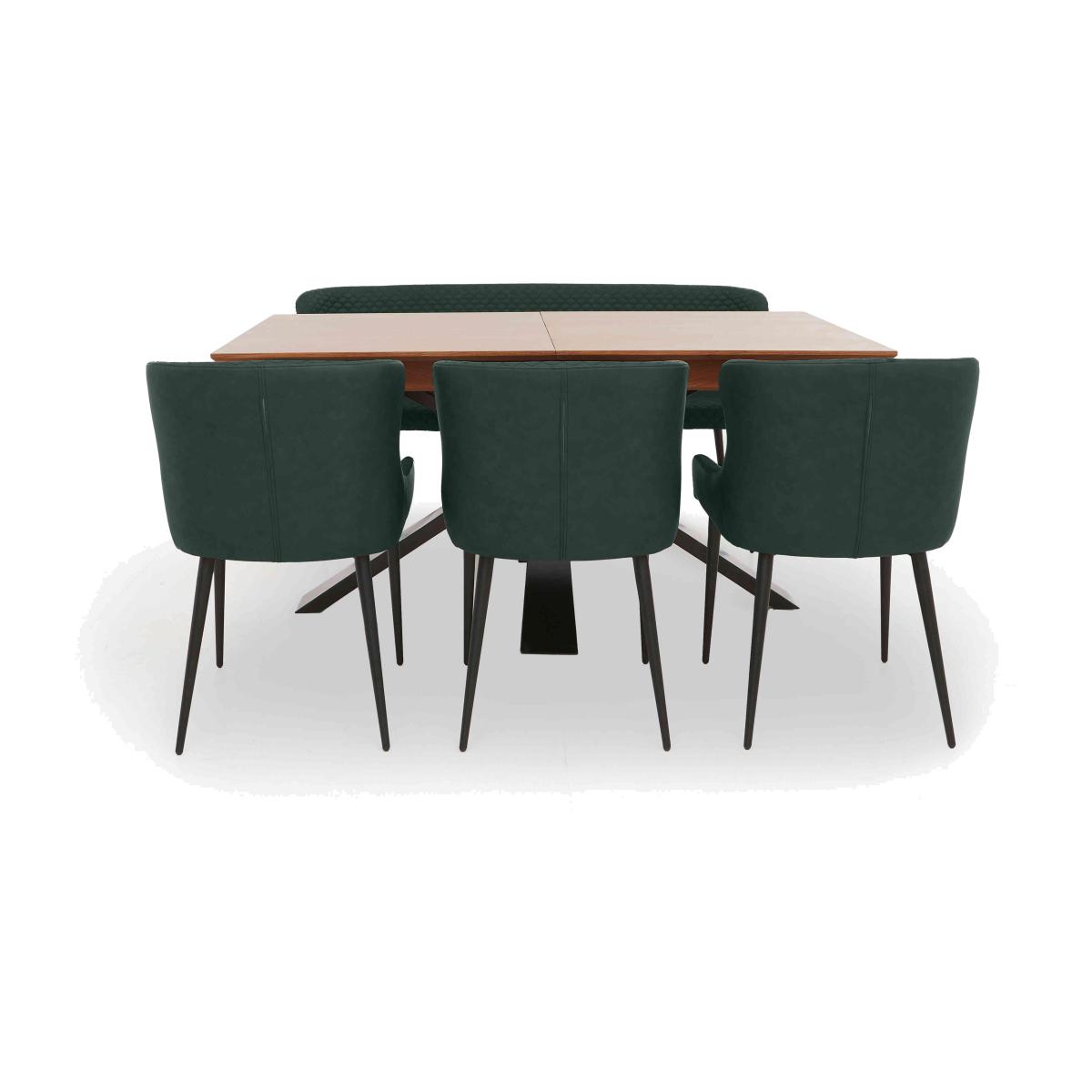 If you love industrial style but prefer a refined look to a rustic one, you’ll appreciate our extensive Hanoi range of dining room furniture. Showcasing light oak lacquered veneers and a choice of wood and metal table bases, this sleek and well-finished range includes a really wide choice of dining sets with versatile seating options – the curved dining chairs and dining bench are upholstered in faux leather in a choice of colour – as well as a sideboard and occasional tables. We think you’ll also appreciate the great-value pricing, a fact that makes it even easier to bring home the high-quality and well-crafted dining set and dining room furniture that you’ve always wanted. The Hanoi range is exclusively available at Furniture Village. This industrial dining set is practical as well as stylish. We’ve paired the oak veneer and metal extending table with dining chairs and a dining bench for versatility. Why you'll love it Flexible seating options make this dining set even more appealing. Top-quality industrial style at a great price. Table has a beautiful lacquered light oak veneer top. Striking metal star-shaped base. Seat 2 more in seconds with the super-easy butterfly extension mechanism. With 3 dining chairs and a bench. Faux leather upholstery in a choice of colours. Elegant curved silhouettes with supportive backs and low arms. Quilted-effect stitching and slender, tapered black metal legs. This dining set is also available with a fixed dining table and with a wooden base. Only at Furniture Village. This extending dining table, chairs and bench set is part of our Hanoi range. What you need to know Dining chairs and bench have foam cushioning. Dining bench seats 3 adults. Table seats 6 and extends to seat 8. Oak veneer top, solid wood frame, metal base. Every piece of oak veneer has unique and natural marks, knots and colour variation. Avoid placing in direct sunlight or close to a heat source. We recommend using coasters and placemats at all times. Our extensive Hanoi range includes dining tables, dining sets, chairs, benches and more.