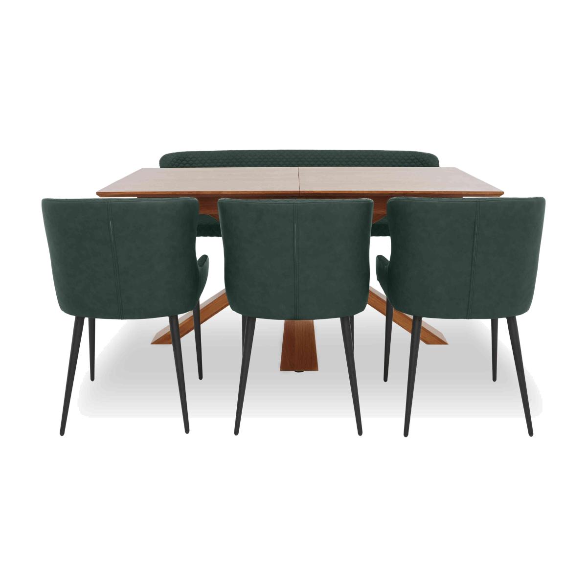 If you love industrial style but prefer a refined look to a rustic one, you’ll appreciate our extensive Hanoi range of dining room furniture. Showcasing light oak lacquered veneers and a choice of wood and metal table bases, this sleek and well-finished range includes a really wide choice of dining sets with versatile seating options – the curved dining chairs and dining bench are upholstered in faux leather in a choice of colour – as well as a sideboard and occasional tables. We think you’ll also appreciate the great-value pricing, a fact that makes it even easier to bring home the high-quality and well-crafted dining set and dining room furniture that you’ve always wanted. The Hanoi range is exclusively available at Furniture Village. Fabulous dining room seating plus a beautiful oak veneer-topped dining table ensure that this versatile dining set is ideal for both entertaining and family dining. Why you'll love it Stunning table, versatile seating – what more could you want in a dining set? Top-quality industrial style at a great price. Table has a beautiful lacquered light oak veneer top. Striking wooden star-shaped base. Seat 2 more in seconds with the super-easy butterfly extension mechanism. With 3 dining chairs and a bench. Faux leather upholstery in a choice of colours. Elegant curved silhouettes with supportive backs and low arms. Quilted-effect stitching and slender, tapered black metal legs. This dining set is also available with a fixed dining table and with a metal base. Only at Furniture Village. This extending dining table, chairs and bench set is part of our Hanoi range. What you need to know Dining chairs and bench have foam cushioning. Dining bench seats 3 adults. Table seats 6 and extends to seat 8. Oak veneer top. Solid wood frame and base. Every piece of oak veneer has unique and natural marks, knots and colour variation. Avoid placing in direct sunlight or close to a heat source. We recommend using coasters and placemats at all times. Our extensive Hanoi range includes dining tables, dining sets, chairs, benches and more.