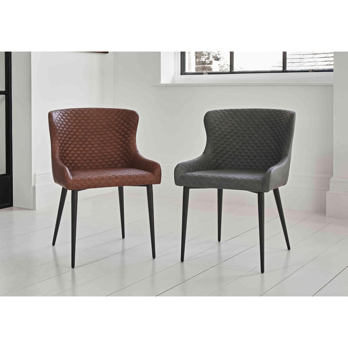 If you love industrial style but prefer a refined look to a rustic one, you’ll appreciate our extensive Hanoi range of dining room furniture. Showcasing light oak lacquered veneers and a choice of wood and metal table bases, this sleek and well-finished range includes a really wide choice of dining sets with versatile seating options – the curved dining chairs and dining bench are upholstered in faux leather in a choice of colour – as well as a sideboard and occasional tables. We think you’ll also appreciate the great-value pricing, a fact that makes it even easier to bring home the high-quality and well-crafted dining set and dining room furniture that you’ve always wanted. The Hanoi range is exclusively available at Furniture Village. Curved for comfort as well as style, this dining chair has a supportive back, low arms and lovely stitching detail. Soft faux leather in a choice of colours. Why you'll love it Elegantly curved dining chair with a contemporary urban look. Refined industrial style at a great price. Neatly upholstered in faux leather. Choice of colours. Nicely embellished with quilted-effect stitching. Slender, tapered black metal legs. Striking style meets dining comfort with supportive back and low arms. Also available in sets of 2, 4 and 6. Only at Furniture Village. This dining chair is part of our Hanoi range. What you need to know Foam seat cushioning. Our extensive Hanoi range includes dining tables, dining sets, chairs, benches and more.