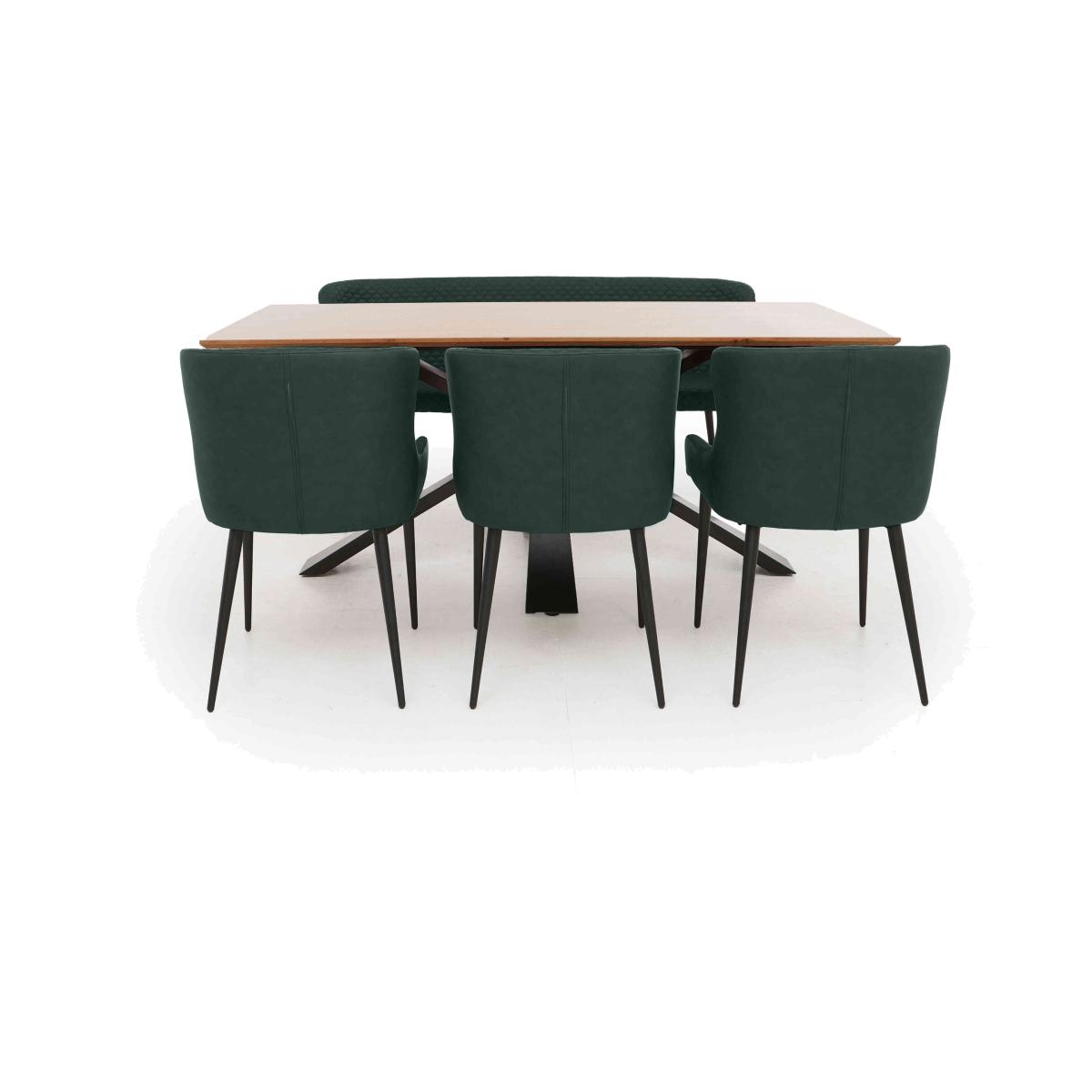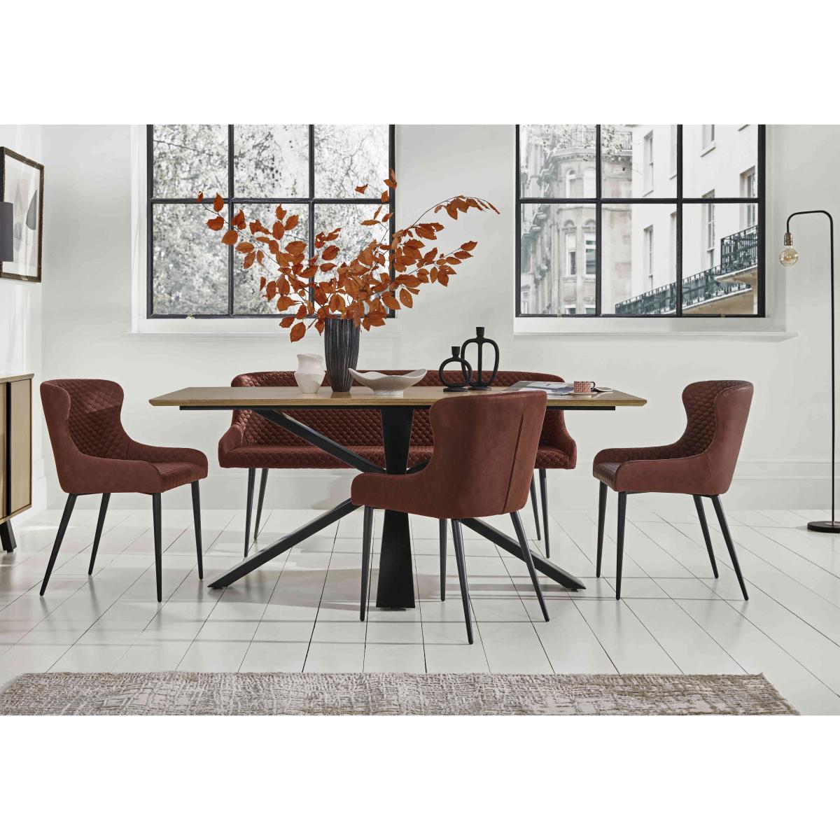 If you love industrial style but prefer a refined look to a rustic one, you’ll appreciate our extensive Hanoi range of dining room furniture. Showcasing light oak lacquered veneers and a choice of wood and metal table bases, this sleek and well-finished range includes a really wide choice of dining sets with versatile seating options – the curved dining chairs and dining bench are upholstered in faux leather in a choice of colour – as well as a sideboard and occasional tables. We think you’ll also appreciate the great-value pricing, a fact that makes it even easier to bring home the high-quality and well-crafted dining set and dining room furniture that you’ve always wanted. The Hanoi range is exclusively available at Furniture Village. And we think your guests will love the sleek oak veneer and metal dining table. Why you'll love it Dining set has a bold metal base and comes with versatile and stylish seating. Top-quality industrial style at a great price. Table has a beautiful lacquered light oak veneer top. Striking metal star-shaped base. Seat 2 more in seconds with the super-easy butterfly extension mechanism. With 3 dining chairs and a bench. Faux leather upholstery. Elegant curved silhouettes with supportive backs and low arms. Quilted-effect stitching and slender, tapered black metal legs. Only at Furniture Village. This dining table, chairs and bench set is part of our Hanoi range. What you need to know Dining chairs and bench have foam cushioning. Dining bench seats 3 adults. Table seats 6. Oak veneer top, solid wood frame, metal base. Every piece of oak veneer has unique and natural marks, knots and colour variation. Avoid placing in direct sunlight or close to a heat source. We recommend using coasters and placemats at all times. Our extensive Hanoi range includes dining tables, dining sets, chairs, benches and more.