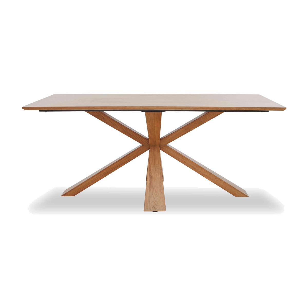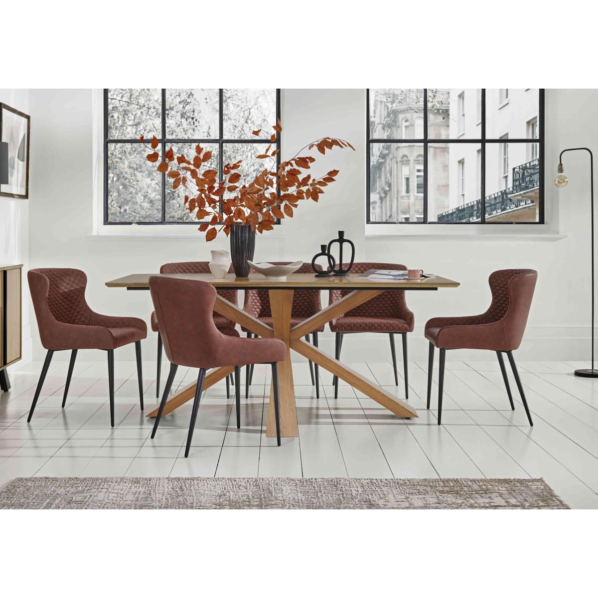 If you love industrial style but prefer a refined look to a rustic one, you’ll appreciate our extensive Hanoi range of dining room furniture. Showcasing light oak lacquered veneers and a choice of wood and metal table bases, this sleek and well-finished range includes a really wide choice of dining sets with versatile seating options – the curved dining chairs and dining bench are upholstered in faux leather in a choice of colour – as well as a sideboard and occasional tables. We think you’ll also appreciate the great-value pricing, a fact that makes it even easier to bring home the high-quality and well-crafted dining set and dining room furniture that you’ve always wanted. The Hanoi range is exclusively available at Furniture Village. Searching for a wood dining table that’s a classic with a stylish edge? This could be the one. The oak veneer top has a lovely lacquered finish and the star-shaped wooden base is very much on-trend. Why you'll love it This dining table with wooden base will always be in style. Top-quality industrial style at a great price. Beautiful lacquered light oak veneer top. Striking wooden star-shaped base. Also available as an extending dining table and with a metal base. Only at Furniture Village. This dining table with wooden base is part of our Hanoi range. What you need to know Seats 6. Oak veneer top, solid wood frame, wood base. Every piece of oak veneer has unique and natural marks, knots and colour variation. Avoid placing in direct sunlight or close to a heat source. We recommend using coasters and placemats at all times. Our extensive Hanoi range includes dining tables, dining sets, chairs, benches and more.