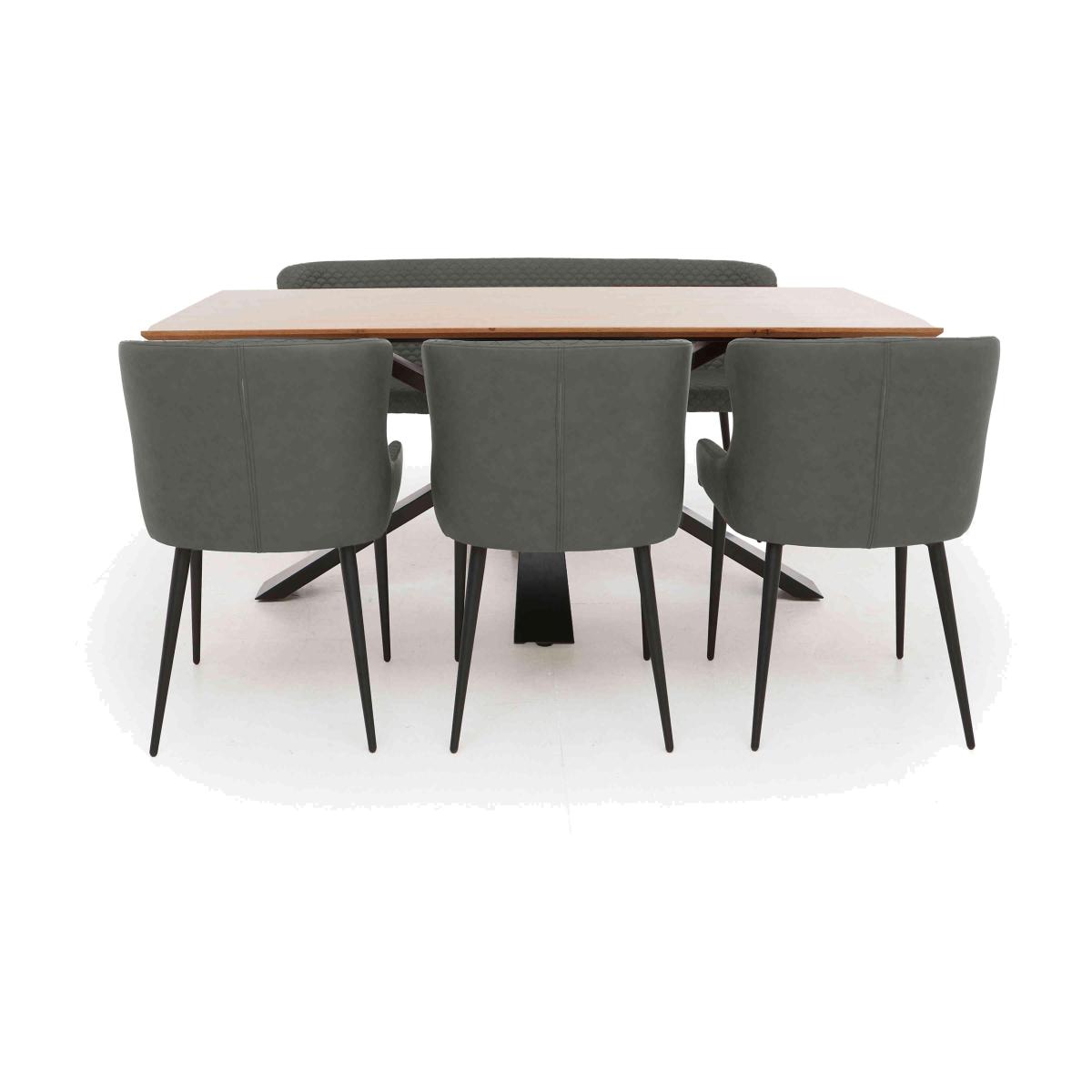 If you love industrial style but prefer a refined look to a rustic one, you’ll appreciate our extensive Hanoi range of dining room furniture. Showcasing light oak lacquered veneers and a choice of wood and metal table bases, this sleek and well-finished range includes a really wide choice of dining sets with versatile seating options – the curved dining chairs and dining bench are upholstered in faux leather in a choice of colour – as well as a sideboard and occasional tables. We think you’ll also appreciate the great-value pricing, a fact that makes it even easier to bring home the high-quality and well-crafted dining set and dining room furniture that you’ve always wanted. The Hanoi range is exclusively available at Furniture Village. With its three chairs and equally stylish dining bench, this dining set makes entertaining easy. And we think your guests will love the sleek oak veneer and metal dining table. Why you'll love it Dining set has a bold metal base and comes with versatile and stylish seating. Top-quality industrial style at a great price. Table has a beautiful lacquered light oak veneer top. Striking metal star-shaped base. Seat 2 more in seconds with the super-easy butterfly extension mechanism. With 3 dining chairs and a bench. Faux leather upholstery in a choice of colours. Elegant curved silhouettes with supportive backs and low arms. Quilted-effect stitching and slender, tapered black metal legs. This dining set is also available with an extending dining table and with a wooden base. Only at Furniture Village. This dining table, chairs and bench set is part of our Hanoi range. What you need to know Dining chairs and bench have foam cushioning. Dining bench seats 3 adults. Table seats 6 and extends to seat 8. Oak veneer top, solid wood frame, metal base. Every piece of oak veneer has unique and natural marks, knots and colour variation. Avoid placing in direct sunlight or close to a heat source. We recommend using coasters and placemats at all times. Our extensive Hanoi range includes dining tables, dining sets, chairs, benches and more.
