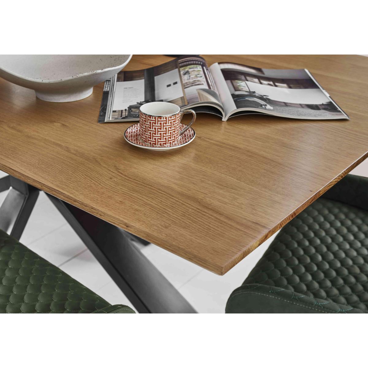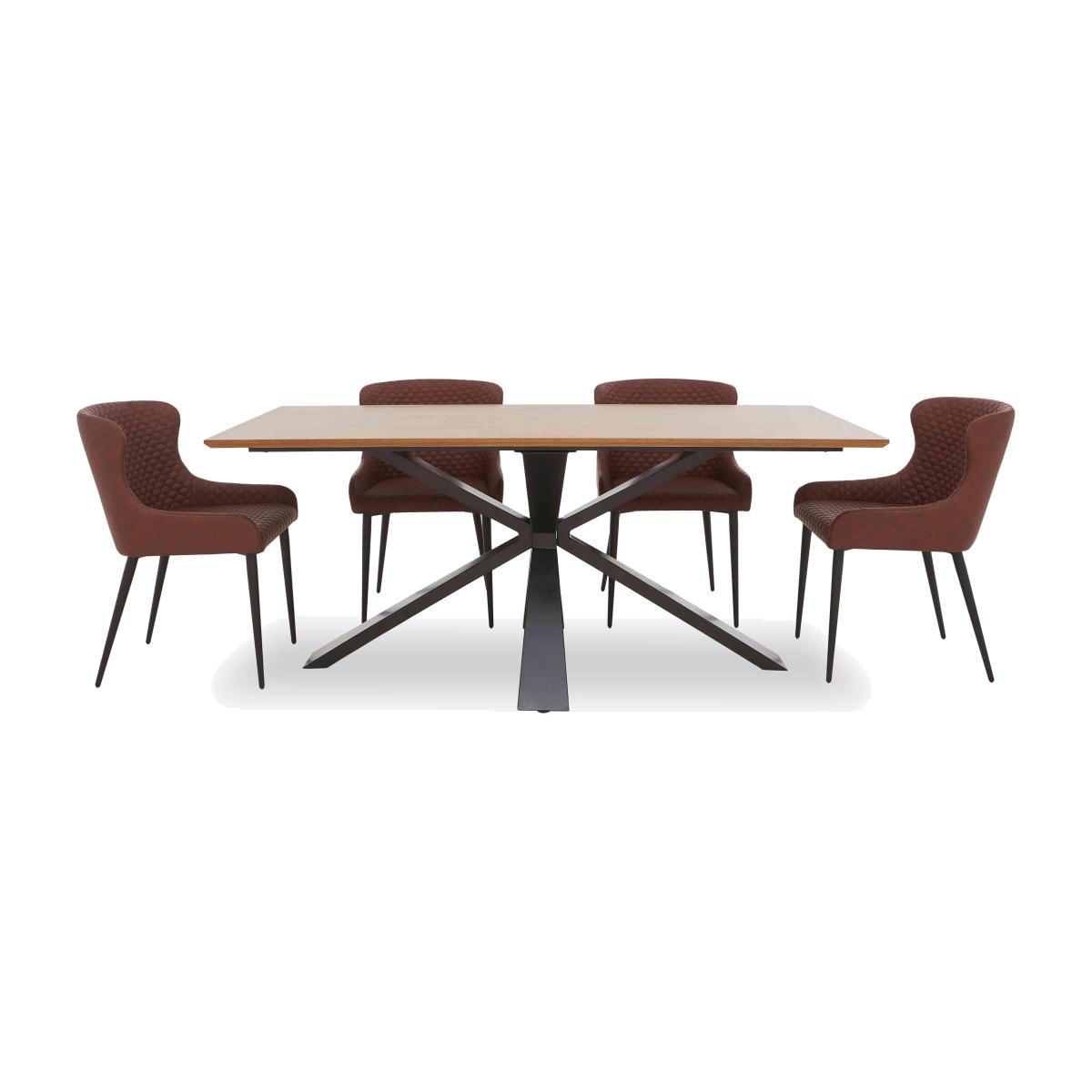 If you love industrial style but prefer a refined look to a rustic one, you’ll appreciate our extensive Hanoi range of dining room furniture. Showcasing light oak lacquered veneers and a choice of wood and metal table bases, this sleek and well-finished range includes a really wide choice of dining sets with versatile seating options – the curved dining chairs and dining bench are upholstered in faux leather in a choice of colour – as well as a sideboard and occasional tables. We think you’ll also appreciate the great-value pricing, a fact that makes it even easier to bring home the high-quality and well-crafted dining set and dining room furniture that you’ve always wanted. The Hanoi range is exclusively available at Furniture Village. The combination of wood, metal and elegant upholstered dining chairs in this dining set just looks right. And that star-shaped base is so on trend. Why you'll love it Bold dining table meets elegant dining chairs in this just-perfect dining set. Top-quality industrial style at a great price. Table has a beautiful lacquered light oak veneer top. Striking metal star-shaped base. Comes with 4 faux leather dining chairs in a choice of colours. Elegant curved silhouettes with supportive backs and low arms. Quilted-effect stitching and slender, tapered black metal legs. This dining set is also available with an extending dining table and with a wooden base. Only at Furniture Village. This dining table and chairs set is part of our Hanoi range. What you need to know Dining chairs have foam seat cushioning. Table seats 6. Oak veneer top, solid wood frame, metal base. Every piece of oak veneer has unique and natural marks, knots and colour variation. Avoid placing in direct sunlight or close to a heat source. We recommend using coasters and placemats at all times. Our extensive Hanoi range includes dining tables, dining sets, chairs, benches and more.