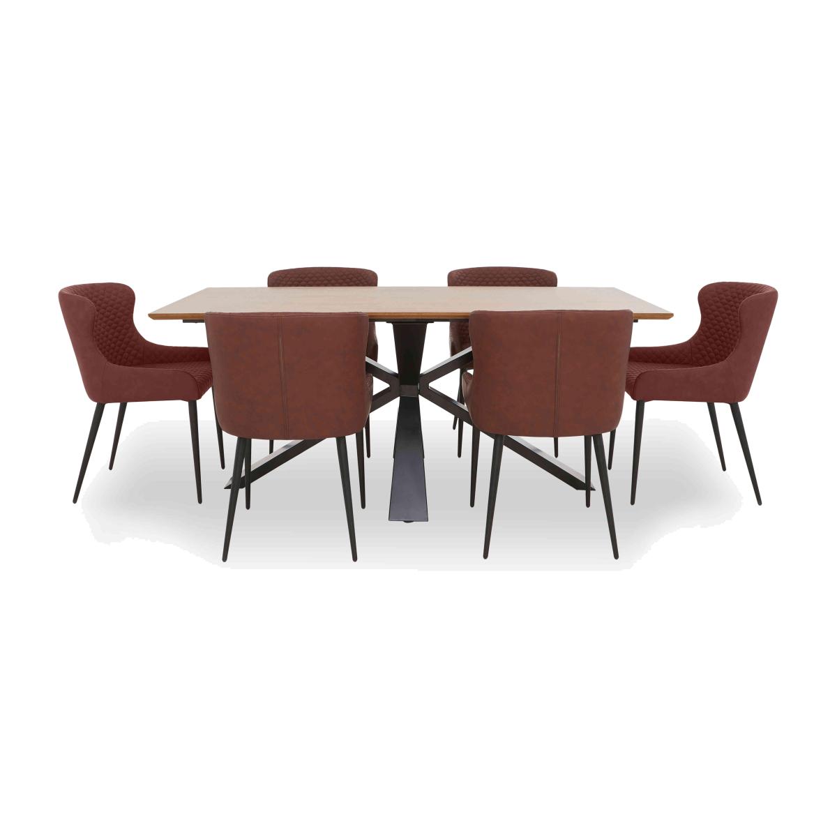 If you love industrial style but prefer a refined look to a rustic one, you’ll appreciate our extensive Hanoi range of dining room furniture. Showcasing light oak lacquered veneers and a choice of wood and metal table bases, this sleek and well-finished range includes a really wide choice of dining sets with versatile seating options – the curved dining chairs and dining bench are upholstered in faux leather in a choice of colour – as well as a sideboard and occasional tables. We think you’ll also appreciate the great-value pricing, a fact that makes it even easier to bring home the high-quality and well-crafted dining set and dining room furniture that you’ve always wanted. The Hanoi range is exclusively available at Furniture Village. If you love industrial style but require a touch of elegance, this dining set is for you. Its oak and metal dining table is paired with six beautiful and very comfortable dining chairs. Why you'll love it Elegant yet urban, this fabulous dining set ticks all the boxes. Top-quality industrial style at a great price. Table has a beautiful lacquered light oak veneer top. Striking metal star-shaped base. Comes with 6 faux leather dining chairs in a choice of colours. Elegant curved silhouettes with supportive backs and low arms. Quilted-effect stitching and slender, tapered black metal legs. This dining set is also available with an extending dining table and with a wooden base. Only at Furniture Village. This dining table and chairs set is part of our Hanoi range. What you need to know Dining chairs have foam seat cushioning. Table seats 6. Oak veneer top, solid wood frame, metal base. Every piece of oak veneer has unique and natural marks, knots and colour variation. Avoid placing in direct sunlight or close to a heat source. We recommend using coasters and placemats at all times. Our extensive Hanoi range includes dining tables, dining sets, chairs, benches and more.