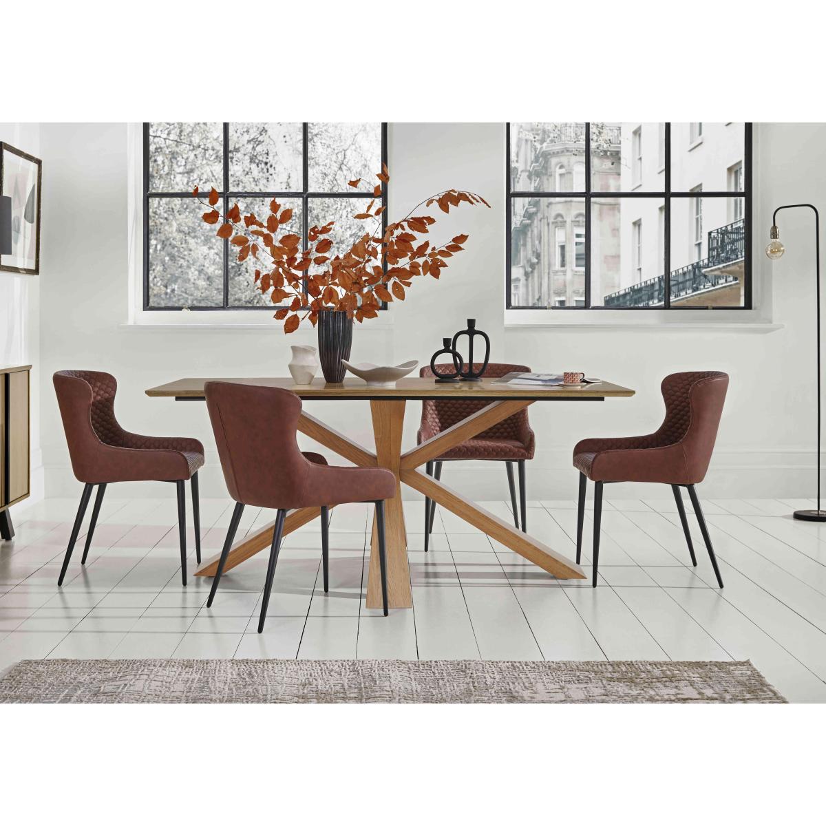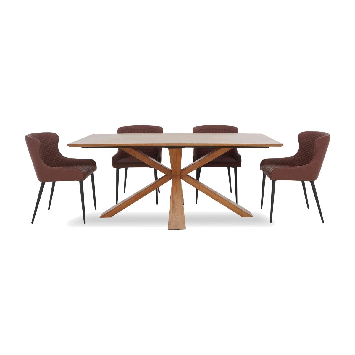 If you love industrial style but prefer a refined look to a rustic one, you’ll appreciate our extensive Hanoi range of dining room furniture. Showcasing light oak lacquered veneers and a choice of wood and metal table bases, this sleek and well-finished range includes a really wide choice of dining sets with versatile seating options – the curved dining chairs and dining bench are upholstered in faux leather in a choice of colour – as well as a sideboard and occasional tables. We think you’ll also appreciate the great-value pricing, a fact that makes it even easier to bring home the high-quality and well-crafted dining set and dining room furniture that you’ve always wanted. The Hanoi range is exclusively available at Furniture Village. The perfect industrial dining set? This one has a really beautiful oak veneer table with a wooden star-shaped base and comes with four on-trend yet very comfy dining chairs. Why you'll love it Enjoy stylish family dining with this dining set. Top-quality industrial style at a great price. Table has a beautiful lacquered light oak veneer top. Striking wooden star-shaped base. Comes with 4 faux leather dining chairs in a choice of colours. Elegant curved silhouettes with supportive backs and low arms. Quilted-effect stitching and slender, tapered black metal legs. This dining set is also available with an extending dining table and with a metal base. Only at Furniture Village. This dining table and chairs set is part of our Hanoi range. What you need to know Dining chairs have foam seat cushioning. Table seats 6. Oak veneer top. Solid wood frame and base. Every piece of oak veneer has unique and natural marks, knots and colour variation. Avoid placing in direct sunlight or close to a heat source. We recommend using coasters and placemats at all times. Our extensive Hanoi range includes dining tables, dining sets, chairs, benches and more.