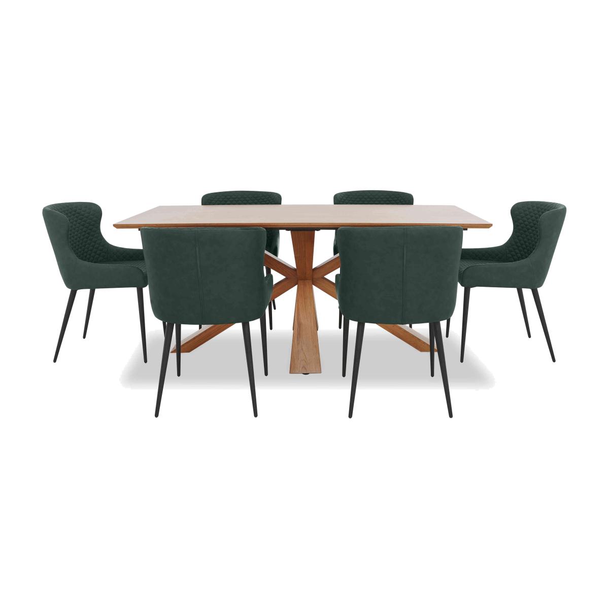 If you love industrial style but prefer a refined look to a rustic one, you’ll appreciate our extensive Hanoi range of dining room furniture. Showcasing light oak lacquered veneers and a choice of wood and metal table bases, this sleek and well-finished range includes a really wide choice of dining sets with versatile seating options – the curved dining chairs and dining bench are upholstered in faux leather in a choice of colour – as well as a sideboard and occasional tables. We think you’ll also appreciate the great-value pricing, a fact that makes it even easier to bring home the high-quality and well-crafted dining set and dining room furniture that you’ve always wanted. The Hanoi range is exclusively available at Furniture Village. Upgrade your dining room for a really great price with this industrial dining set. The dining table seats six and has a striking star-shaped base. This dining set comes with six beautiful dining chairs. Why you'll love it This dining set with 6 beautiful dining chairs is perfect in every way. Top-quality industrial style at a great price. Table has a beautiful lacquered light oak veneer top. Striking wooden star-shaped base. Comes with 6 faux leather dining chairs in a choice of colours. Elegant curved silhouettes with supportive backs and low arms. Quilted-effect stitching and slender, tapered black metal legs. This dining set is also available with an extending dining table and with a metal base. Only at Furniture Village. This dining table and chairs set is part of our Hanoi range. What you need to know Dining chairs have foam seat cushioning. Table seats 6. Oak veneer top. Solid wood frame and base. Every piece of oak veneer has unique and natural marks, knots and colour variation. Avoid placing in direct sunlight or close to a heat source. We recommend using coasters and placemats at all times. Our extensive Hanoi range includes dining tables, dining sets, chairs, benches and more.