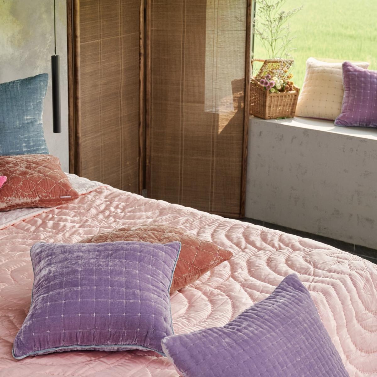 Hanoi Square Cushion Crafted from luxury Velvet fabric, this Hanoi cushion features hand embroidery Vietnamese traditional pattern and a soft touch of silk on the other side. A colour pop for any sofa or bed curation to brighten up your sleeping space. Inner feather pad included. H:60cm, W:60cm 65% Silk, 35% Viscose