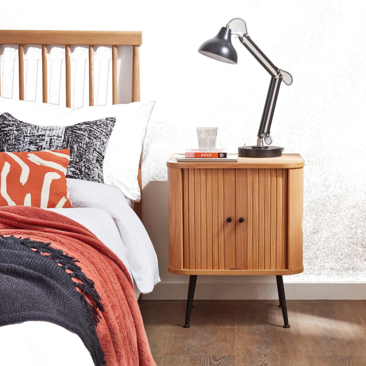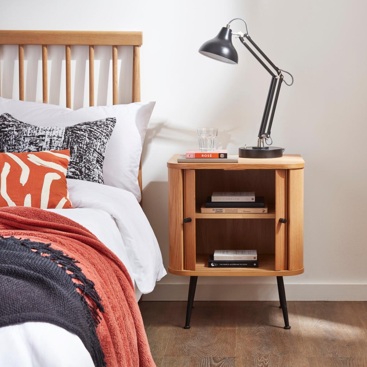 I’m a fan of the Hansen bedside table for its clean lines and smart blend of warm oak slats with slender black metal legs - it feels right at home in Scandi-inspired, mid-century or understated contemporary schemes. The double-door cabinet offers discreet storage for chargers, books or bedtime essentials, so you can keep surfaces clutter-free. Styling-wise, balance its natural tone with a black-metal or brass-finished lamp for a coordinated look, then add a small stack of your favourite reads, a simple ceramic vase or a low-maintenance plant. Keep accessories minimal and varied in height to let the table’s timber grain and ribbed detailing stand out.