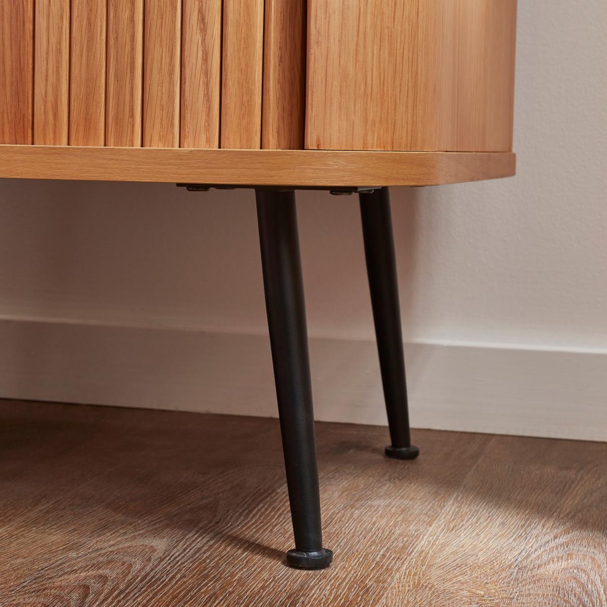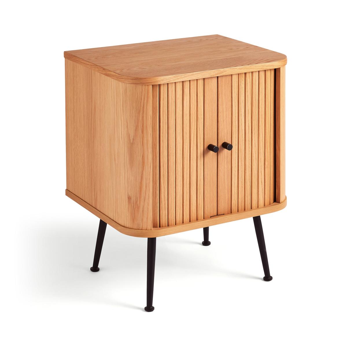Dunelm Exclusive - Designed and Developed by Dunelm* Wooden bedside table* Features 2 doors with shelves for storage* Part assembly required This bedside table features thoughtfully designed slatted doors that effortlessly glide open, ensuring easy access to your essentials. The elegant spindle-shaped, tapered legs pay homage to the sleek and minimalist design principles that define Scandinavian style.