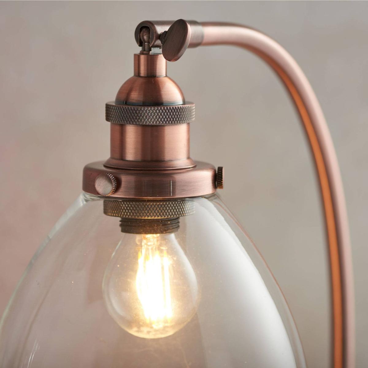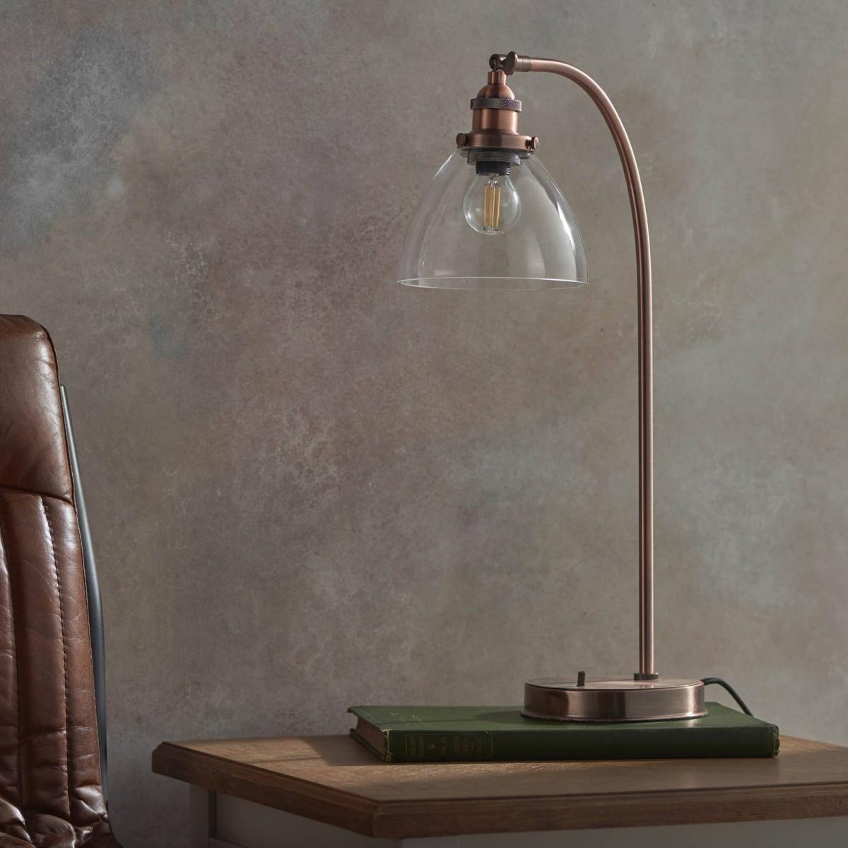 Industrial table lamp boasting a copper finish. A stunning addition to your home, this table lamp is part of the Hansen range from Endon. Featuring a clear glass dome shaped shade, this industrial fitting boasts copper detailing throughout and features an authentic knurled lamp holder. Complete with an adjustable knuckle and an accessible on/off switch located on the base plate, this gorgeous piece is sure to look amazing in hallways, living rooms and bedrooms. Industrial table lamp boasting a copper finish. A stunning addition to your home, this table lamp is part of the Hansen range from Endon. Featuring a clear glass dome shaped shade, this industrial fitting boasts copper detailing throughout and features an authentic knurled lamp holder. Complete with an adjustable knuckle and an accessible on/off switch located on the base plate, this gorgeous piece is sure to look amazing in hallways, living rooms and bedrooms.