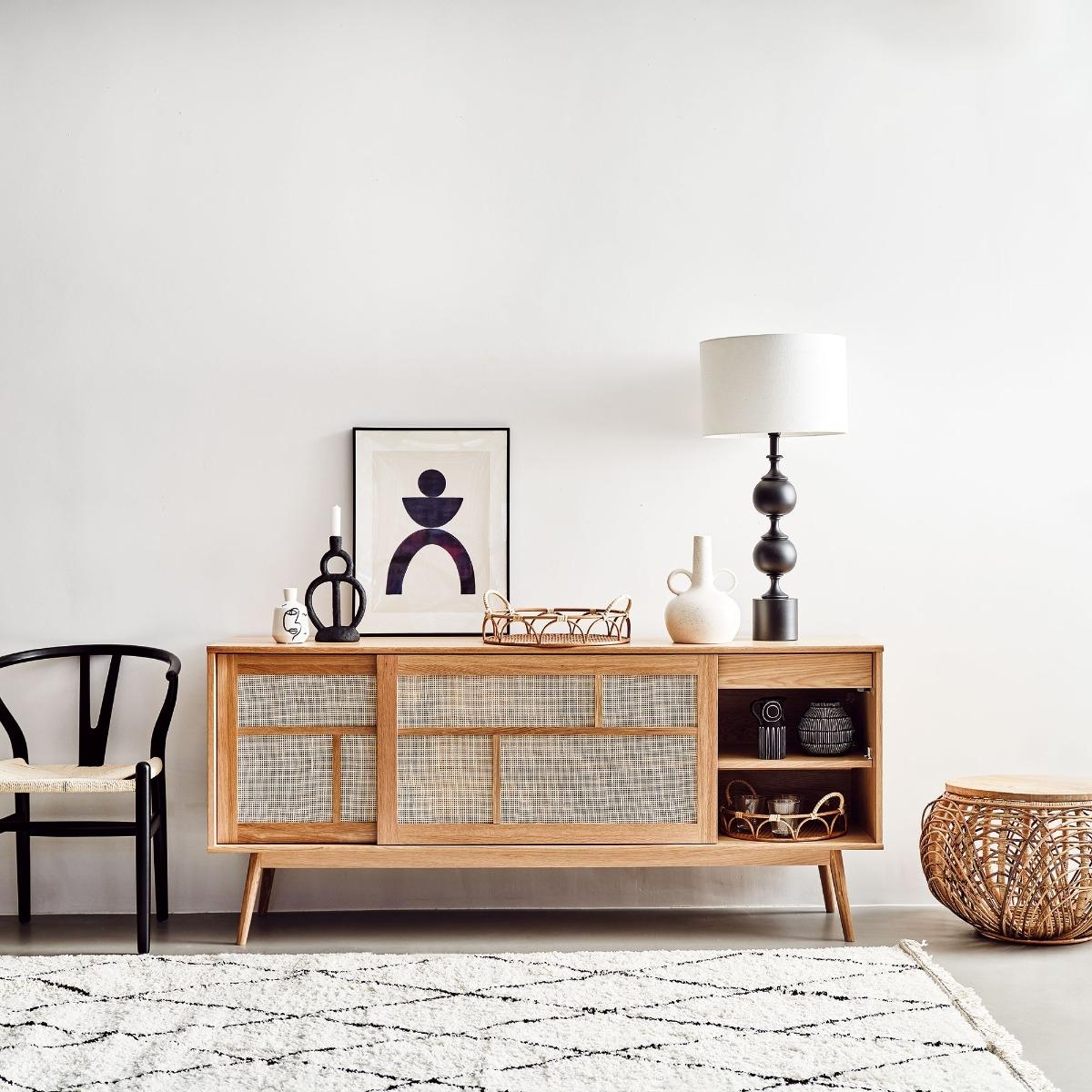 Design. The Hansen Sideboard will add clean lines and a fresh neutral palette to your dining area, hallway or living room. Complete with gorgeous rattan detailing to the front, this simplistic design will turn heads in a subtle manor. Slide open the door to the Hansen Sideboard to find plenty of room to store away items and keep your space neat and tidy.