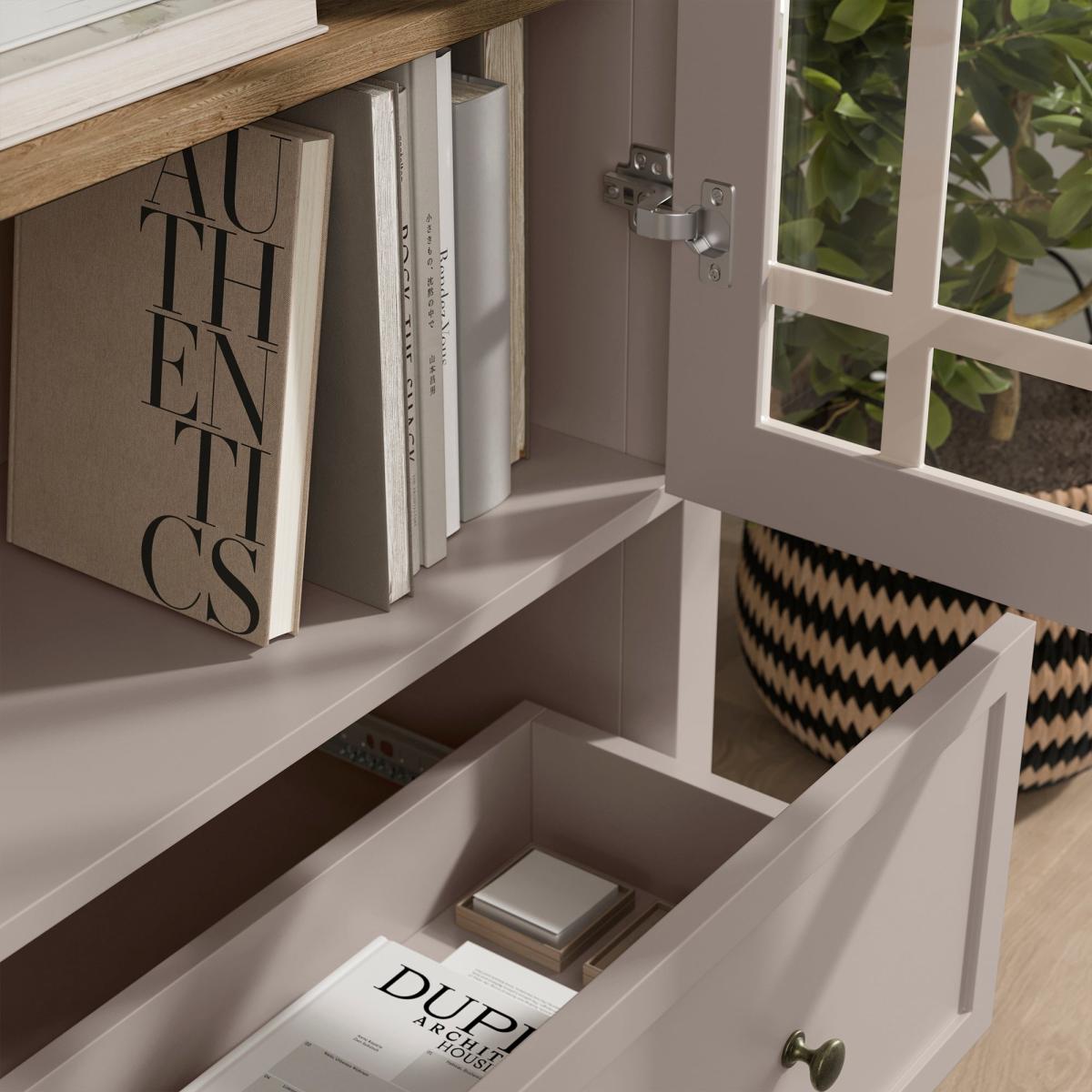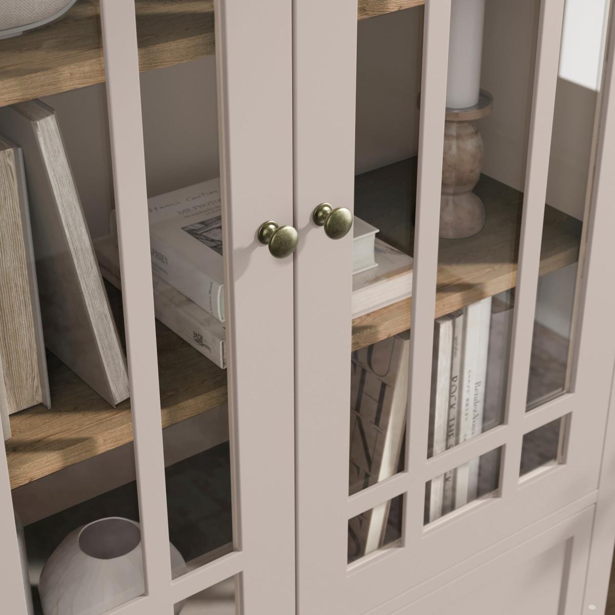 I’m a fan of this tall display cabinet for its clean lines and muted stone-grey finish, which sit neatly in both contemporary and more traditional schemes. The oak-effect shelves add warmth, so it works equally well in Scandi-inspired rooms or as a soft counterpoint in a pared-back, monochrome living space. To style it, organise items in small clusters of three or five, mix books with ceramics or glassware for varied height and texture, and leave some gaps so the arrangement feels relaxed rather than overcrowded. Adding a small LED strip light to the top shelf can also highlight key pieces and lend a cosy glow in the evening.