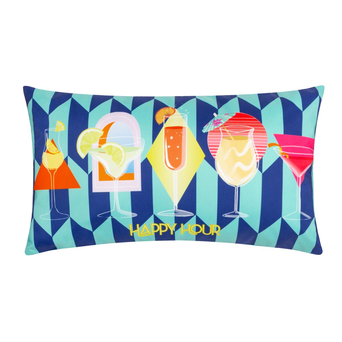 This Happy Hour cushion is a fun, contemporary choice for outdoor seating areas, particularly if you’re aiming for a lively, relaxed vibe. The vibrant blue shades and playful drink illustrations make it perfect for summer patios, garden lounges, or even casual balcony settings. It works well layered with neutral tones or other patterned textiles to add colour and interest without overwhelming. Practical tips include pairing it with rattan or wooden outdoor furniture for a natural look, and storing it indoors when not in use to prolong its appearance. Its bold design makes it a great statement piece that can elevate an outdoor space into a social, inviting spot.