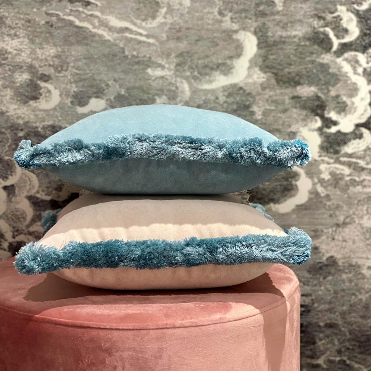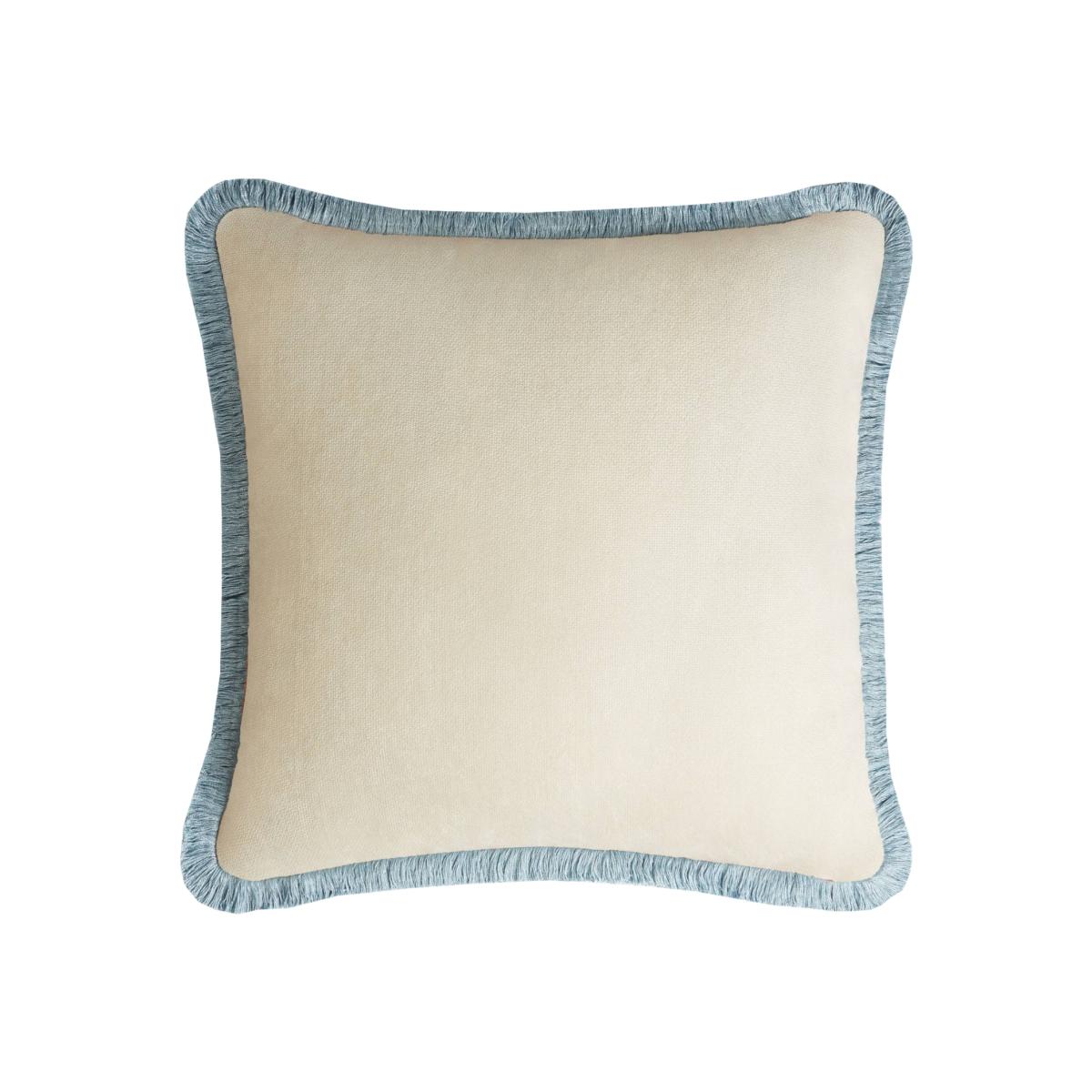 This exquisite square cushion will suit any decor with its neutral tones and refined allure. Padded with polyester fiber, the velvet cover (removable) boasts an elegant dirty white color accented with a border of light blue trimming, resulting in an undoubtedly versatile design. Fabric : 100% PL Velvet Padding : 100% PL Dry wash Machine Wash 40° Size: cm 40x40 Customazible for colour and size