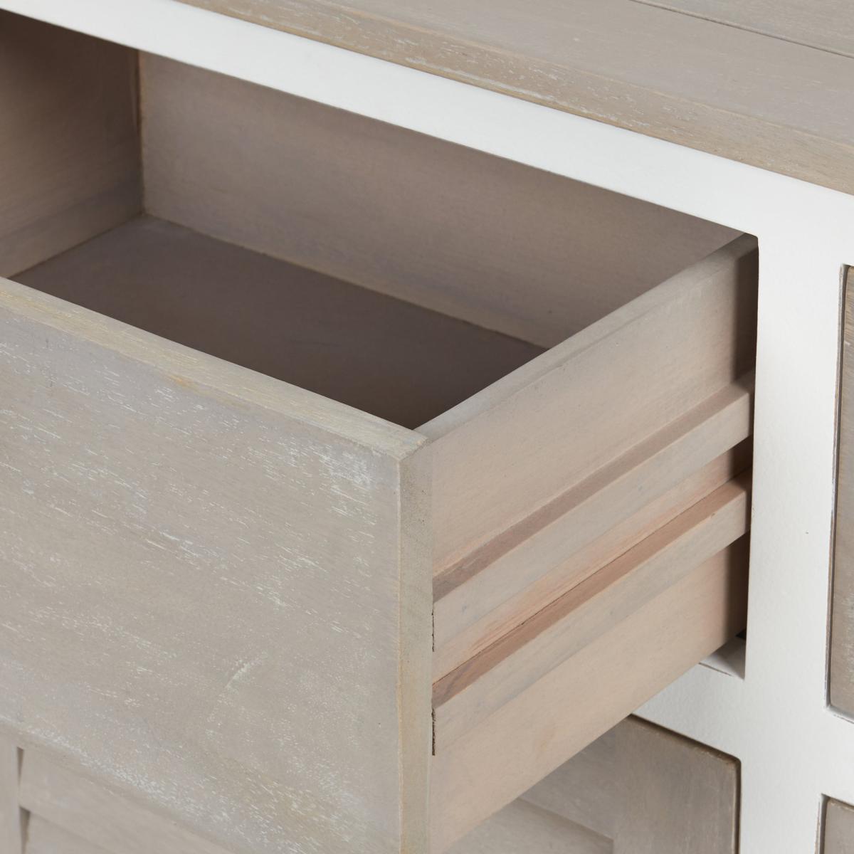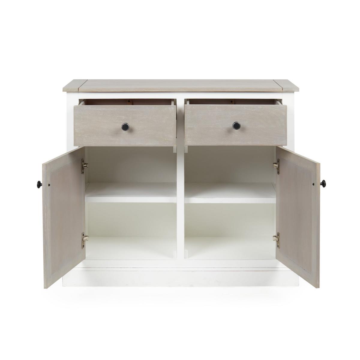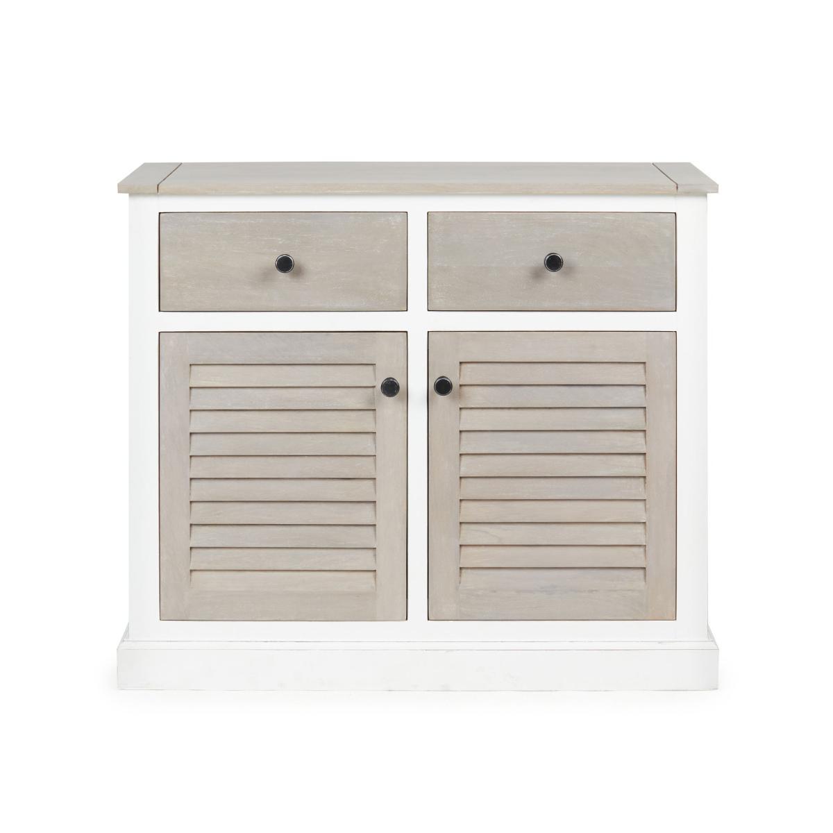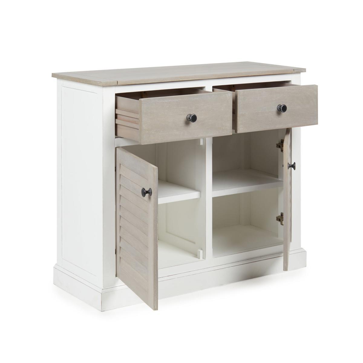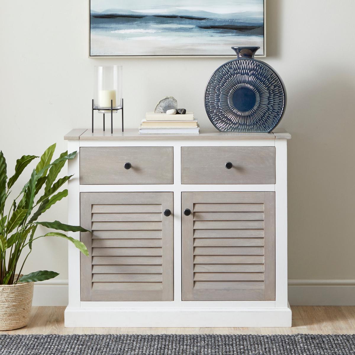 Dunelm Exclusive - Designed and Developed by Dunelm. Beautifully crafted from mango and beech wood the Harbor range features a stunning matt white painted finish, paired with black antique-style handles and lightly distressed edges for a soft and elegant finish. Perfect for bringing a light and airy feel to your home decor, this range is also supplied fully assembled for added convenience. Decorated with louvre style doors for an elegant look, the Harbor small sideboard offers plenty of storage space, featuring two large cupboards with fixed shelves, and two spacious drawers with wooden glide runners. Please ensure the product is fixed to the wall using the supplied anti-tip kit.