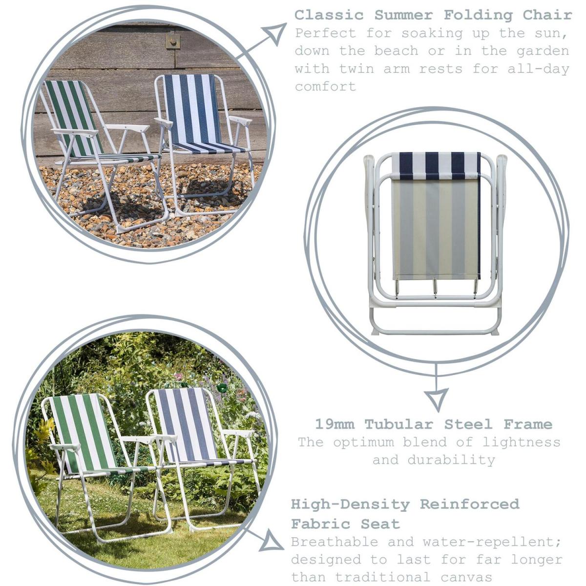 Bring some classic British Summertime style to your back garden this summer with this set of 2 Folding Metal Beach and Garden Camping Armchairs from Harbour Housewares. Crafted to a design steeped in tradition, the vibrant striped canvas that forms the business part of these seats clings tightly around a strong metal frame that offers the perfect blend of easy-carry lightness and long lasting durability. Two solid arm rests allow you to sit back and relax in comfort and confidence, while the breathable nature of the canvas seat helps protect against your back getting too hot. When the day is done, these chairs fold completely flat for simple, space-saving storage. With a variety of colours available, this set of 2 Folding Metal Beach and Garden Camping Armchairs from Harbour Housewares is sure to become your perfect summer companion. Shop the range today.