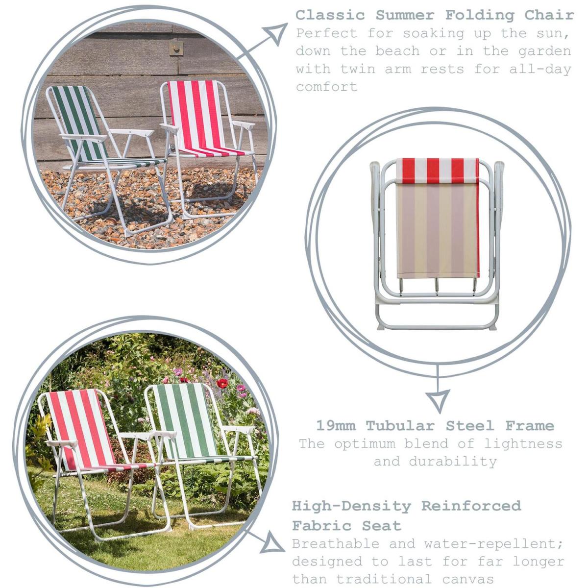 Bring some classic British Summertime style to your back garden this summer with this set of 2 Folding Metal Beach and Garden Camping Armchairs from Harbour Housewares. Crafted to a design steeped in tradition, the vibrant striped canvas that forms the business part of these seats clings tightly around a strong metal frame that offers the perfect blend of easy-carry lightness and long lasting durability. Two solid arm rests allow you to sit back and relax in comfort and confidence, while the breathable nature of the canvas seat helps protect against your back getting too hot. When the day is done, these chairs fold completely flat for simple, space-saving storage. With a variety of colours available, this set of 2 Folding Metal Beach and Garden Camping Armchairs from Harbour Housewares is sure to become your perfect summer companion. Shop the range today.