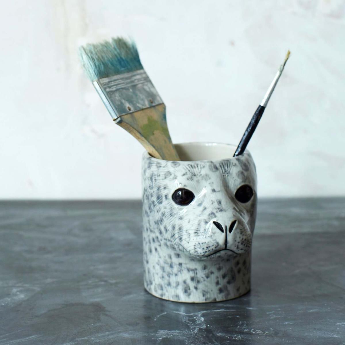 Delicately hand-painted, this ceramic harbour seal pencil pot is a delightful storage holder for your stationery.
