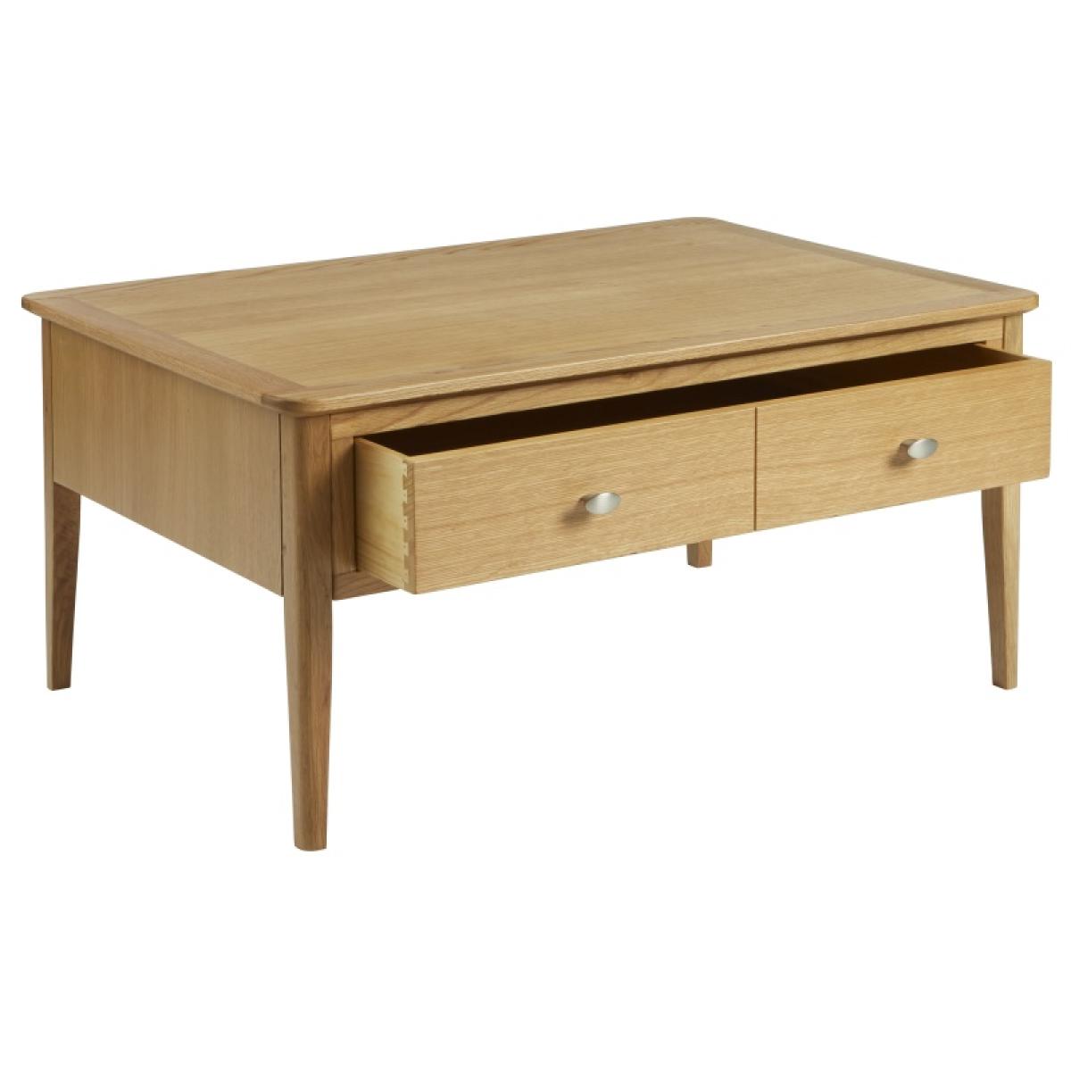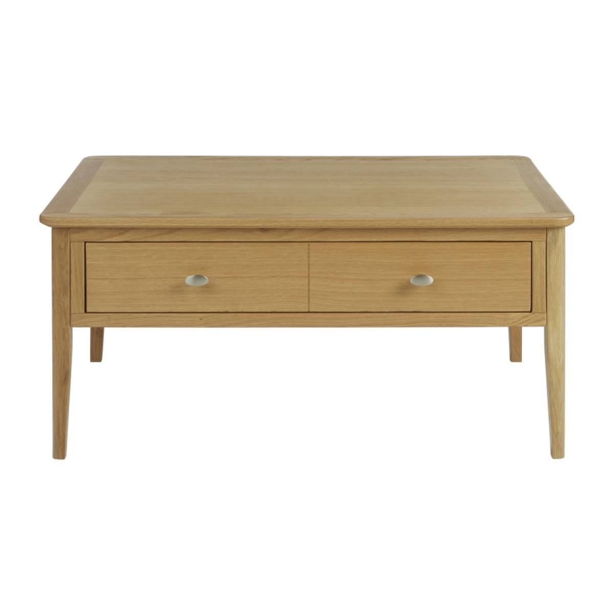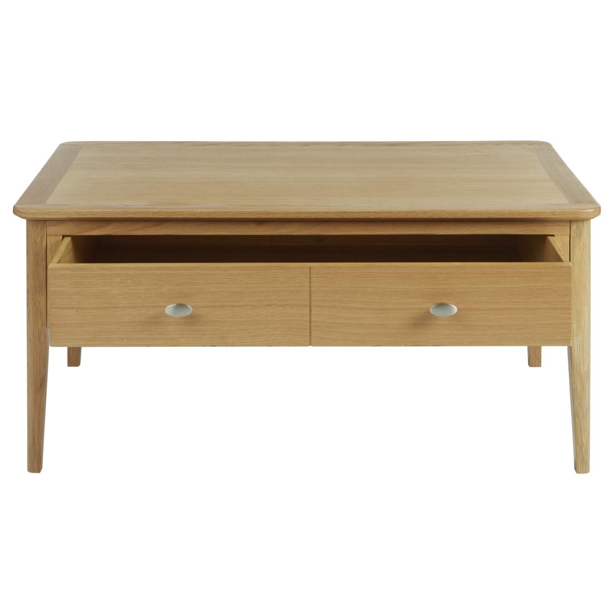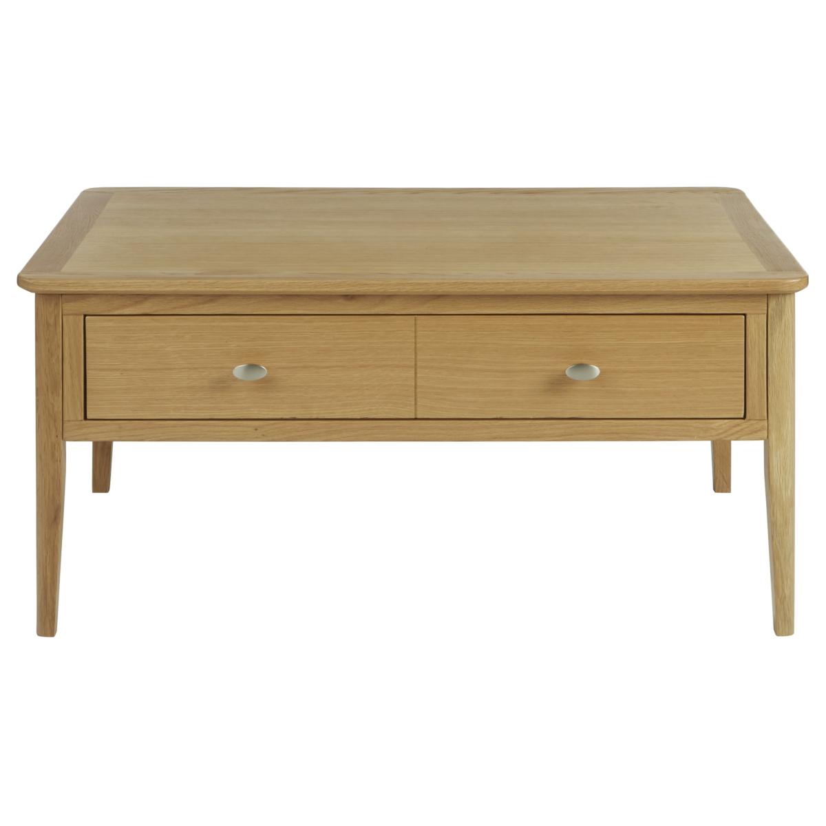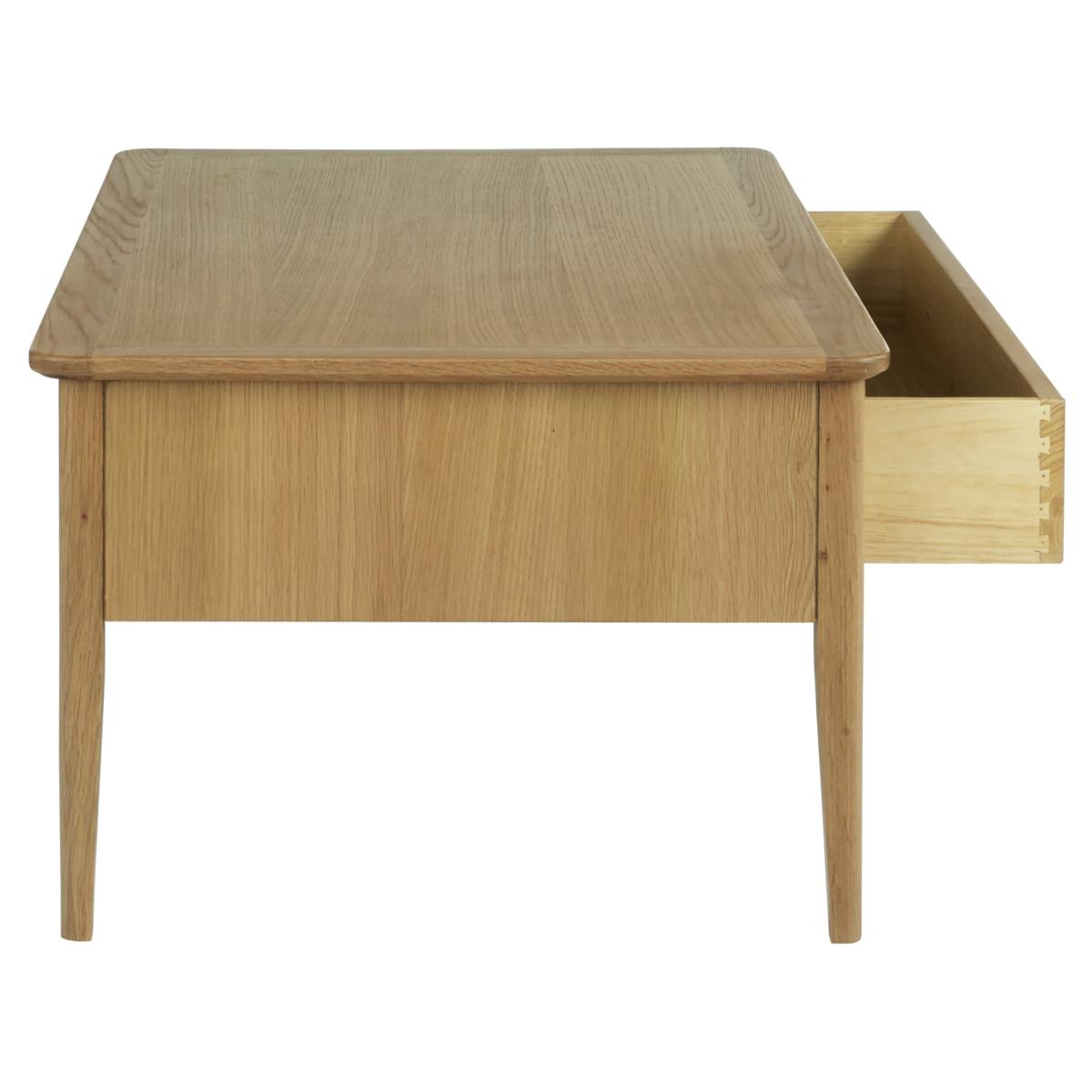 The Hardwick Oak Coffee Table is a great occasional piece for any living space with the additional storage space of the central drawer whilst not taking up much floor space. The Coffee Table will help finish off your living space beautifully. The curved legs and corners, along with the Silver Satin handles add to the beauty of the range. The curved legs and corners of the coffee table help add individuality to the pieces along with the Satin Silver handles, giving this range a contemporary, modern feel. The Hardwick collection is lacquered in a pale oak colour which would compliment any interior decor. The pale finish will help brighten your living area creating a calming ambience. Features: Oak Wood & Veneer Pale Oak Finish 2 Drawers Satin Silver Handles Curved Corners and Tapered Legs Matching furniture available Easy to Clean Assembly Required Specifications: W95 x H44 x D63cm. All screens vary in colour reproduction and whilst every effort has been made to display the colour as accurately as possible it is for guidance only
