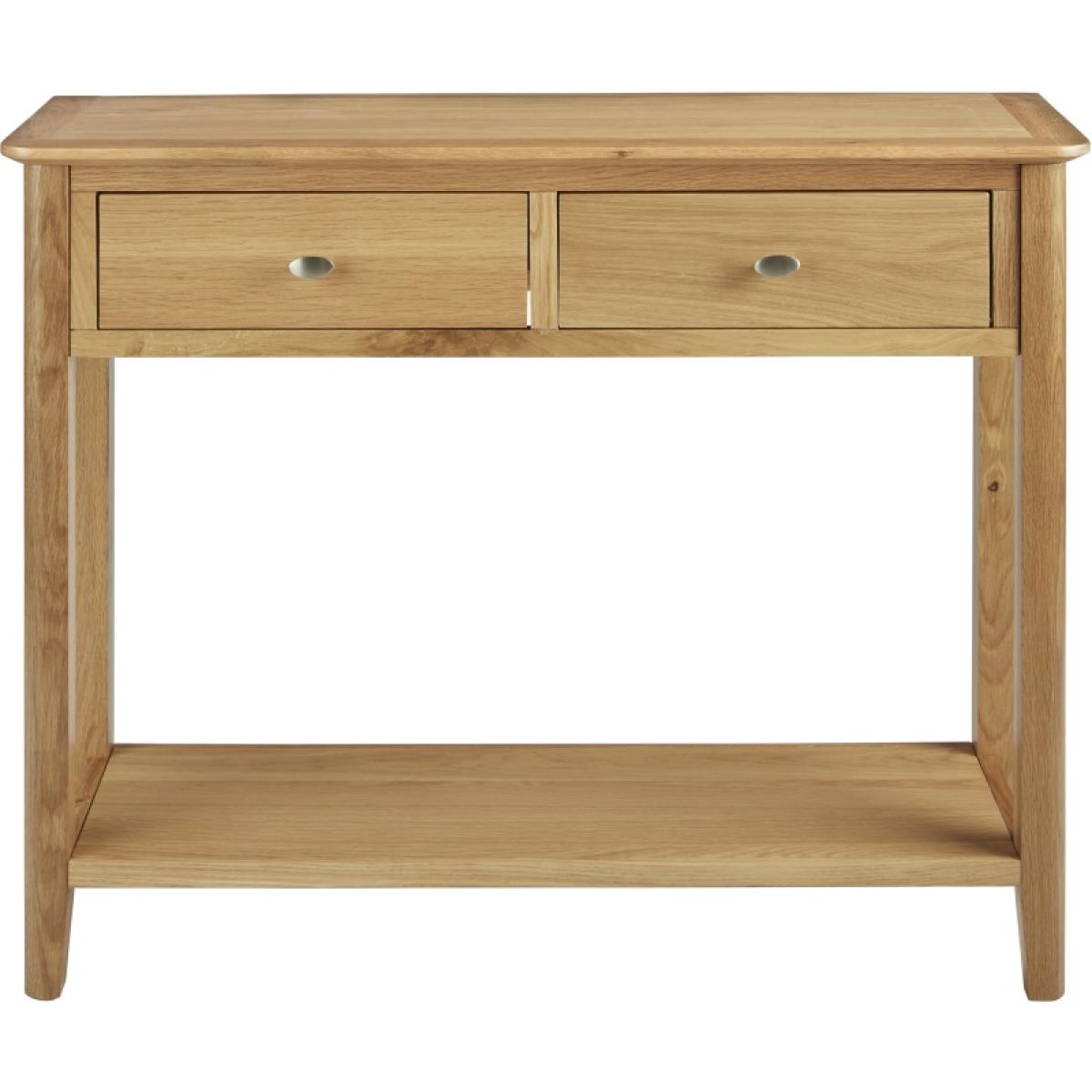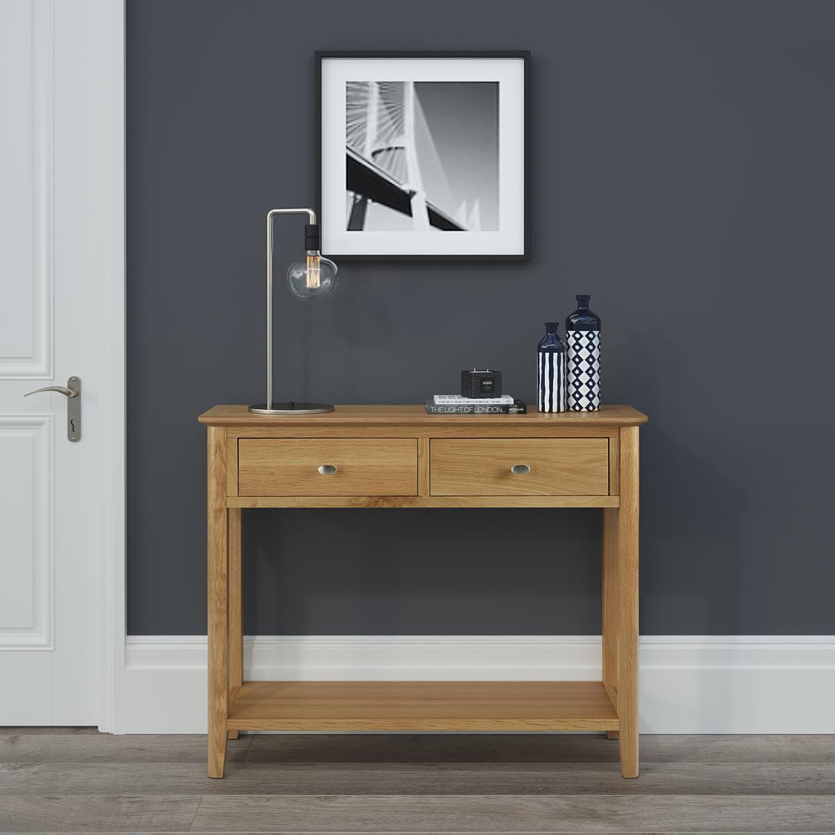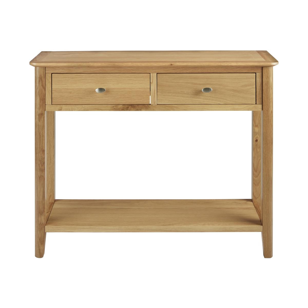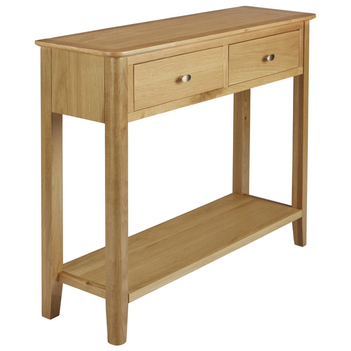 The Hardwick Oak Console Table is a charming and compact piece that will be a perfect addition to your living room or bedroom. The console table combines classic charm with functional elegance, making it a versatile addition to any room. Perfect for entryways, living areas, or hallways, this table is designed to impress while providing practical storage and display space. Crafted from solid oak with a pale oak finish and satin silver handles, it adds a stylish touch to your home. The two drawers offer ample storage for documents and keys, while the spacious tabletop is ideal for a telephone, magazines, books, remote controls, drinks, snacks, and more. Features: Oak Wood & Veneer Pale Oak Finish 2 Drawers Satin Silver Handles Curved Corners and Tapered Legs Matching furniture available Easy to Clean Assembly Required Specifications: W 100cm x D 32cm x H 80cm. All screens vary in colour reproduction and whilst every effort has been made to display the colour as accurately as possible it is for guidance only