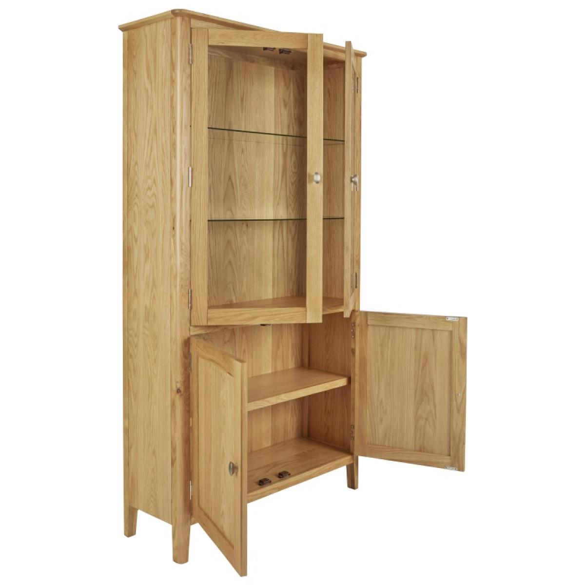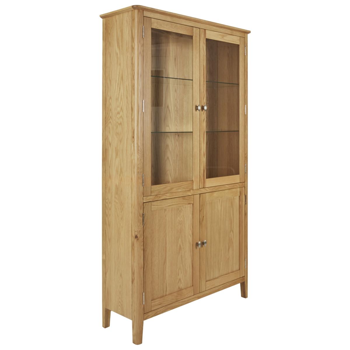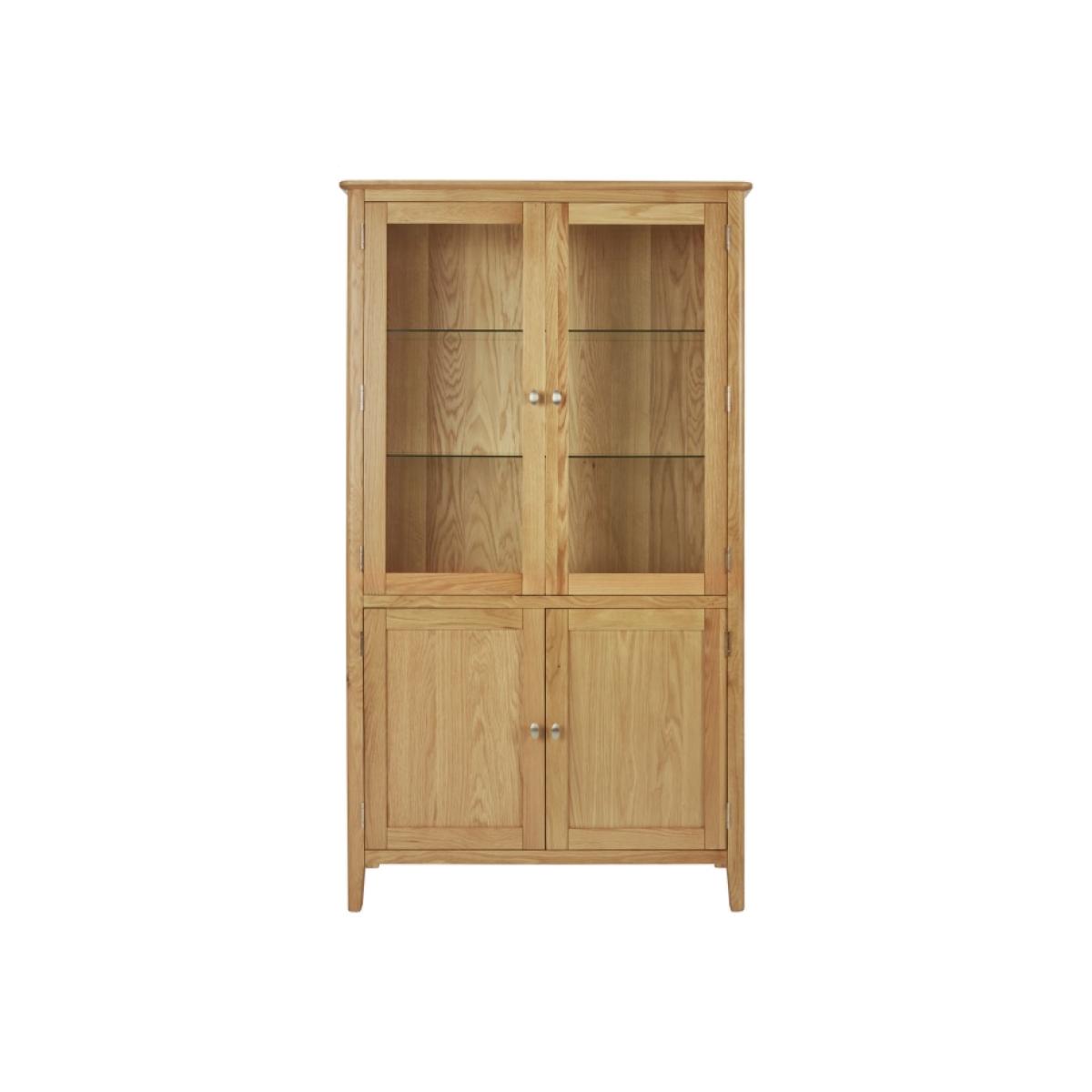 With its elegant design, the Hardwick Oak Display Cabinet is a quality piece of furniture that complements and enhances your living room. Crafted from high-quality solid oak with a pale oak finish and satin silver handles, it offers a premium look. The cabinet features two glazed doors that provide a superb view of your ornaments and two wooden doors for storing glasses or bottles. Curved corners, tapered legs, and glass doors allow sunlight to brighten your display, making it a great addition to your home. Features: Oak Wood & Veneer Pale Oak Finish Satin Silver Handles Curved Corners and Tapered Legs Matching furniture available Easy to Clean Assembly Required Dimensions: Width: 134cm Depth: 34cm  Height: 185cm All screens vary in colour reproduction and whilst every effort has been made to display the colour as accurately as possible it is for guidance only.