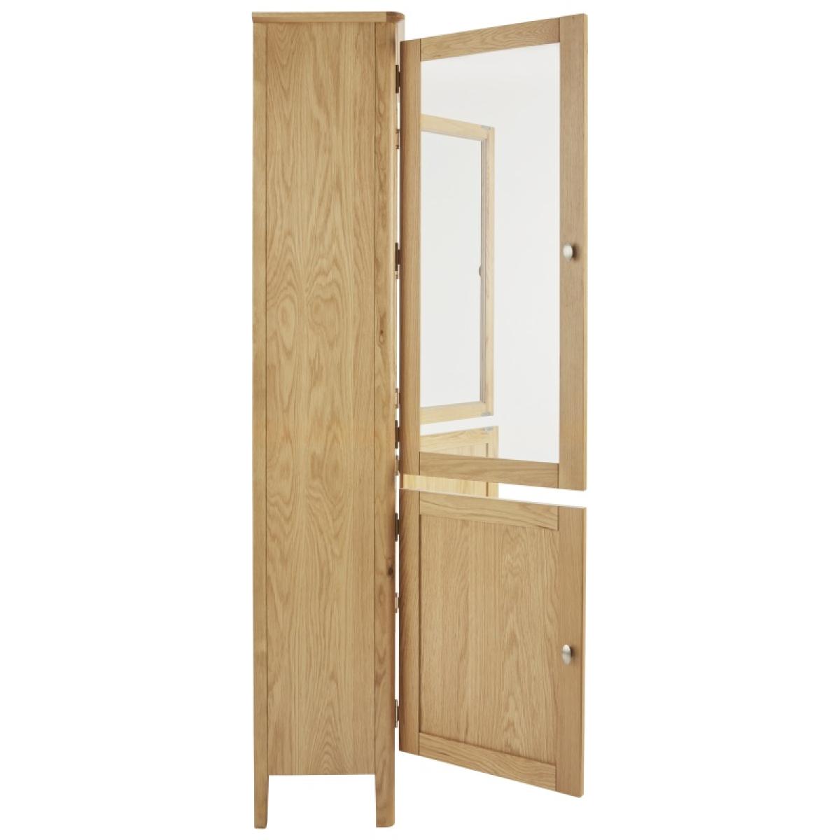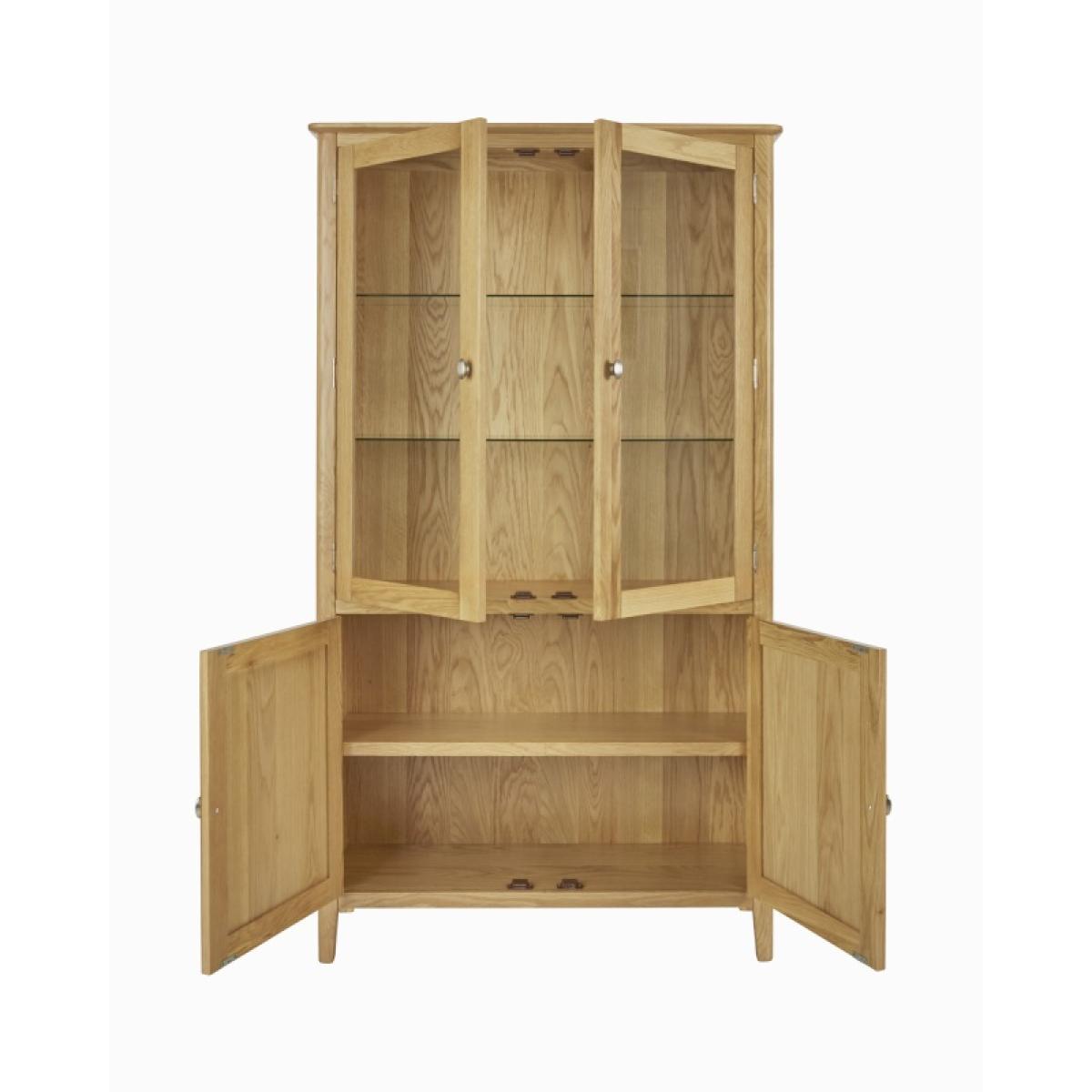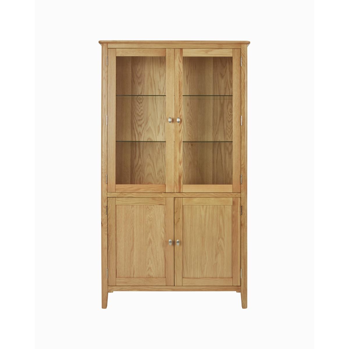With its elegant design, the Hardwick Oak Display Cabinet is a quality piece of furniture that complements and enhances your living room. Crafted from high-quality solid oak with a pale oak finish and satin silver handles, it offers a premium look. The cabinet features two glazed doors that provide a superb view of your ornaments and two wooden doors for storing glasses or bottles. Curved corners, tapered legs, and glass doors allow sunlight to brighten your display, making it a great addition to your home. Features: Oak Wood & Veneer Pale Oak Finish Satin Silver Handles Curved Corners and Tapered Legs Matching furniture available Easy to Clean Assembly Required Dimensions: Width: 134cm Depth: 34cm  Height: 185cm All screens vary in colour reproduction and whilst every effort has been made to display the colour as accurately as possible it is for guidance only.