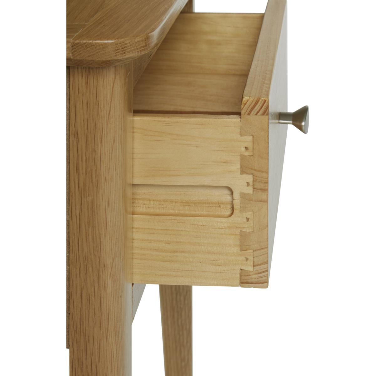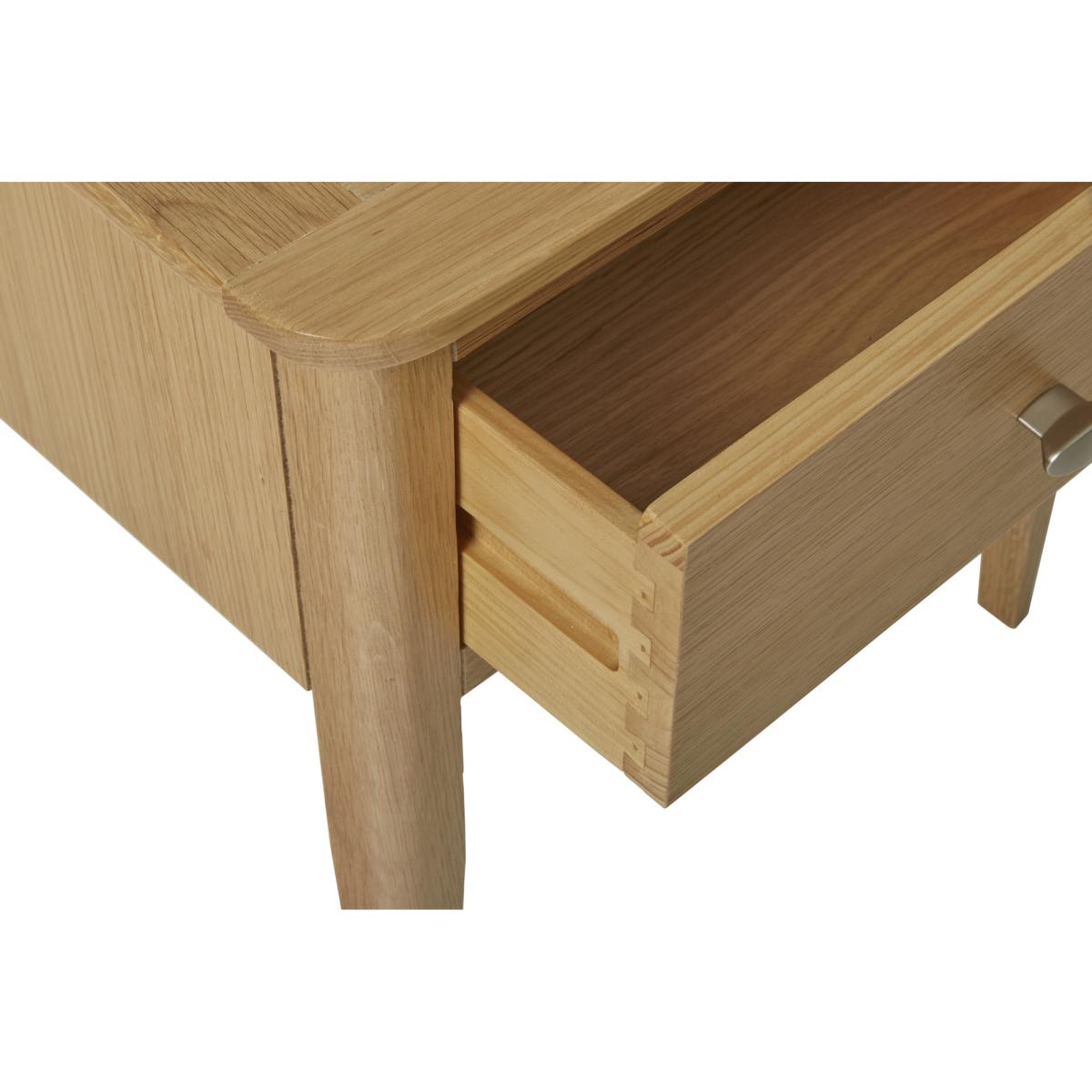I’d pick this oak lamp table for its simple, timeless shape and pale, natural finish - it sits comfortably in Scandi, coastal or modern farmhouse schemes. The compact drawer is handy for stashing remotes or small odds and ends, so your surface stays neat. For styling, team it with a slim-stem lamp and a small plant or vase in muted tones to echo the wood’s warmth. On the lower shelf or beside it, lay a couple of coffee-table books or a textured basket for extra storage without fuss.