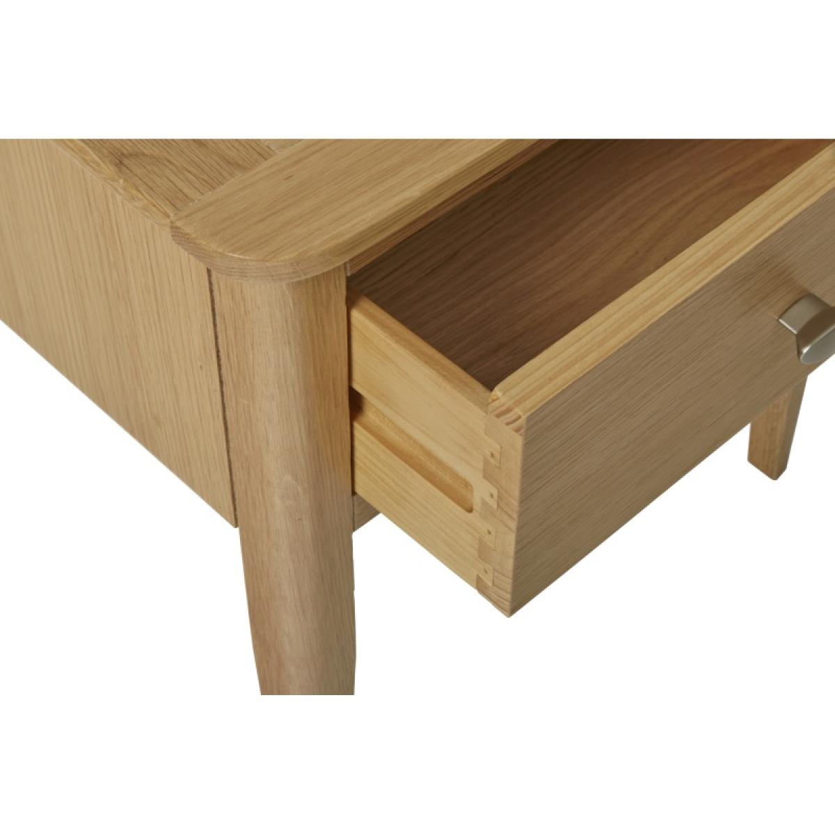 This Hardwick Oak Lamp Table is subtle yet sophisticated, featuring clean lines and solid oak tapered legs and posts. Crafted from oak and veneers, it includes a brushed oval handle that adds contrast and style. This range offers a relaxed, modern oak furniture collection, exuding elegance with its clean lines and gentle curves. Finished in a natural lacquer, the tops are durable.  Features: Oak Wood & Veneer Pale Oak Finish Satin Silver Handles Curved Corners and Tapered Legs Matching furniture available Easy to Clean Assembly Required Dimensions: Width: 45cm Height: 47cm Depth: 45cm All screens vary in colour reproduction and whilst every effort has been made to display the colour as accurately as possible it is for guidance only.
