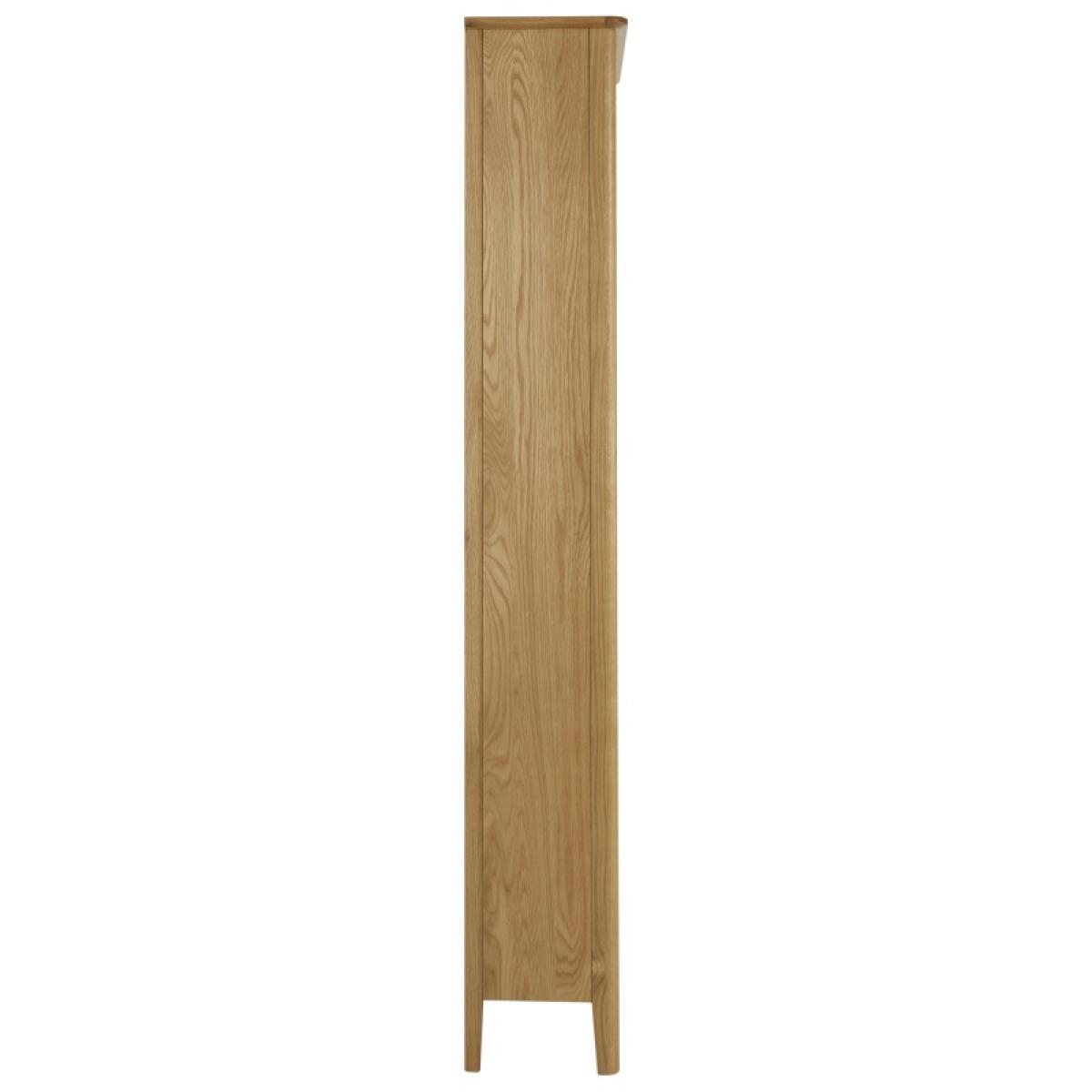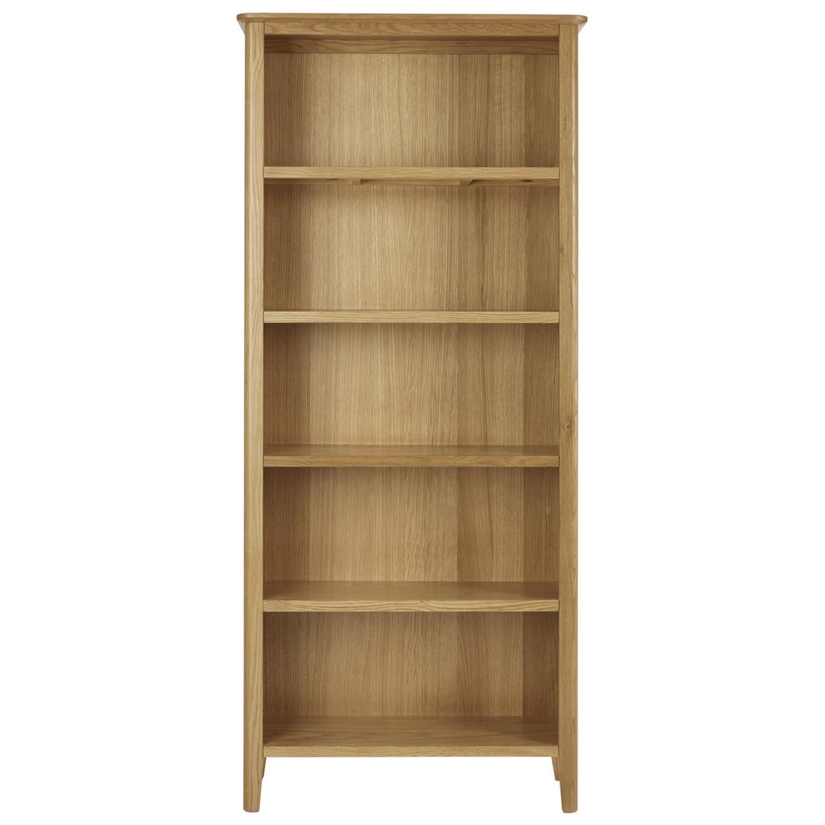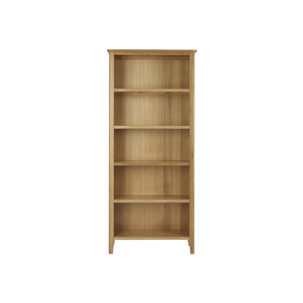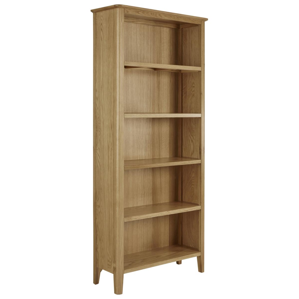 This Hardwick Oak Large Bookcase is a relaxed, modern oak bookcase that exudes elegance with its clean lines and gentle curves. Finished in a natural lacquer, the tops are durable, providing plenty of stylish and flexible bedroom storage. Features: Oak Wood & Veneer Pale Oak Finish Matching furniture available Easy to clean Assembly required Dimensions: Width: 80cm Depth: 28cm Height: 180cm All screens vary in colour reproduction and whilst every effort has been made to display the colour as accurately as possible it is for guidance only.