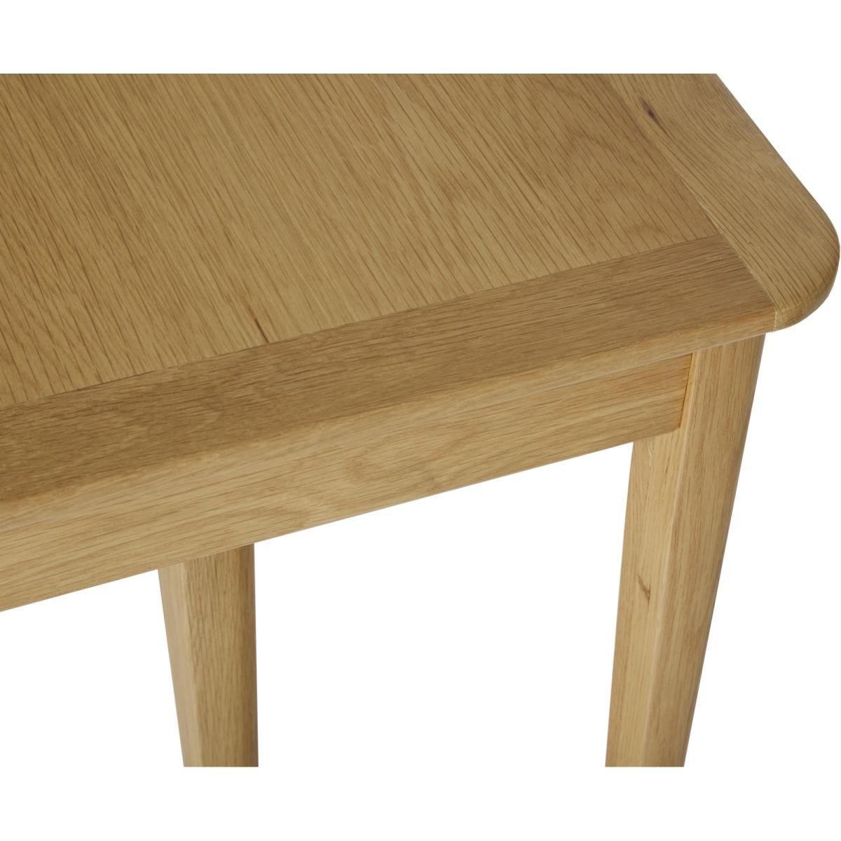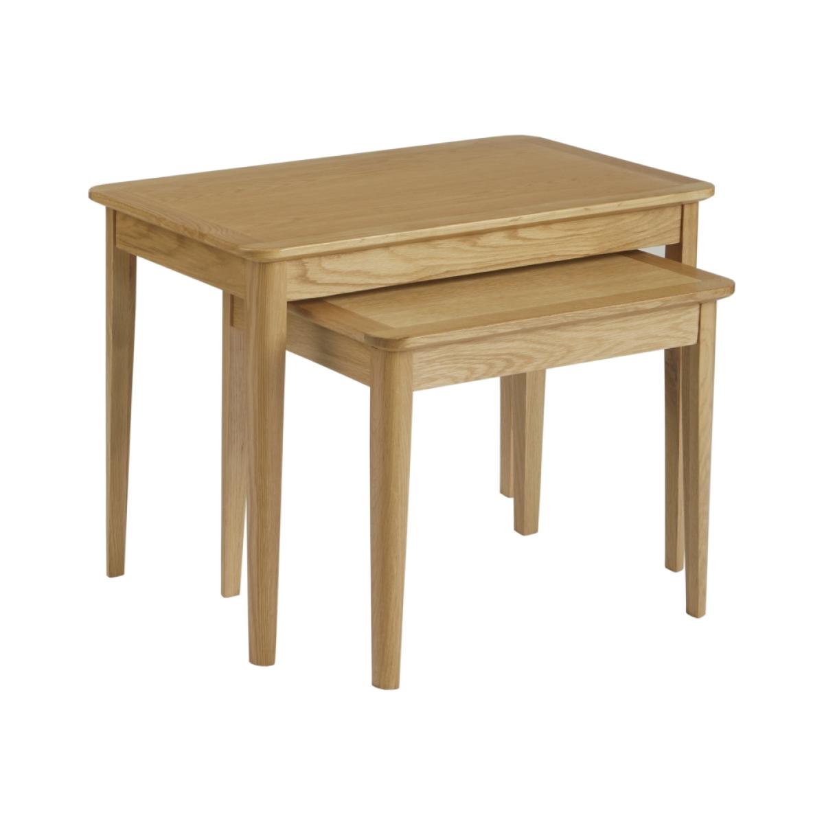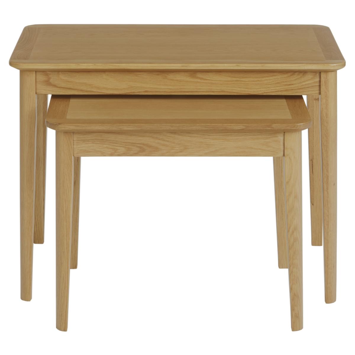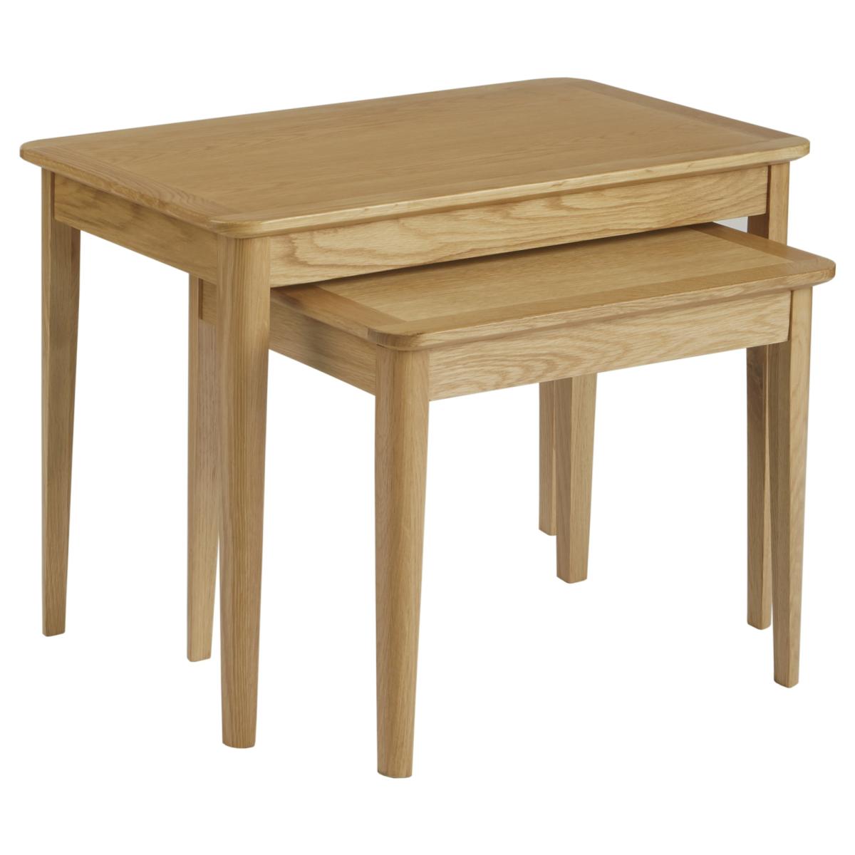 The Hardwick Oak Nest of Tables is a sturdy, high-quality set that will make an excellent addition to your living room. Crafted from high-quality solid oak with a pale oak finish, these tables are perfect for providing extra space for serving dinner and snacks. They conveniently slide underneath each other to save space in your home.  Features: Oak Wood & Veneer Pale Oak Finish Matching furniture available Easy to clean Assembly required Dimensions: Width: 69cm Depth: 42cm Height: 50cm All screens vary in colour reproduction and whilst every effort has been made to display the colour as accurately as possible it is for guidance only