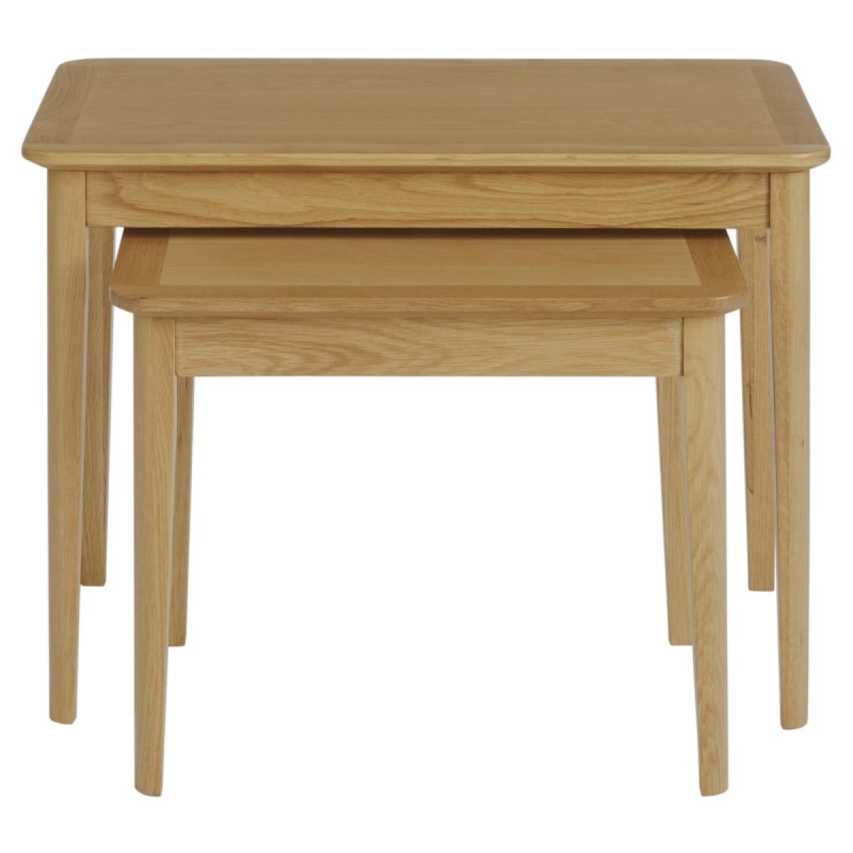 I’m a fan of this simple oak nest for its clean lines and warm, pale grain - it slots effortlessly into Scandi, coastal or modern-rural schemes and makes a great side or occasional table when floor space is at a premium. The slim legs and compact proportions mean it tucks neatly alongside a sofa or armchair without getting in the way. For styling, keep the smaller table tucked under for a streamlined look, then pull it out when you need extra surface. Top the larger one with a minimalist tray and candle, and use the lower table for a small stack of art books or a little plant - the light oak finish looks great against soft greys, blues or muted earth tones.