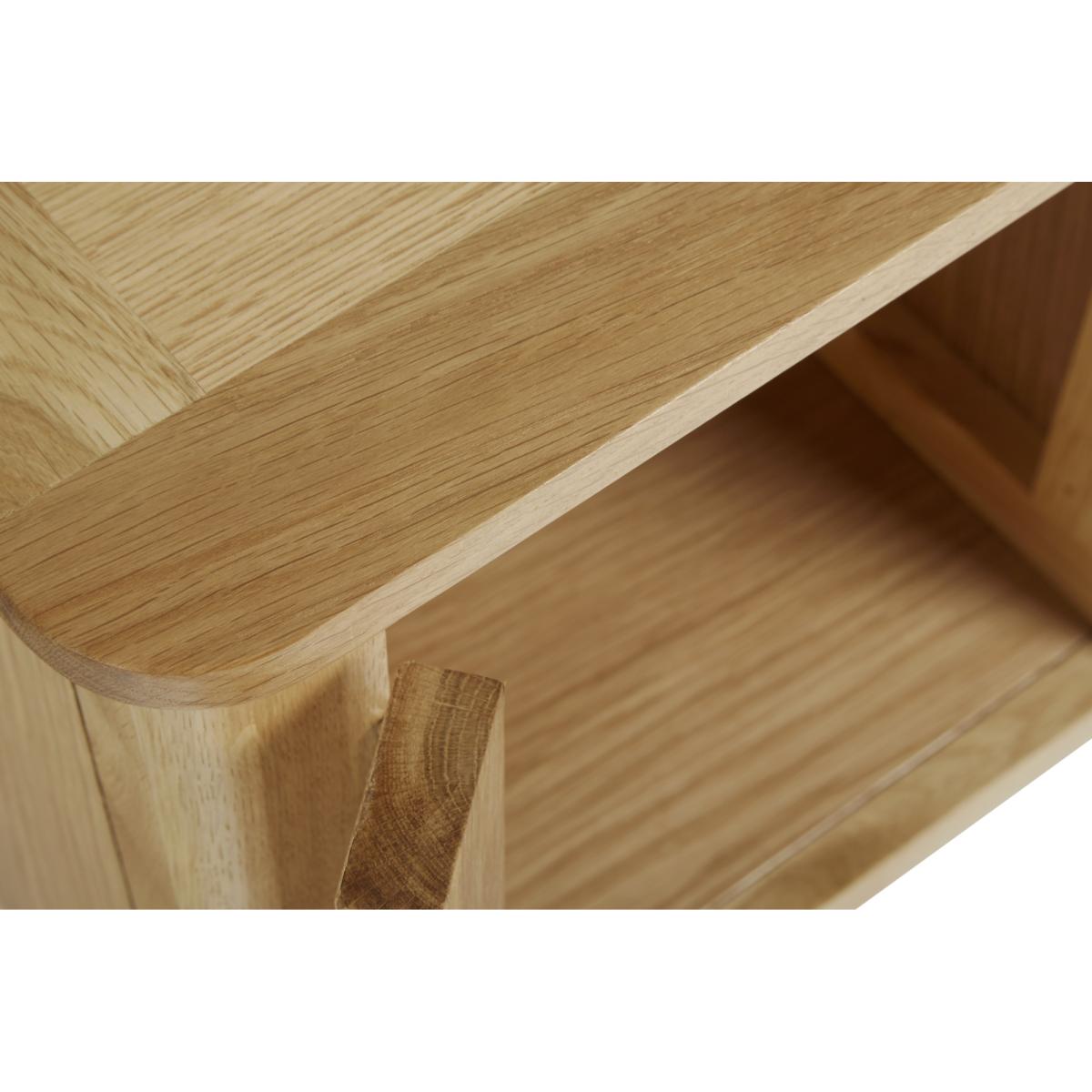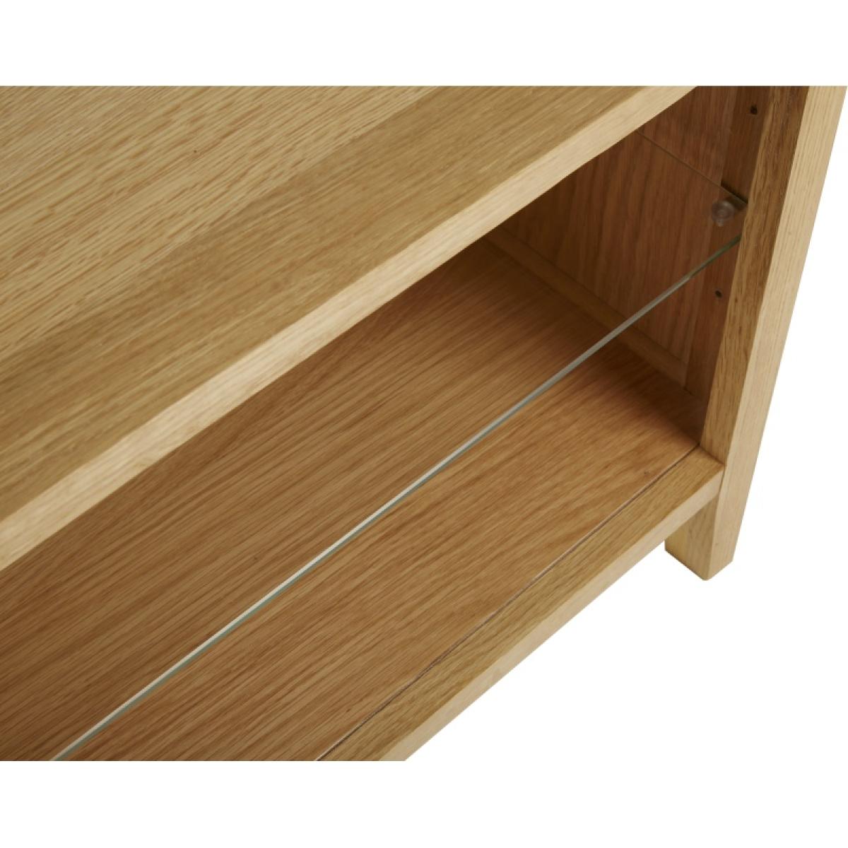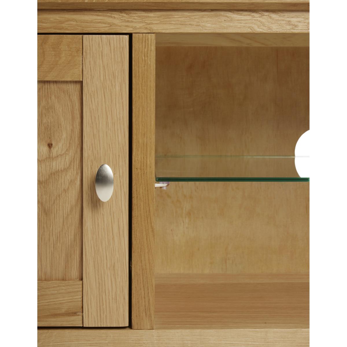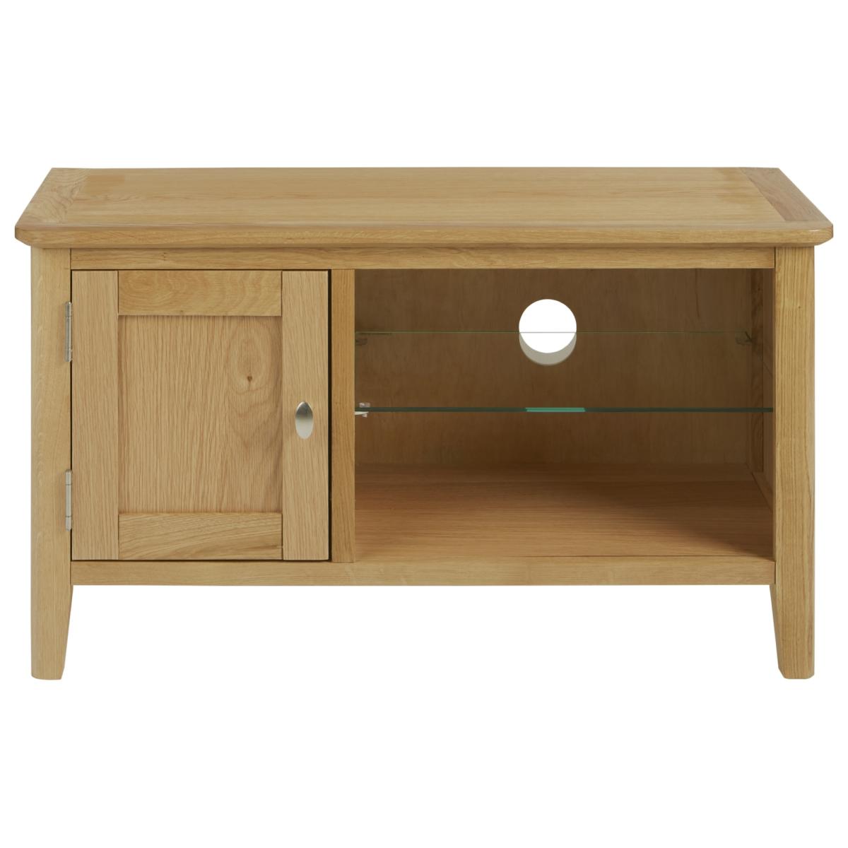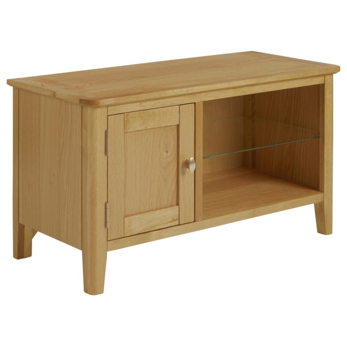 The Hardwick Oak Small Media Unit will proudly host your entertainment equipment and fit perfectly in your living room. This Small TV Unit is crafted from solid oak material with pale oak finish and satin silver handles. The curved corners and tapered legs add to the beauty of the range. The central glass shelf space and small cupboard makes the perfect place to house your DVD and games console. This Small TV Unit can be placed in the living room or bedroom to give you a better viewing position for the television. Features: Oak Wood & Veneer Pale Oak Finish Satin Silver Handles Matching furniture available Easy to clean Assembly required Dimensions: Width: 120cm Depth: 40cm Height: 50cm All screens vary in colour reproduction and whilst every effort has been made to display the colour as accurately as possible it is for guidance only