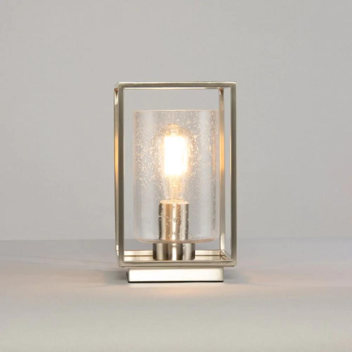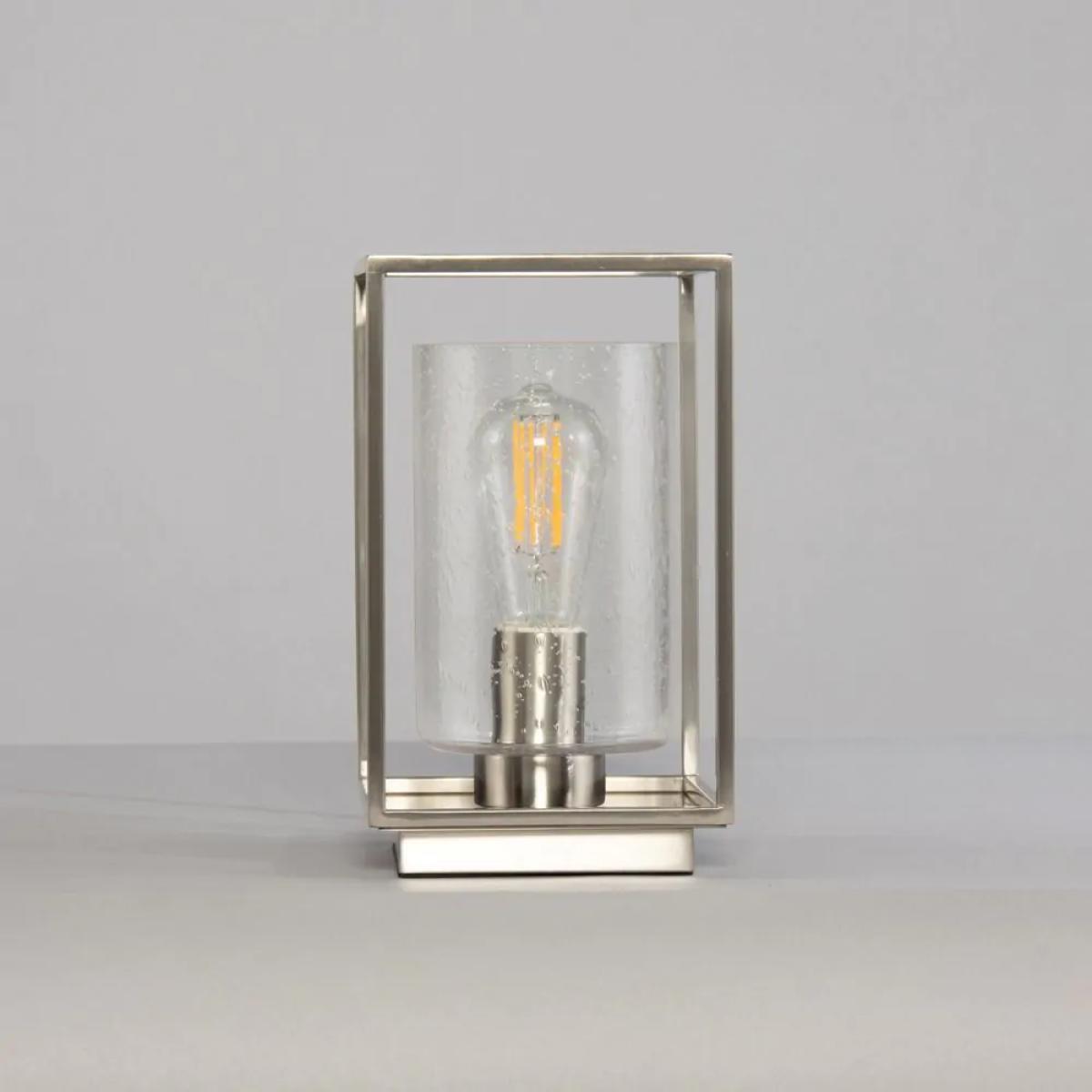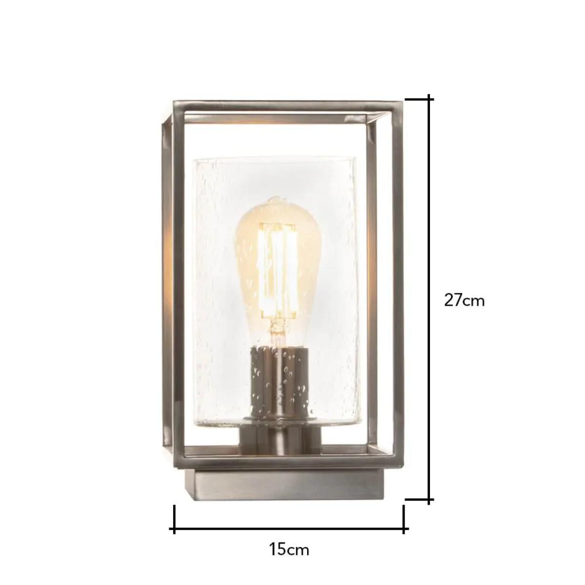 Minimalist style accent lighting for your decor with the Hardy Cage Table Lamp with Bubble Glass Shade. This table light comes in a sleek satin nickel finish for a stylish sheen to your decor that looks ideal in urban interiors. It also features a box frame design with a glass cylindrical shade within, ideal for pairing with a separately sold vintage filament light bulb for the perfect bedside table or sideboard lamp.