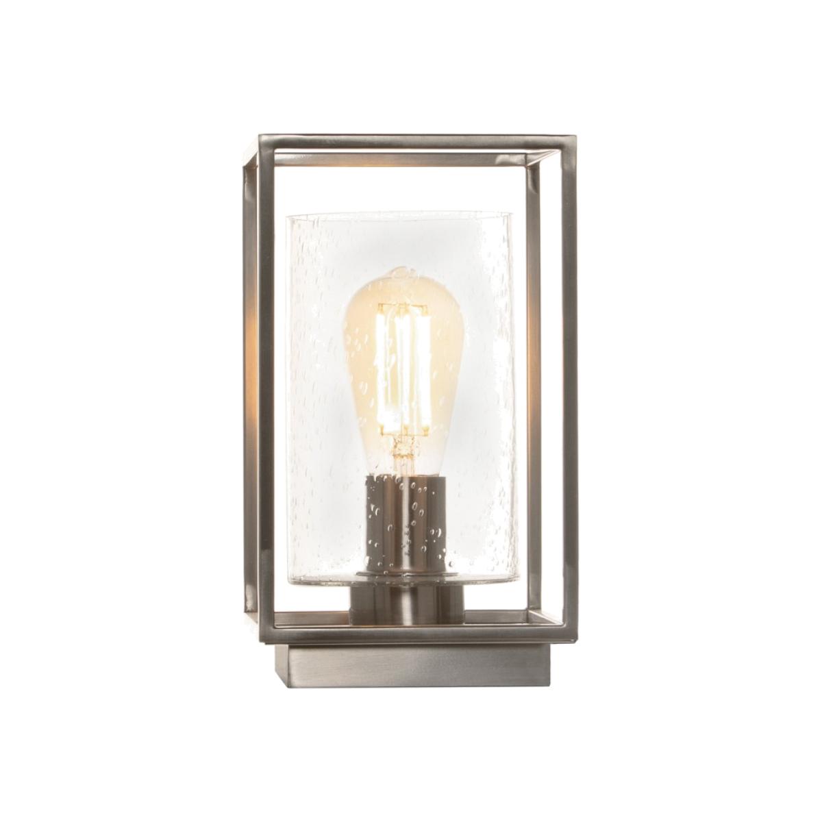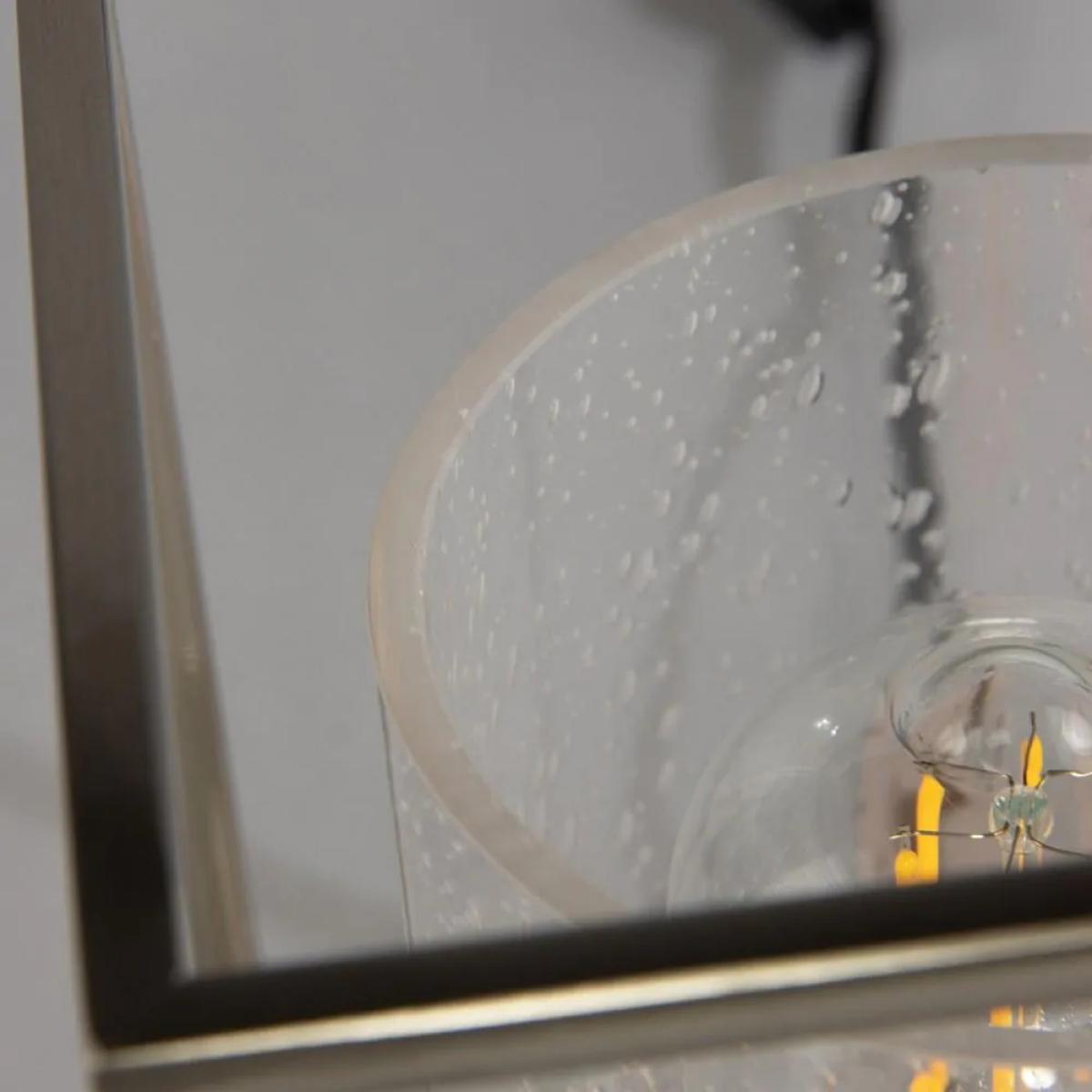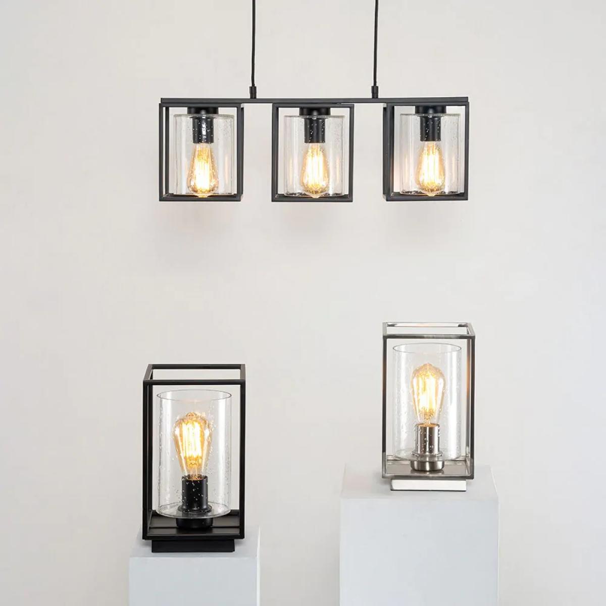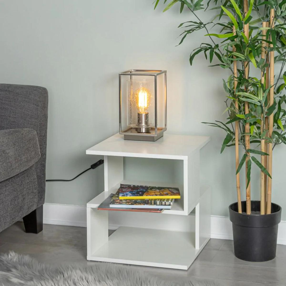Minimalist style accent lighting for your decor with the Hardy Cage Table Lamp with Bubble Glass Shade. This table light comes in a sleek satin nickel finish for a stylish sheen to your decor that looks ideal in urban interiors. It also features a box frame design with a glass cylindrical shade within, ideal for pairing with a separately sold vintage filament light bulb for the perfect bedside table or sideboard lamp.
